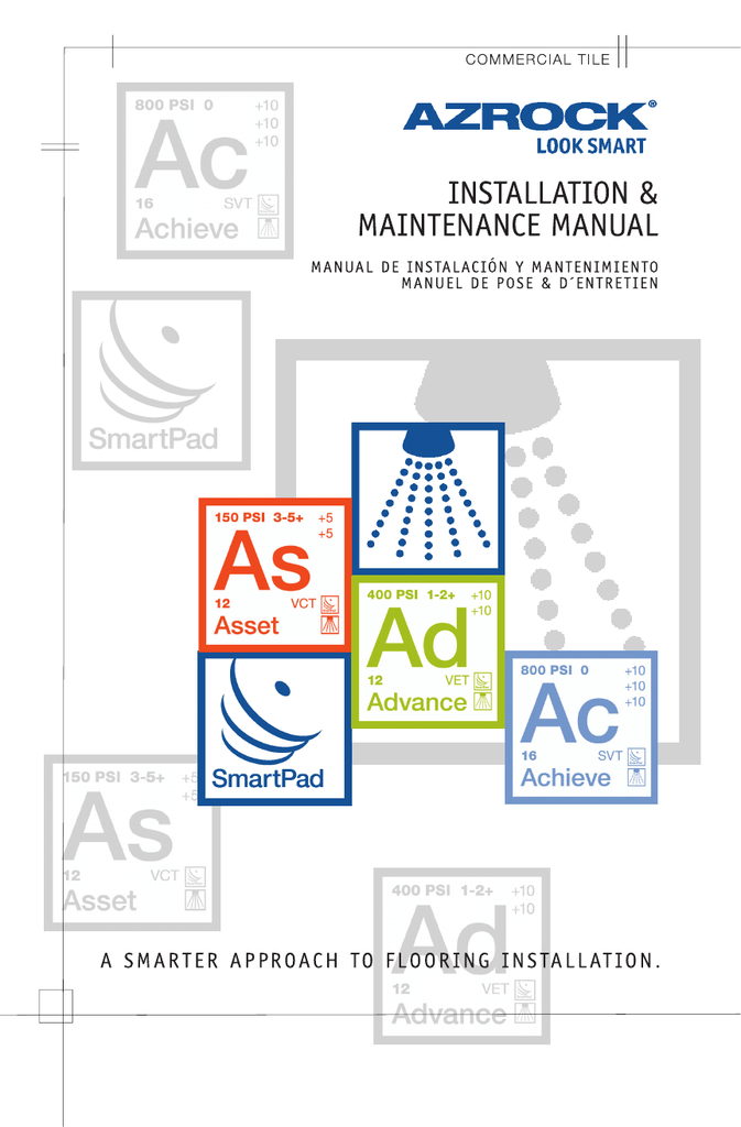 IMPORTANT NOTICE Safety is everyone’s responsibility. Warnings and instructions set forth in this manual and incorporated on Tarkett® resilient flooring accessory labels should be strictly followed. When adhesives or other materials are to be used in the workplace obtain these products’ Material Safety Data Sheets from their supplier. ! WARNING WARNING REGARDING COMPLETE REMOVAL OF EXISTING RESILIENT FLOORING AND ADHESIVE Some existing resilient flooring and solvent-based cutback asphalt adhesives may contain asbestos fibers that are not readily identifiable. Do not sand, dry scrape, bead blast or mechanically pulverize existing resilient flooring, backing or lining felt. Do not use power devices when removing existing flooring or asphalt adhesives. The inhalation of asbestos dust may cause asbestosis or other serious bodily harm. Smoking greatly increases these risks. EMERGENCY RESPONSE Tarkett® For adhesives, underlayment and maintenance products the 24 hour medical and DCT emergency response communications and for information on hazardous materials within these products call: IN USA: 1-800-228-5635-Extension 079 IN CANADA: 1-613-996-6666 NOTICE Various federal, state and local government agencies have regulations covering the removal of asbestos-containing material. If you are considering the removal of resilient floor covering that contains, or is assumed to contain, asbestos, you should determine if these regulations apply. The Resilient Floor Covering Institute Recommended Work Practices are designed to comply with the federal occupational asbestos exposure limits. Many local regulations have additional restrictions over that required by federal agencies. The need to follow these regulations should be determined prior to removal of any possible asbestos containing material. Individual copies of the Resilient Floor Covering Institute Work Practices are available free of charge by writing: Resilient Floor Covering Institute 401 East Jefferson Street, Suite 102 OR Rockville, MD 20850 Telephone: 301-340-8580 Fax: 301-340-7283 Tarkett Commercial Tile Installation Services Dept. P.O. Box 2467 Houston, Texas 77252 NOTE: This manual supercedes all prior year Azrock brand Installation Manuals. Azrock® is a brand of Tarkett Inc., U.S.A. and used under license. SAFETY INSTRUCTIONS . . . . . . . . . . . . . . . . . . . . . . . . . . . . . . . . . . . . . . . . . . . . . . . . . . . . i ADHESIVE REFERENCE CHART . . . . . . . . . . . . . . . . . . . . . . . . . . . . . . . . . . . . . . . . . . . . . . ii GENERAL INSTRUCTIONS . . . . . . . . . . . . . . . . . . . . . . . . . . . . . . . . . . . . . . . . . . . . . . . . . iii CONDITIONS REQUIRED FOR INSTALLATION . . . . . . . . . . . . . . . . . . . . . . . . . . . . . . . . iv TOOL LIST . . . . . . . . . . . . . . . . . . . . . . . . . . . . . . . . . . . . . . . . . . . . . . . . . . . . . . . . . . . . . . . . v SECTION 1 - SUBFLOORS AND UNDERLAYMENTS . . . . . . . . . . . . . . . . . . . . . . . . . . . 1 A. CONCRETE SUBFLOORS . . . . . . . . . . . . . . . . . . . . . . . . . . . . . . . . . . . . . . . . . . . . 2 B. WOOD SUBFLOORS . . . . . . . . . . . . . . . . . . . . . . . . . . . . . . . . . . . . . . . . . . . . . . . 8 C. OTHER TYPES . . . . . . . . . . . . . . . . . . . . . . . . . . . . . . . . . . . . . . . . . . . . . . . . . . . . 12 D. EXISTING RESILIENT FLOORS . . . . . . . . . . . . . . . . . . . . . . . . . . . . . . . . . . . . . . . 12 E. SURFACE PREPARATION . . . . . . . . . . . . . . . . . . . . . . . . . . . . . . . . . . . . . . . . . . . . 15 SECTION 2 - ADHESIVES . . . . . . . . . . . . . . . . . . . . . . . . . . . . . . . . . . . . . . . . . . . . . . . . . 16 TARKETT ADHESIVES . . . . . . . . . . . . . . . . . . . . . . . . . . . . . . . . . . . . . . . . . . . . . . . . . 18 SPRAY SMART ADHESIVES . . . . . . . . . . . . . . . . . . . . . . . . . . . . . . . . . . . . . . . . . . . . 19 SECTION 3 - INDIVIDUAL PRODUCT CATEGORIES & INSTALLATION SYSTEMS . . 31 VINYL COMPOSITION TILE . . . . . . . . . . . . . . . . . . . . . . . . . . . . . . . . . . . . . . . . . . . 32 CONVENTIONAL SMOOTH SURFACE . . . . . . . . . . . . . . . . . . . . . . . . . . . . . . . . . 35 SLIP RESISTANT SURFACE . . . . . . . . . . . . . . . . . . . . . . . . . . . . . . . . . . . . . . . . . . . . . 36 VINYL ENHANCED TILE . . . . . . . . . . . . . . . . . . . . . . . . . . . . . . . . . . . . . . . . . . . . . . 38 SOLID VINYL TILE . . . . . . . . . . . . . . . . . . . . . . . . . . . . . . . . . . . . . . . . . . . . . . . . . . . . 41 SECTION 4 - LAYOUT & FITTING . . . . . . . . . . . . . . . . . . . . . . . . . . . . . . . . . . . . . . . . . 44 RESILIENT TILE . . . . . . . . . . . . . . . . . . . . . . . . . . . . . . . . . . . . . . . . . . . . . . . . . . . . . . 44 BASKETBALL COURT . . . . . . . . . . . . . . . . . . . . . . . . . . . . . . . . . . . . . . . . . . . . . . . . . 51 INDEX TABLE OF CONTENTS INDEX SECTION 5 - REPAIRS . . . . . . . . . . . . . . . . . . . . . . . . . . . . . . . . . . . . . . . . . . . . . . . . . . . . 52 SECTION 6 - FINISHING THE INSTALLATION . . . . . . . . . . . . . . . . . . . . . . . . . . . . . . . 54 SECTION 7 - MAINTENANCE . . . . . . . . . . . . . . . . . . . . . . . . . . . . . . . . . . . . . . . . . . . . 58 TARKETT SMART PADS . . . . . . . . . . . . . . . . . . . . . . . . . . . . . . . . . . . . . . . . . . . . . . . . 68 VINYL COMPOSITION TILE . . . . . . . . . . . . . . . . . . . . . . . . . . . . . . . . . . . . . . . . . . . 75 SLIP RESISTANT TILE . . . . . . . . . . . . . . . . . . . . . . . . . . . . . . . . . . . . . . . . . . . . . . . . . . 76 VINYL ENHANCED TILE . . . . . . . . . . . . . . . . . . . . . . . . . . . . . . . . . . . . . . . . . . . . . 77 SOLID VINYL TILE . . . . . . . . . . . . . . . . . . . . . . . . . . . . . . . . . . . . . . . . . . . . . . . . . . . 77 SECTION 8 - TRAINING . . . . . . . . . . . . . . . . . . . . . . . . . . . . . . . . . . . . . . . . .