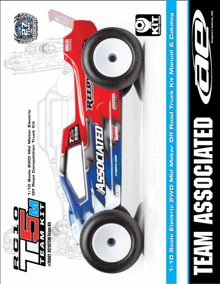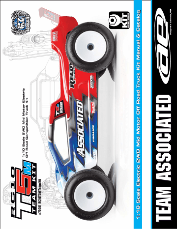 2 :: Introduction Thank you for purchasing this Team Associated product. This assembly manual contains instructions and tips for building and maintaining your new RC10T5M Team Kit. Please take a moment to read through this manual to help familiarize yourself with these steps. We are continually changing and improving our designs; therefore, actual parts may appear slightly different than in the illustrations. New parts will be noted on supplementary sheets located in the appropriate parts bags. Check each bag for these sheets before you start to build. :: KIT Features Features in the RC10T5M Team Kit: ! ! road tracks "#""" $% $% &$$'(( ) *# + - - // -2/ / differential for increased life and torque capacity / 3/ 46$78*8 9 7< /= == /- = = > 3 # > ? > / /= @/ = !/ 3 B ==//> / / / D = = 3/ :: Additional Your new T5M Team Kit comes unassembled and requires the following items for completion 4 6E ? D == ! / 4G*$ 6 H % -H%4G$I2-G$I2*-G$J-G$J6 % 4G$ILL-G$ILJ6? 9 -! /== ? ( = 4 -O9/ 6 $ O9/ =4G*-*2-*J-L$-J*J-J*Q6 O > = == 4G7IJ6 4G7IL6 S -@ Tools included: "7-$" G*$% < :: Other Helpful Items % %@4 6 (=%4H9GJ*J6 ?B 9 U B//=V @B >U 4H9GL776 9 <4H9GJ2I26 % S 9 X % / 4H9G76 Associated Electrics, Inc. 26021 Commercentre Dr. Lake Forest, CA 92630 Customer Service Tel: 949.544.7500 Fax: 949.544.7501 http://www.TeamAssociated.com · http://www.RC10.com · http://twitter.com/Team_Associated · http://bit.ly/AEonFacebook 3 :: Hardware - 1:1 Scale View Button Head (bhcs) Flat Head (fhcs) 2x4mm (31510) Aluminum (8545) Ball Bearings 3x8mm (25201) Aluminum (8553) Titanium (91592) 3x7x3mm (91475) 2.5x6mm (31520) 5x8mm (31400) 2.5x8mm (31521) 3x10mm (25202) Aluminum (8555) Titanium (91593) 5x10x4mm (25237) 3x12mm (25203) Aluminum (8556) Titanium (91594) 6x13x5 (91476) 3x4mm (91158) 3x5mm (31530) 3x6mm (31531) Aluminum (8550) Titanium (91580) 3x14mm (89208) Aluminum (8567) Titanium (91595) 3x8mm (31532) Aluminum (8552) Titanium (91581) 10x15x4 (25616) 3x16mm (25204) Titanium (91596) 3x18mm (89209) Titanium (91597) 3x10mm (25211) Aluminum (8554) Titanium (91582) 3x12mm (89202) Titanium (91583) HD 4mm (91451) Ti Nitride HD 4mm (91452) Set Screws 3x3mm (25225) 3x14mm (25187) Titanium (91584) 3x16mm (89203) Titanium (91585) 3x8mm (4670) 3x16mm (4689) Shims and Washers Servo Mount Washer (7337) (.250 x .125 x .815) FT Ballstud Washer, Aluminum (1mm and 2mm, 4 each) (31286) 3x24mm (89204) Titanium (91589) 3x30mm (91478) Diff Balls 5/64 Diff Thrust Balls (6574) Cap Head (shcs) 3/32 Carbide Diff Balls (6581) 3/32 Ceramic Diff Balls (6584) 1.6 x 5mm (91611) 2.5 x 8mm (89222) HD 8mm (91048) Ti Nitride HD 8mm (91119) HD 12mm (91050) Ti Nitride HD 12mm (91121) Nuts (lock/plain) M3 Nut (91477) M3 Alum. Locknut, Blue (31550) M3 Locknut, Black (25215 M3 Locknut w/Flange (25612) FT 3mm Locknuts, Blue(25392) M4 Locknut w/Flange (91148) FT M4 Locknuts w/Flange, Blue (31551) Clips E-clip 1/8 (6299) Notes: HD 6mm (91047) Ti Nitride HD 6mm (91118) HD 10mm (91049) Ti Nitride HD 10mm (91120) 3x18mm (2308) 3x22mm (25189) Titanium (91588) Ballstuds 4 :: Table of Contents 1................... Cover 12 - 13........Turnbuckles Build (Bag H) 2................... Introduction 3...................1:1 Hardware “Fold Out” 4................... Table of Contents 5 - 6..............Front Top Plate and Steering Build (Bag A-AA) 6 - 7..............Front Arms and Uprights Build (Bag B) 13 - 15........ Shocks Build (Bag I-II) 15 - 17........Electronics Build (Bag J) 17 - 18.........Wheels, Tires, and Body Build (Bag K) 19 - 21....... Tuning Tips 22 - 30....... Catalog 7 - 8..............Shock Towers and Rear Chassis Brace Build (Bag C) 31................ Notes / Contact Info 32................ Setup Sheet “Kit Setup” 9................... Differential Build (Bag D-DD) 10.................Gearbox Build (Bag E) 33................ Setup Sheet “Blank” 34................ Back Cover 10 - 11.........Slipper Build (Bag F-FF) 11 - 12.........Rear Hub and CVA Build (Bag G-GG) :: Notes ! This symbol indicates a special note or instruction in the manual. This symbol indicates a Racers Tip. Scanning this QR code will take you to Team Associated’s Tech Tips videos. These videos will help you with your build and setup! Associated Electrics, Inc. 26021 Commercentre Dr. Lake Forest, CA 92630 There is a 1:1 hardware foldout page in the front of the manual. To check the size of a part, line up your hardware with the correct drawing until you find the exact size. Each part in the foldout has a number assigned to it for ordering replacement parts. Customer Service Tel: 949.544.7500 Fax: 949.544.7501 http://www.TeamAssociated.com · http://www.RC10.com · http://twitter.com/Team_Associated · http://bit.ly/AEonFacebook 5 1/15 :: Front Top Plate and Steering Build - Bag A - AA - Step 1 91048 x2 Heavy-duty Ballstud, 8mm 5407 x2 Red O-Ring 91475 x4 3x7x3 Ball Bearing 91391 Steering Bellcrank Brace 91047 Heavy-duty Ballstud, 6mm 91391 Steering Rack 89202 x2 M3 x 12mm BHCS ! Note orientation of steering rack. 31286 x2 FT Ballstud Washer, aluminum (2mm) ! Do not overtighten steering bolts. Make sure there is free movement in the steering rack. :: Front Top Plate and Steering Build - Bag A - AA - Step 2 ! Note orientation of the brace. 91475 x4 3x7x3 Ball Bearing 91362 B5 Top Plate 91391 Steering Bellcrank Brace 25189 x2 M3 x 22mm BHCS :: Front Top Plate and Steering Build - Bag A - AA - Step 3 25202 x4 M3 x 10mm FHCS ! 91512 RC10B5M Front Chassis Plate 25202 x5 M3 x 10mm FHCS 71002 RC10T5M Chassis Cradle 71000 RC10T5M Chassis Remove any flashing material from part #91512 to ensure a smooth fit to part #71002. 25201 x6 M3 x 8mm FHCS 6 :: Front Top Plate and Steering Build - Bag A - AA - Step 4 91364 Bulkhead (25 °) 25202 x2 M3 x 10mm FHCS ! There are two bulkheads included (25 °, 30 °). 25 ° is the standard one used. 25204 x2 M3 x 16mm FHCS :: Front Arms and Uprights Build - Bag B - Step 1 31530 M3 x 5mm BHCS 91047 Heavy-duty Ballstud, 6mm 96 #15 lock ad e r th 914