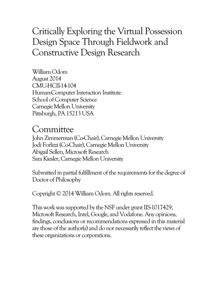 Critically Exploring the Virtual Possession Design Space Through Fieldwork and Constructive Design Research William Odom August 2014 CMU-HCII-14-104 Human-Computer Interaction Institute School of Computer Science Carnegie Mellon University Pittsburgh, PA 15213 USA Committee John Zimmerman (Co-Chair), Carnegie Mellon University Jodi Forlizzi (Co-Chair), Carnegie Mellon University Abigail Sellen, Microsoft Research Sara Kiesler, Carnegie Mellon University Submitted in partial fulfillment of the requirements for the degree of Doctor of Philosophy Copyright © 2014 William Odom. All rights reserved. This work was supported by the NSF under grant IIS-1017429, Microsoft Research, Intel, Google, and Vodafone. Any opinions, findings, conclusions or recommendations expressed in this material are those of the author(s) and do not necessarily reflect the views of these organizations or corporations. Keywords Human-Computer Interaction, Interaction Design, Research through Design, Constructive Design Research, Virtual Possessions, Slow Technology, User Enactments William Odom Ph.D. Dissertation 2 Abstract Many disciplines have investigated how people modify and form attachments to their material possessions. Much of this work explores how material possessions play fundamental roles in supporting people’s practices to construct a sense of who they were and who they want to become, as well as to give order to the intimate environments in which these experiences unfold. As interactive technologies continue to become woven into the fabric of everyday life, people’s practices have expanded and today they are amassing ever-larger and more diverse collections of virtual possessions. Virtual possessions include former material things that are becoming immaterial (e.g., books, music, photos, tickets); things that never had a lasting material form (e.g., electronic message archives, social networking profiles); and also metadata traces that document people’s interactions with digital devices and services (e.g., photo location information, music play histories, automatic and manual photo tags). The convergence of social, mobile and cloud computing services has created new opportunities for people to carry, access, create and curate their virtual possessions across environments throughout the world. Over the past several years, the HCI community has begun to explore the intersection of virtual possessions with people’s everyday lives. This nascent body of work has largely focused on understanding and building tools to support people’s values and practices surrounding particular virtual things (e.g., photo collections, video, text messages). However, to date virtual possessions remain difficult to characterize, and little is known about what they are, and what they could—or should—be in the future. This dissertation offers two core contributions to explore virtual possessions as a research topic for the HCI community. First, I propose virtual possessions as a class of artifacts for the HCI community to investigate. To do this, I draw on findings from qualitative field studies I have conducted with populations in several sites around the world that investigated people’s perceptions of and relationships with their virtual possessions—how they become mundane parts of everyday life, how they are drawn on as resources for self-reflection and self-presentation, unexpected workarounds people devise to get a better ‘grasp’ on them, and, in some cases, how they become extraordinary. From this backdrop, In chapter 9 I synthesize and reflect on findings across these studies to take a step toward unpacking how virtual possessions differ from material things, and articulate key factors shaping how virtual possessions are experienced; namely, placelessness, spacelessness, and formlessness. Beyond solely articulating these qualities, this chapter frames and structures an agenda for future research and practice initiatives in the HCI and interaction design communities. The second contribution of this thesis is knowledge on how virtual possessions can be represented in radically different and potentially more valuable forms. To do this, William Odom Ph.D. Dissertation 3 I draw on several studies I conducted of design artifacts, environments and prototypes that, in different ways, explore new forms and behaviors of virtual possessions, and the potential technological futures they represent. This corpus of research illustrates how the HCI community can move beyond studies of people’s current practices toward making radical conceptual leaps that provocatively engage users in dialogues about the largely uncharted and unstructured virtual possession design space. Building on findings from my earlier fieldwork and design-oriented studies, on chapter 8, I describe the design, implementation and long-term field study of the Photobox, a technology probe that in part aims to open up value construction activities with people’s Flickr photo archives. Collectively, these two contributions provide substantial new knowledge into understanding (i) what virtual possessions are as a class of artifacts and factors shaping people’s experiences with them and (ii) how the form, presentation and behavior of virtual possessions can be radically transformed to open up new and potentially more meaningful interactions with them in the future. William Odom Ph.D. Dissertation 4 Acknowledgements The support and encouragement from many colleagues and friends is what made this dissertation possible. I would like to acknowledge my advisors and dissertation co-chairs John Zimmerman and Jodi Forlizzi, both of whom I am grateful for their thoughts and scholarship over the years and, albeit begrudgingly, accepting to have a student advised solely by Design faculty members. Next, my committee member Abigail Sellen, whom has and continues to be a major influence, colleague, mentor, and inspiration; you have greatly shaped the research in t