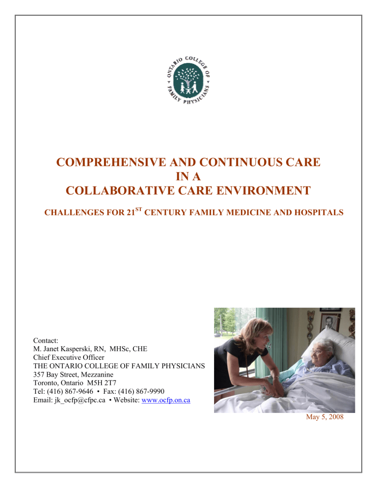 Comprehensive and Continuous Care in a Collaborative Team Environment: Challenges for the 21st Century in Family Medicine and for Hospitals ____________________________________________________________________________________________________________ COMPREHENSIVE AND CONTINUOUS CARE IN A COLLABORATIVE CARE ENVIRONMENT CHALLENGES FOR 21ST CENTURY FAMILY MEDICINE AND HOSPITALS Contact: M. Janet Kasperski, RN, MHSc, CHE Chief Executive Officer THE ONTARIO COLLEGE OF FAMILY PHYSICIANS 357 Bay Street, Mezzanine Toronto, Ontario M5H 2T7 Tel: (416) 867-9646 • Fax: (416) 867-9990 Email: [email protected] • Website: www.ocfp.on.ca May 5, 2008 Comprehensive and Continuous Care in a Collaborative Team Environment: -1Challenges for the 21st Century in Family Medicine and for Hospitals ____________________________________________________________________________________________________________ INDEX 1.0 Key Facts...................................................................................................................................3 2.0 Introduction... ..........................................................................................................................6 3.0 Challenges and Potential Solutions ......................................................................................10 3.1 Hospital Based Respect for Family Physicians ...............................................................10 3.2 Respect from Other Members of the Medical Staff.........................................................10 3.3 Admission and Discharge Policies ....................................................................................10 3.4 The Hospitalist Model – anchored in Family Medicine or Focused Scopes of Practice ..........................................................................................................................11 3.5 Emergency Department and Obstetrics ...........................................................................12 3.6 Hospital Restructuring and Re-engineering/Hospital Mergers......................................13 3.7 Workload Implications ......................................................................................................13 3.8 Remuneration for Hospital-Based Care ..........................................................................14 3.9 Training for Medical Students, Family Medicine Residents and CPD for Practicing Family Physicians ...........................................................................................14 4.0 Major Strategies to Engage in Hospital-Based Care ..........................................................15 5.0 Summary ................................................................................................................................17 6.0 Appendix Listening to the Voices of Family Physicians .....................................................................18 7.0 Key Papers on Continuity of Care ......................................................................................24 Comprehensive and Continuous Care in a Collaborative Team Environment: -2Challenges for the 21st Century in Family Medicine and for Hospitals ____________________________________________________________________________________________________________ Family physicians are ribbons that tie everything together. We walk through The health and life journey with our patients from birth to death. Dr. L. P. Comprehensive and Continuous Care in a Collaborative Team Environment: -3Challenges for the 21st Century in Family Medicine and for Hospitals ____________________________________________________________________________________________________________ 1.0 Key Facts 1. 2003 CFPC conducted a Decima Poll • 81% of Canadians rated their family physicians participation in their hospital care as important • 97% believed it was important that a discharge summary be sent to their family doctor • 93% of patients cared for by their family physicians while in hospital were satisfied with their care 2. National Physician Survey • 2004 – 35% of physician practice time was spent in hospital-based activities nationally compared with 33% in Ontario 2007 – 43% of physicians nationally provided inpatient care compared with 33% in Ontario. • 3. Commonwealth Fund 2005 (Report on Canadian Physicians based on the six country survey) • • • • • • • • • • 95% of family doctors report that they often or sometimes experience long wait times for their patients to see a consultant 80% report long wait times for diagnostic tests 94% report long wait time for selective surgical procedures or hospital care 79% report difficulties getting appropriate home care when needed 95% of family doctors have patients in their practices with multiple chronic problems. Only 55% of them feel well-prepared to provide optimum care 89% have patients with mental health problems and only 40% feel well-prepared to provide optimum care 69% have palliative care patients and only 33% feel well-prepared to provide optimum care 46% of family doctors report that their patients experience problems because care was not well coordinated across multiple sites or providers Only 3% report that they receive a discharge report in less than 48 hours when their patient is discharged from hospital. 16% report waiting more than 30 days and 9% report that they rarely receive a report. 40% report having patients who acquired an infection while in hospital. 4. Cancer Quality Council of Ontario Findings from focus groups, comprised of cancer patients, conducted summer 2007 by the Cancer Quality Council of Ontario, included: - Very little interaction with family physician after referral to specialist - It was unclear who was responsible for communicating results to them - Test results not always available at family physician visit; test results go missing so patients carried copies of records/test results from one healthcare profe