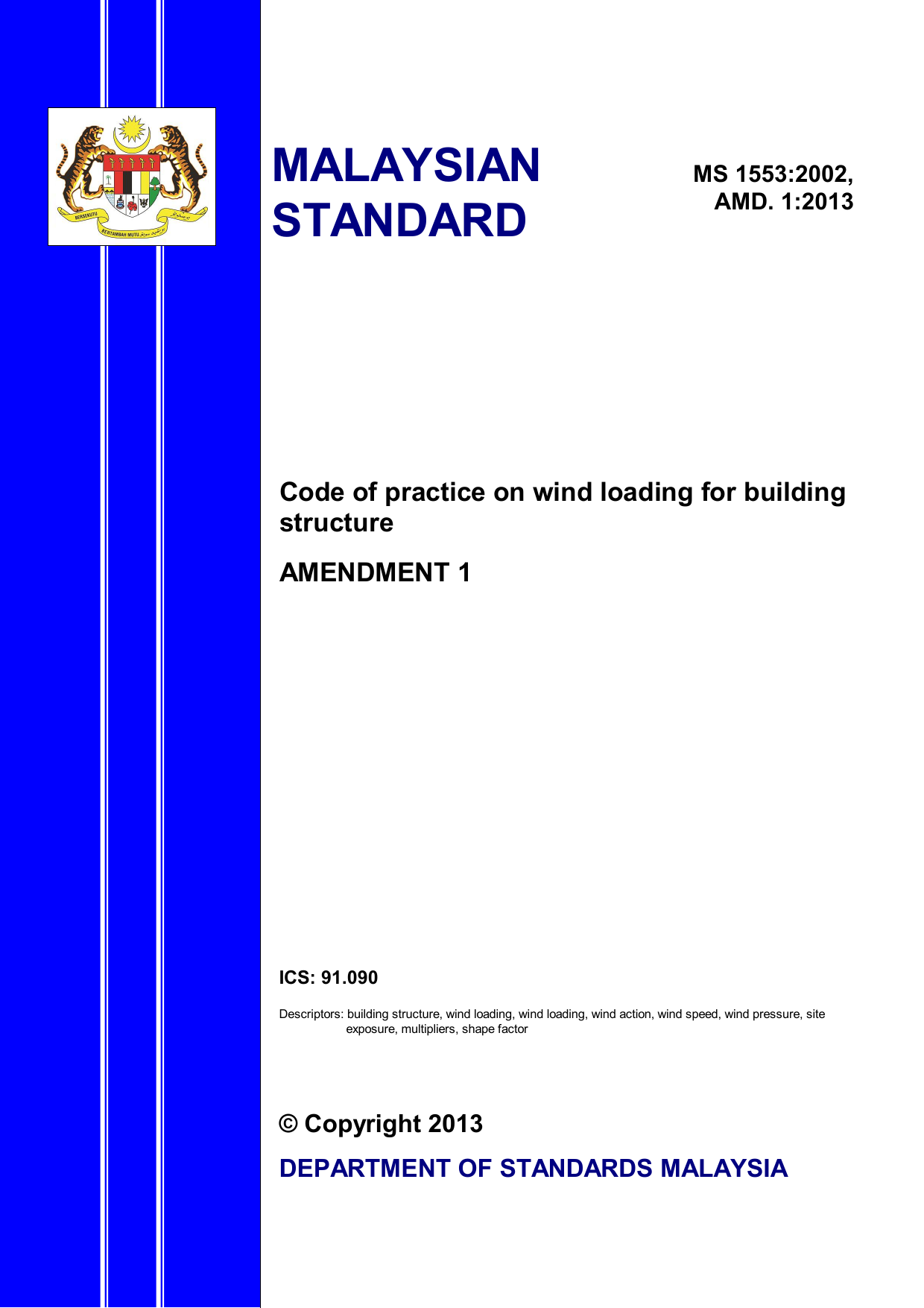 MALAYSIAN STANDARD MS 1553:2002, AMD. 1:2013 Code of practice on wind loading for building structure AMENDMENT 1 ICS: 91.090 Descriptors: building structure, wind loading, wind loading, wind action, wind speed, wind pressure, site exposure, multipliers, shape factor © Copyright 2013 DEPARTMENT OF STANDARDS MALAYSIA MS 1553:2002, AMD. 1:2013 AMENDMENT OF MALAYSIAN STANDARD MALAYSIAN STANDARD MS 1553: 2002 CODE OF PRACTICE ON WIND LOADING FOR BUILDING STRUCTURE (1) Scope, page 1 To add new criteria, to be read as follows: d) Where structures have natural frequencies less than 1Hz section requires dynamic analysis to be carried out (see section 6). e) Further advice should be sought for geometrics not described in this standard such as roofs of podiums below tall building. (2) Subclause 1.7 Notation, page 12 To add new notation as follows: a (3) angle of deviation of the wind stream from the line joining the Centre of the tower cross section to the Centre of the ancillary. Subclause 1.7 Notation, page 13, To replace air density of air from 1.225 kg/m3 to 1.200 kg/m3 and to be read as follows: air (4) density of air which can be taken as 1.200 kg/m3. Subclause 2.4 Design Wind Pressure, page 15 To replace air density of air from 1.225 kg/m3 to 1.200 kg/m3 and to be read as follows: air (5) density of air which can be taken as 1.200 kg/m3. Figure 3.1, page 20 To replace the Figure 3.1 and its caption with new figure, Basic Wind Speed for Peninsular Malaysia (Simplified Procedures) as per attached. MS 1553: 2002 Amd. 1 Page 1 of 8 © STANDARDS MALAYSIA 2013 - All rights reserved MS 1553:2002, AMD. 1:2013 Figure 3.1 Basic Wind Speed for Peninsular Malaysia (Simplified Procedures) (6) Subclause 4.3.2 Buildings providing shielding, page 26, To change 20ht to 20h and “equal to ht “ to “equal to z”. MS 1553: 2002 Amd. 1 Page 2 of 8 © STANDARDS MALAYSIA 2013 - All rights reserved MS 1553:2002, AMD. 1:2013 (7) Figure 4.3, page 28 Replace the Figure 4.3 with the following figure: Figure 4.3 Escarpments (8) Table 5.3 ( b), page 36 To replace the Table 5.3 (b) with the following table, to be read as follows: Roof type and slope Up-wind slope, U 10 External pressure coefficients, Cp,e Ratio h/d 10 15 0.25 -0.7, -0.3 -0.5, 0.0 Roof pitch, degrees * 20 25 30 35 -0.3, 0.2 -0.2, 0.3 -0.2, 0.4 0.0, 0.5 0.5 -0.9, -0.4 -0.7, -0.3 -0.4, 0.0 -0.3, 0.2 -0.2, 0.3 -0.2, 0.4 1.0 -1.3, -0.6 -1.0, -0.5 -0.7, -0.3 -0.5, 0.0 -0.3, 0.2 -0.2, 0.3 MS 1553: 2002 Amd. 1 Page 3 of 8 © STANDARDS MALAYSIA 2013 - All rights reserved 45 0, 0.8sin MS 1553:2002, AMD. 1:2013 (9) Table 5.6, page 39 To replace the Table 5.6 with the following table, to be read as follows: Design case Figure 5.3 reference number h (m) Area, A Proximity to Kl Windward wall WA1 All A 0.25a2 Anywhere 1.25 All other areas - All - - 1.0 RA1 All A a2 <a 1.5 RA2 All A 0.25a2 < 0.5a 2.0 Hips and ridges of roofs RA3 All A a2 <a 1.5 with pitch 10 RA4 All A 0.25a2 < 0.5a 2.0 SA1 25 A a2 <a 1.5 A 0.25a2 < 0.5a 2.0 A 0.25a2 >a 1.5 SA4 A a2 <a 2.0 SA5 A 0.25a2 < 0.5a 3.0 - - 1.0 edge Positive pressures Negative pressures Roof edges Side walls near windward wall edges SA2 SA3 All other areas - > 25 All NOTES: 1. The dimension, a, and the figure reference numbers are defined in Figure 5.3 2. Design cases attracting K l = 1.5 or 2.0 or 3.0 are alternative cases and need not be applied simultaneously. 3. The areas for local pressure factor are not necessarily square. MS 1553: 2002 Amd. 1 Page 4 of 8 © STANDARDS MALAYSIA 2013 - All rights reserved MS 1553:2002, AMD. 1:2013 (10) Figure 5.3, page 40, To replace the ‘h ≤ 25 m’, with ‘h > 25 m’, to be read as follows: h > 25m (11) Subclause 6.2.1, Dynamic response factor, Cdyn, page 44 To replace the spectrum of turbulence, Et formula to: Et = 0.47 N 5 2 N 2 6 MS 1553: 2002 Amd. 1 Page 5 of 8 © STANDARDS MALAYSIA 2013 - All rights reserved MS 1553:2002, AMD. 1:2013 (12) Clause 6.2.2, Peak along wind acceleration for serviceability, page 46 To replace the peak acceleration at the top of a structure in the along wind direction, Ẍmax formula to: 3 mo h 2 (13) SE t C fig , windward 1 2 g v I h air g R I h h V z b z z 2 des (15) z z 0 Clause 6.2.2, Peak along wind acceleration for serviceability, page 46 New air density of air shall be read as 1.200kg/m3. (14) Clause 6.3.2.2 Cross wind force spectrum coefficient, Cfs, page 48 For item a (ii) For turbulence intensity of 0.2 at 2/3h, the new formula should be read as follows: Log10 Cfs = 0.00008Vn4 – 0.0028Vn3 + 0.0199Vn2 + 0.13Vn – 2.985 (15) Clause 6.4 Combination of along wind and cross wind response, page 53. The total combination peak scalar dynamic action effect, t such as an axial load in a column, shall be read as follows: t a ,m (16) a, p a ,m 2 c, p 2 0.5 (23) Appendix A, Table A5. Up-wind slope, page 58. To replace Table A5 with the following table, to be read as follows: Table A5. Up-wind slope Roof type Ratio External pressure coefficients, Cp,e h/d Roof pitch, degrees * and slope Up-wind Slope, U 10 0.25 0.5 10 1.0 15 20 25 30 -0.7, -0.3 -0.5, 0.0 -0.3, 0.2 -0.2, 0.3 -0.2, 0.4 35 45 0.0, 0.5 -0.9, -0.4 -0.7, -0.3 -0.4, 0.0 -0.3, 0.2 -0.2, 0.3 -0.2, 0.4 0, 0.8sin -1.3, -0.6 -1.0, -0.5 -0.7, -0.3 -0.5, 0.0 -0.3, 0.2 -0.2, 0.3 MS 1553: 2002 Amd. 1 Page 6 of 8 © STANDARDS MALAYSIA 2013 - All rights reserved MS 1553:2002, AMD. 1:2013 (17) Appendix A, Table A7, page 58 and 59. To replace Table A7 with the following table, to be read as follows: Design case Positive pressures Table A7. Local pressure factor, Kl for claddings Figure A2 h (m) Area, A Proximity to reference edge number Kl WA1 All A 0.25a2 Anywhere 1.25 - All - - 1.0 RA1 All A a2 <a 1.5 RA2 All A 0.25a2 < 0.5a 2.0 Hips and ridges of roofs RA3 All A a2 <a 1.5 With pitch 10 RA4 All A 0.25a2 < 0.5a 2.0 Side walls near SA1 25 A a2 <a 1.5 A 0.25a2 < 0.5a 2.0 A 0.25a2 >a 1.5 SA4 A a2 <a 2.0 SA5 A 0.25a2 < 0.5a 3.0 - - 1.0 Windward wall All other areas Negative pressures Roof edges Windward 