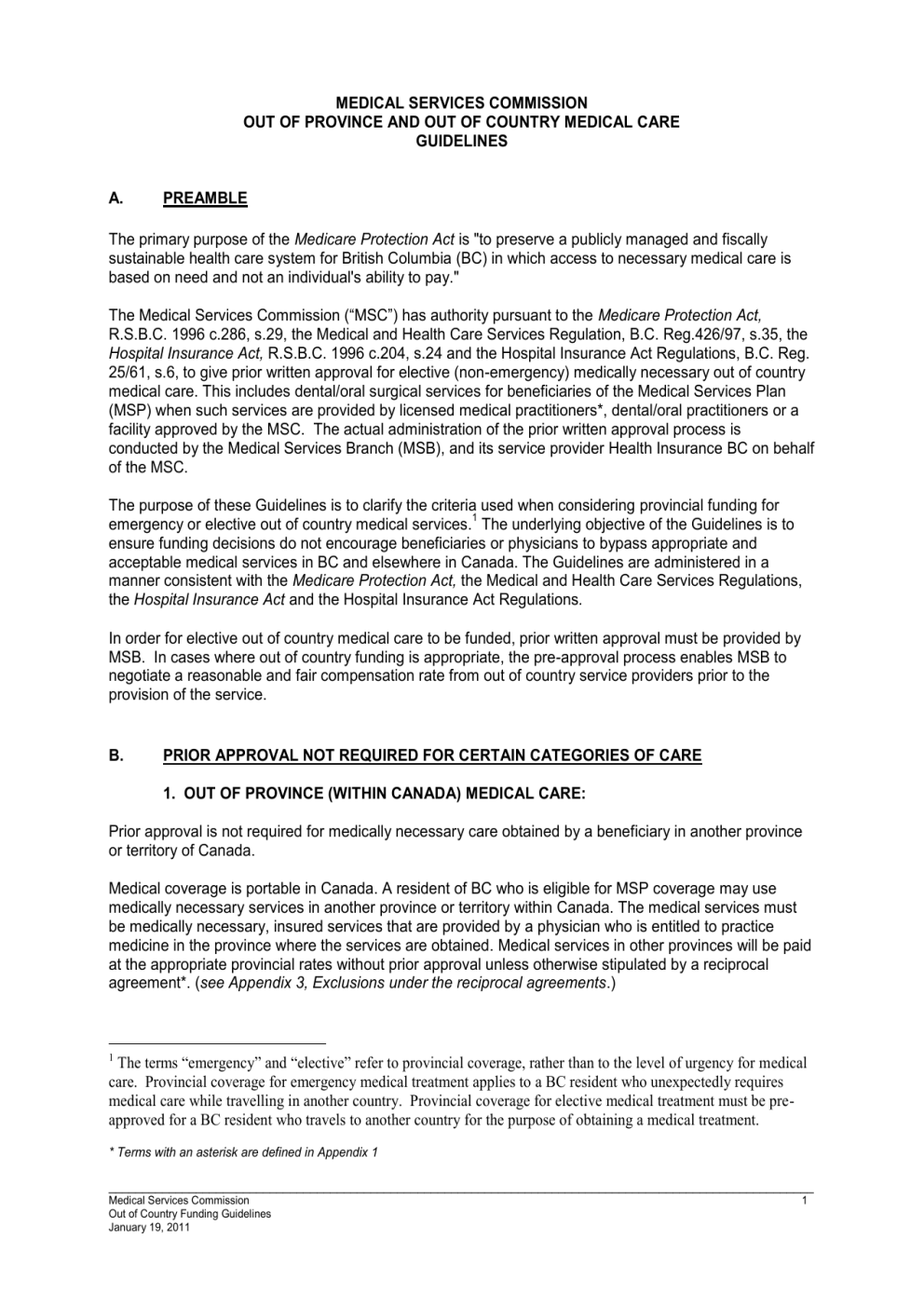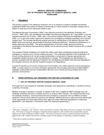 MEDICAL SERVICES COMMISSION OUT OF PROVINCE AND OUT OF COUNTRY MEDICAL CARE GUIDELINES A. PREAMBLE The primary purpose of the Medicare Protection Act is "to preserve a publicly managed and fiscally sustainable health care system for British Columbia (BC) in which access to necessary medical care is based on need and not an individual's ability to pay." The Medical Services Commission (“MSC”) has authority pursuant to the Medicare Protection Act, R.S.B.C. 1996 c.286, s.29, the Medical and Health Care Services Regulation, B.C. Reg.426/97, s.35, the Hospital Insurance Act, R.S.B.C. 1996 c.204, s.24 and the Hospital Insurance Act Regulations, B.C. Reg. 25/61, s.6, to give prior written approval for elective (non-emergency) medically necessary out of country medical care. This includes dental/oral surgical services for beneficiaries of the Medical Services Plan (MSP) when such services are provided by licensed medical practitioners*, dental/oral practitioners or a facility approved by the MSC. The actual administration of the prior written approval process is conducted by the Medical Services Branch (MSB), and its service provider Health Insurance BC on behalf of the MSC. The purpose of these Guidelines is to clarify the criteria used when considering provincial funding for 1 emergency or elective out of country medical services. The underlying objective of the Guidelines is to ensure funding decisions do not encourage beneficiaries or physicians to bypass appropriate and acceptable medical services in BC and elsewhere in Canada. The Guidelines are administered in a manner consistent with the Medicare Protection Act, the Medical and Health Care Services Regulations, the Hospital Insurance Act and the Hospital Insurance Act Regulations. In order for elective out of country medical care to be funded, prior written approval must be provided by MSB. In cases where out of country funding is appropriate, the pre-approval process enables MSB to negotiate a reasonable and fair compensation rate from out of country service providers prior to the provision of the service. B. PRIOR APPROVAL NOT REQUIRED FOR CERTAIN CATEGORIES OF CARE 1. OUT OF PROVINCE (WITHIN CANADA) MEDICAL CARE: Prior approval is not required for medically necessary care obtained by a beneficiary in another province or territory of Canada. Medical coverage is portable in Canada. A resident of BC who is eligible for MSP coverage may use medically necessary services in another province or territory within Canada. The medical services must be medically necessary, insured services that are provided by a physician who is entitled to practice medicine in the province where the services are obtained. Medical services in other provinces will be paid at the appropriate provincial rates without prior approval unless otherwise stipulated by a reciprocal agreement*. (see Appendix 3, Exclusions under the reciprocal agreements.) 1 The terms “emergency” and “elective” refer to provincial coverage, rather than to the level of urgency for medical care. Provincial coverage for emergency medical treatment applies to a BC resident who unexpectedly requires medical care while travelling in another country. Provincial coverage for elective medical treatment must be preapproved for a BC resident who travels to another country for the purpose of obtaining a medical treatment. * Terms with an asterisk are defined in Appendix 1 _________________________________________________________________________________________________________ Medical Services Commission Out of Country Funding Guidelines January 19, 2011 1 Under the terms of the appropriate reciprocal agreement, BC will fund the cost of physician and acute care hospital services in other Canadian provinces and territories (except Quebec) provided the service meets the following criteria: a) it is medically required; b) it is provided by a medical practitioner or oral surgeon entitled to practice in the province or territory where the service is rendered; and c) it would be a benefit if performed in BC unless otherwise stipulated by the terms of the reciprocal agreement. In other Canadian provinces and territories (except Quebec), medical practitioners are encouraged to bill reciprocally rather than bill the beneficiary directly. In most cases, medical practitioners will bill the provincial health care plan where the service is provided and then BC will reimburse the province or territory where services were provided. In-patient hospital care at approved acute care facilities outside the province will be reimbursed at the rate established in the reciprocal agreement in accordance with the Hospital Insurance Act and Regulations. 2. OUT OF COUNTRY EMERGENCY CARE: Prior approval is not required for out of country emergency medical care. The province provides funding for emergency out of country medical and dental/oral surgical services when immediate medical treatment is necessary and the need occurs unexpectedly when a beneficiary is travelling for business or pleasure or studying outside of Canada. The coverage for medical services outside of Canada allows payment up to the fee rates that have been established in the British Columbia Medical Services Commission Payment Schedule*, in Canadian funds. The coverage for in-patient hospital care, when care is provided at an approved acute care facility outside of Canada is limited to the rate established under the Hospital Insurance Act, which is currently a maximum payment of $75 per day, in Canadian funds. The costs for physician and hospital services outside of Canada are very often considerably more than the provincial fee rates; therefore, beneficiaries are very strongly encouraged to purchase additional insurance when travelling outside of the country. C. ELECTIVE (NON-EMERGENCY) OUT OF COUNTRY MEDICAL CARE In order for the province to consider funding for elective out of country medical care, the attending medical specialist must forward the a