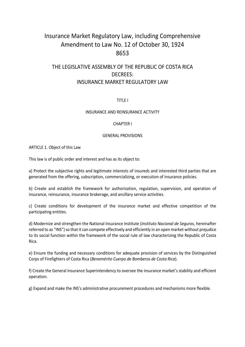 Insurance Market Regulatory Law, including Comprehensive Amendment to Law No. 12 of October 30, 1924 8653 THE LEGISLATIVE ASSEMBLY OF THE REPUBLIC OF COSTA RICA DECREES: INSURANCE MARKET REGULATORY LAW TITLE I INSURANCE AND REINSURANCE ACTIVITY CHAPTER I GENERAL PROVISIONS ARTICLE 1. Object of this Law This law is of public order and interest and has as its object to: a) Protect the subjective rights and legitimate interests of insureds and interested third parties that are generated from the offering, subscription, commercializing, or execution of insurance policies. b) Create and establish the framework for authorization, regulation, supervision, and operation of insurance, reinsurance, insurance brokerage, and ancillary service activities. c) Create conditions for development of the insurance market and effective competition of the participating entities. d) Modernize and strengthen the National Insurance Institute (Instituto Nacional de Seguros, hereinafter referred to as “INS”) so that it can compete effectively and efficiently in an open market without prejudice to its social function within the framework of the social rule of law characterizing the Republic of Costa Rica. e) Ensure the funding and necessary conditions for adequate provision of services by the Distinguished Corps of Firefighters of Costa Rica (Benemérito Cuerpo de Bomberos de Costa Rica). f) Create the General Insurance Superintendency to oversee the insurance market’s stability and efficient operation. g) Expand and make the INS’s administrative procurement procedures and mechanisms more flexible. ARTICLE 2. Insurance and Reinsurance Activity The insurance and reinsurance activity in this country may only be engaged in by entities having the respective administrative authorization issued by the General Insurance Superintendency, hereinafter “Superintendence”, pursuant to the provisions of Article 7 hereof. The insurance activity consists of accepting, in exchange for a premium, the transfer of insurable risks to which third parties are exposed, in order to spread out over a group the economic burden their occurrence may generate. The insuring entity that accepts this transfer is contractually obligated, in the occurrence of the risk, to indemnify the policy beneficiary for economic losses that are sustained or to offset an agreed amount of capital, income, or other benefits. Reinsurance activity is understood as activity whereby, based on a reinsurance contract and in exchange for a premium, a reinsurance entity accepts the assignment of all or part of the risk assumed by an insurance entity by virtue of underlying insurance policies. Where appropriate, the provisions established by legislation for insurance companies will be applicable to reinsurance companies. All natural and legal persons who directly or indirectly engage in or carry out any type of insurance or reinsurance activity or its brokerage or ancillary insurance services will be subject to the scope of this law’s enforcement. Excluded from the scope hereof are the obligatory social security systems administered by the Costa Rican Social Security Institute (Caja Costarricense de Seguro Social, or CCSS), pursuant to the provisions of Article 73 of the Constitution, Article 2 of Law No. 17 of October 1943, creating the CCSS; the special pension regimes created by law, and the mandatory mutual policy administered by the Life Insurance Company of the National Teachers' Union (Sociedad de Seguros de Vida del Magisterio Nacional), pursuant to the provisions of Articles 496 to 508 of the Code of Education (Código de Educación), Law No. 181 of August 18, 1944, and its amendments. ARTICLE 3. Public Offering of Insurance and Insurance Business Only those who are authorized to do so may make a public offering of insurance and insurance business, as provided herein. Public offering of insurance covers any activity that seeks to sell one or several insurance policies, including the promotion and advertising of insurance of any kind and by any dissemination or communication means, the providing of specific or concrete information concerning a particular insurance policy, general presentations or convocations to those presentations on insurance companies and the services or products they provide, and insurance brokerage. The carrying out of insurance business is understood as any action that implies the exercise of insurance activity, including actions that generate the obligations and rights of an insurance policy or the preparatory acts for materializing such policy, said preparatory acts and any activity needed for performing obligations or claiming rights arising from an insurance policy, including ancillary insurance services, and any act implying the managing of an insurance policy or customer portfolio. CHAPTER II RIGHTS OF INSUREDS ARTICLE 4. Rights of Insureds All natural or legal persons who directly or indirectly participate in insurance activity will be subject to the legislation on the promotion of competition and effective consumer protection. Insurance consumers are guaranteed the right to protect their economic interests and the right to equitable treatment and freedom of choice among insurance companies, insurance brokers, and ancillary services of their preference with adequate quality standards, as well as the right to receive adequate and truthful information, prior to the signing of any policy, on the companies that will provide effective coverage for the different insurable or insured economic interests and risks. Moreover, insureds must receive a timely response to all claims, petitions or requests they submit personally or by means of their legal representative to an insurance entity, agent, or brokerage, within thirty calendar days, as defined in regulations. In all cases, when payment or indemnification is involved it must be made within the aforementioned time period as of notice of the timely response. Notwithstanding, whe