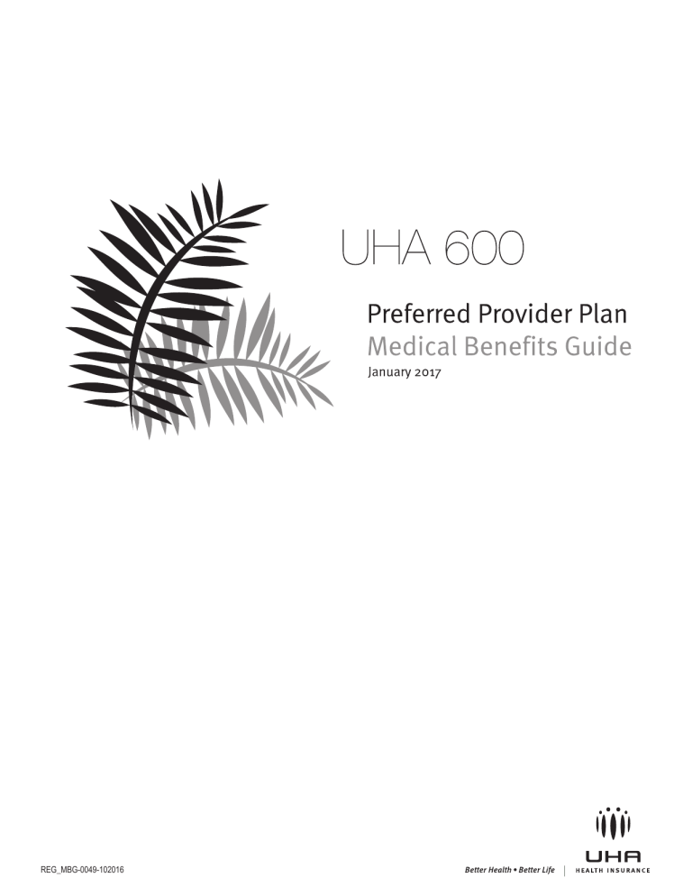 REG_MBG-0049-102016 TABLE OF CONTENTS SECTION 1: GENERAL INFORMATION ............................................................................................................ 1 SECTION 2: ELIGIBILITY AND ENROLLMENT RULES ...................................................................................... 6 SECTION 3: PAYMENT INFORMATION ............................................................................................................ 9 SECTION 4: SUMMARY OF BENEFITS AND PAYMENT OBLIGATIONS .......................................................... 11 SECTION 5: DESCRIPTION OF BENEFITS ..................................................................................................... 19 A. B. C. D. E. F. G. H. I. J. K. L. M. N. O. P. Q. R. PREVENTIVE CARE SERVICES .......................................................................................................... 19 DISEASE MANAGEMENT PROGRAMS ............................................................................................... 20 PHYSICIAN SERVICES ...................................................................................................................... 21 SURGICAL SERVICES ....................................................................................................................... 22 HOSPITAL SERVICES ........................................................................................................................ 24 SKILLED NURSING FACILITY SERVICES ........................................................................................... 25 HOME HEALTH CARE AND HOSPICE SERVICES ............................................................................... 26 DIAGNOSTIC TESTING, LABORATORY AND RADIOLOGY SERVICES ................................................ 27 CHEMOTHERAPY AND RADIATION THERAPY ................................................................................... 27 ORGAN TRANSPLANT SERVICES ..................................................................................................... 28 MENTAL HEALTH AND SUBSTANCE ABUSE SERVICES .................................................................... 29 SPECIFIC BENEFITS FOR CHILDREN ................................................................................................ 30 SPECIFIC BENEFITS FOR WOMEN .................................................................................................... 31 SPECIFIC BENEFITS FOR MEN .......................................................................................................... 32 SPECIFIC BENEFITS FOR MEMBER AND COVERED SPOUSE ............................................................ 32 SPECIFIC BENEFITS FOR DIABETES ................................................................................................. 33 COMPLEMENTARY ALTERNATIVE MEDICINE ................................................................................... 33 OTHER MEDICAL SERVICES ............................................................................................................. 34 SECTION 6: SERVICES NOT COVERED ......................................................................................................... 38 SECTION 7: HEALTH CARE SERVICES PROGRAM ....................................................................................... 44 SECTION 8: FILING CLAIMS FOR PAYMENT ................................................................................................. 51 SECTION 9: IF YOU DISAGREE WITH OUR DECISION ................................................................................... 53 SECTION 10: COORDINATION OF BENEFITS & THIRD PARTY LIABILITY........................................................ 59 SECTION 11: OTHER PLAN PROVISIONS ........................................................................................................ 64 GLOSSARY OF IMPORTANT TERMS ................................................................................................................. 70 General Information SECTION 1: GENERAL INFORMATION About this Plan UHA 600 represents a major advance in health care coverage in Hawaii through its focus on keeping you healthy and well. Many wellness services are covered at little or no cost to you, emphasizing the prevention and early detection of serious diseases such as cancer and heart disease, plus identification and treatment of risk factors for life-threatening and disabling diseases. In addition, the plan provides you with the following tools you need to get well and stay well: • Nutritional counseling programs for disease management • Smoking cessation program • Diabetes self-management training and education • Asthma education program These programs are offered to you at no cost—they’re fully covered by the Plan. At the same time, you’ll enjoy the traditional benefits, which protect you against financial loss from illness or injury. UHA is committed to improving the quality of your life by improving your health. About this Booklet This booklet provides you with all the necessary information about your UHA health benefits plan. Please review it so you understand how your plan works and keep it handy for reference. How to Contact UHA Should you ever have any questions about your plan, please contact us: By phone: Please call Customer Services at 532-4000 from Oahu, or 1-800-458-4600 (toll-free) from the neighbor islands By fax: (866) 572-4393 By mail: UHA Attn.: Customer Services 700 Bishop Street, Suite 300 Honolulu, HI 96813 On the web: uhahealth.com for access to information on benefits and frequently asked questions, to look up the names and addresses of participating providers, or to submit a question to us Definitions Important terms used in this booklet will appear in bold the first time they are used. Definitions of these terms are included in the glossary at the end of the booklet for easy reference. We use the terms You and Your to mean you and your family M