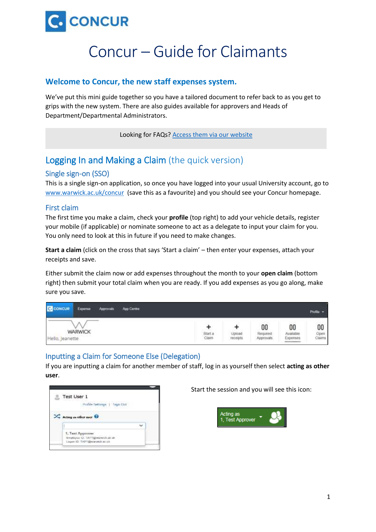 Concur – Guide for Claimants Welcome to Concur, the new staff expenses system. We’ve put this mini guide together so you have a tailored document to refer back to as you get to grips with the new system. There are also guides available for approvers and Heads of Department/Departmental Administrators. Looking for FAQs? Access them via our website Logging In and Making a Claim (the quick version) Single sign-on (SSO) This is a single sign-on application, so once you have logged into your usual University account, go to www.warwick.ac.uk/concur (save this as a favourite) and you should see your Concur homepage. First claim The first time you make a claim, check your profile (top right) to add your vehicle details, register your mobile (if applicable) or nominate someone to act as a delegate to input your claim for you. You only need to look at this in future if you need to make changes. Start a claim (click on the cross that says ‘Start a claim’ – then enter your expenses, attach your receipts and save. Either submit the claim now or add expenses throughout the month to your open claim (bottom right) then submit your total claim when you are ready. If you add expenses as you go along, make sure you save. Inputting a Claim for Someone Else (Delegation) If you are inputting a claim for another member of staff, log in as yourself then select acting as other user. Start the session and you will see this icon: 1 Note: you cannot submit this claim; once you have finished entering all the items you need to click on . The employee will then need to check that you have entered everything correctly and submit the claim themselves. The More Detailed Guide Getting Started There are some fields we’ve set for you and others you can update yourself. Click on your profile (top right) to see what these are: Expense Information – all your expense claims will automatically be assigned to this code (but you can change (“allocate”) the costs when you make your claim, if you need to). Expense Delegates – you can choose someone (or more than one person) to input a claim on your behalf (you will still have to submit the claim). You can also see if someone (or more than one person) has selected you to be a delegate for them. Expense Preferences – you can choose not to receive email notifications, but be aware that if you untick this, you won’t receive emails and will need to check on Concur if your claim has been returned for any reason. Expense Approvers – your claim will automatically be sent to the person shown here. Company Car and Personal Car – if you need to claim for mileage incurred on University business, you will first need to provide details about your car and confirm you have a valid licence etc. Mobile Registration – you can download the Concur app and register your mobile device so that you can take photos of your receipts, which can then be added to your claim. Note: you can also complete, submit and approve claims on your mobile, but some functions are not currently available on a mobile device, such as changing a cost code, using Google Maps, returning or forwarding a claim. 2 Making a Claim Click on start a claim Complete all boxes with a red vertical line (boxes without a red line are optional). The claim name (report name) is for you to identify the claim. The date defaults to the date you start to make the claim. The business purpose has a maximum of 50 characters and you are recommended to enter the place, date and purpose. Note: You will see a “comment” box on various screens – please use this if you need to provide additional information that you think might be helpful in understanding your claim. Choose the type of expense Expense Fields Select the date you made the transaction. Business purpose – this automatically carries through from your header but remember to change it if your claim includes various trips. City of purchase – this automatically changes the currency, so if you have paid for a taxi in Singapore, the currency will change to SGD, for example. If you have made an online purchase, you may need to amend the city to reflect the currency of the receipt rather than where you physically were. After you have used this a few times, Concur will start to remember your most recently used locations. Payment type – you don’t need to change this. Amount – if you have a non-sterling expense, the sterling equivalent will be automatically calculated. If this calculation differs from what you were actually charged, you can overwrite the “amount in GBP” (within limits). Please use the “attach receipt” button for attaching both the exchange rate proof and the receipt. Receipt status – you need a receipt for all expenses. If for any reason you do not have one, you need to change this to ‘no receipt’ and provide an explanation in the comment box. Ignore the VAT number request - the University isn't currently using this. 3 Attach receipts (bottom right of your screen). You will need to have uploaded or scanned your receipts already and saved them on your computer/mobile device. Save – this is really important – if you can see the save button, you haven’t yet saved! If you have stayed in a hotel, you will also see a button “itemize”; use this to show how many nights you stayed in the hotel and whether any of the charges were for extras on top of the nightly room rate. Enter the next item, remembering to change the purchase date and business purpose if necessary. If you need to change the code that any of your items are charged to, it is quickest to do this after you have entered all your expenses and then going to “details” followed by “allocations”. If you have several items to go to one code, just tick them and they will become a group. Then by entering the appropriate cost collector (you may need to change the company code or cost object type first). Once you have saved a new code you can . If you see a message that 