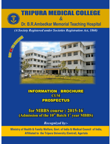 TRIPURA MEDICAL COLLEGE & Dr. B.R.Ambedkar Memorial Teaching Hospital G IN G G SAY NO TO RA (A Society Registered under Societies Registration Act, 1860) INFORMATION BROCHURE CUM PROSPECTUS for MBBS course : 2015-16 (Admission of the 10th Batch 1st year MBBS) Recognized by:Ministry of Health & Family Welfare, Govt. of India & Medical Council of India, Affiliated to the Tripura University (Central), Agartala CONTENTS 1. 2. 3. 4. Our Motto, Vision & Mission Our State Our College, location, Affiliation & Recognition, Academic Performances Our Teaching Hospital i) ii) iii) iv) v) vi) 5. 6. 7. 8. 9. Distribution of Department wise Beds OPD & Indoor clinical services Diagnostic facilities Super-speciality services Community services Special schemes Administrative Set-up Admission procedure for MBBS course (2013-14) i) ii) iii) iv) v) vi) 6 6,7 & 8 Distribution of seats Eligibility criteria Method of selection About the Entrance test How to apply Documents required with application Important dates (Application, Submission, Examination, Selection & Admission etc) Fee structure General Academic Information i) ii) iii) iv) v) vi) Page No 1 2 3 4&5 8 9 10 & 11 Tripura University Affiliation Duration of course Academic session Academic calendar Class Attendance Institutional Discipline 10. Facilities of the College 12 & 13 i) Hostel & its Rules ii) Sports & Games iii) Library 11. Say NO to RAGGING i) ii) iii) iv) v) Anti Ragging helpline Anti Ragging Regulation Anti Ragging Committee Anti Ragging Squad Mentoring Cell. Annexure A) Application & Admit Card Form alongwith instructions. B) Anti-Ragging undertaking of students & Parents/Guardians. 14,15 & 16 Information Brouchure cum Prospectus OUR 1.1 MOTTO :To create Compassionate, Competent, Caring and Motivated health working force. 1.2 Vision :i) To produce quality Medical Graduates & Post Graduates ii) To provide best Health care facilities to the people of Tripura. iii) To promote Medical Research 1.3 Mission :i) To generate excellent Medical Professionals with strong academic base and sound technical competence who can effectively serve the community. ii) To make the Tripura Medical College one of the Pioneer Medical Institutions in the Country. 1 Information Brouchure cum Prospectus 2. OUR STATE Tripura is one of the eight sisters states in the North Eastern region of India located between 22o56' N and 24o32' N and between 90o09' E and 92o20' E. It is surrounded on the north, west, south and south-east by Bangladesh and in the east it has a common boundary with Assam & Mizoram. The former princely state of Tripura was ruled by Maharajas of Manikya dynasty. It was an independent administrative unit under the Maharaja even during the British, as the paramount power, of each successive ruler. After independence of India, an agreement of merger of Tripura with the Indian Union was signed by the Regent Maharani on September 9, 1947 and the administration of the state was actually taken over by the Govt. of India on October 15, 1949. Tripura became a Union Territory without legislature with effect from st November 1, 1956 and a popular ministry was installed in Tripura on July 1, 1963. In January 21 , 1972 Tripura attained statehood. It is a state of mixed population. Besides Bengalis & Manipuris there have been 19 main tribal communities with their own rich cultural heritage. The main languages spoken here are Bengali & Kokborok though English & Hindi knowing people are also found in plenty. It has excellent opportunity for Tourism with places of interest. Folk Dances of Tripura speak its rich cultural heritage. GENERAL INFORMATION :Area Population Altitude Climate : : : : Language : : District. 10,491,69 SQ KM 36,71,032 (provisional) 12.8 mtr Summer : 37o C (max) & 21o C (min) Winter : 18o C (max) & 4o C (min) Bengali, Kokborok, English & Hindi. 8 Nos., Sub-Divn. - 23 Nos. Agartala, the capital city of the Tripura state, is situated in the West Tripura district. HOW TO REACH :Air :- Agartala is connected by air to Kolkata, Guwahati, Silchar, Mumbai, Chennai, Bengaluru, Hyderabad, Ahemedabad, Imphal & Delhi Rail :- Agartala is connected by Railways to other parts of the Country. Road :- Guwahati is 600 km away from Agartala. There are good road connectivity inside & outside of the state through NH-44 and other road networks throughout the state with public transport facilities. Local Transport :- Public Bus & Auto services and different model of cars & vehicles on hire basis. 2 Information Brouchure cum Prospectus 3. OUR COLLEGE 3.1 The Tripura Medical College & Dr. B.R.Ambedkar Memorial Teaching Hospital is situated at Hapania, West Tripura about a distance of 7 km away from the heart of the capital city of Agartala & 1.5 km away from Agartala Railway Station. It is well connected with the city by road transport. The area is free from noise, overcrowding and pollution. The 1st batch of MBBS students was admitted in 2006 after obtaining permission from the Ministry of Health & Family Welfare, Government of India on recommendation of M.C.I .The hospital , classrooms and laboratories are well equipped. Sports facilities including gym are available for the students. All faculties together with technical & non-technical staff are devotedly working to promote the College & Hospital to the nation's standard. A well equipped Central Library with a space of 1600 sqmt. and more than 10,000 books is one of our assets. All departments have separate libraries. The faculties here already have a number of research publications to their credit within the short time of the existence of this institution. On detailed inspection and reviewing the performances of the Institution, the MCI has issued ’’Letter of Permission” for opening PG courses (MD/MS) in the disciplines of Pharmacology, Pathology, General Medicine & ENT and all ready started from the academic session 2013-14. LIST OF THE DEPARTMENTS Sl. No. 1 2 3 4 5 6 7 8 9 10 11 12 13 14 15 16 17 18 19 20 21 22