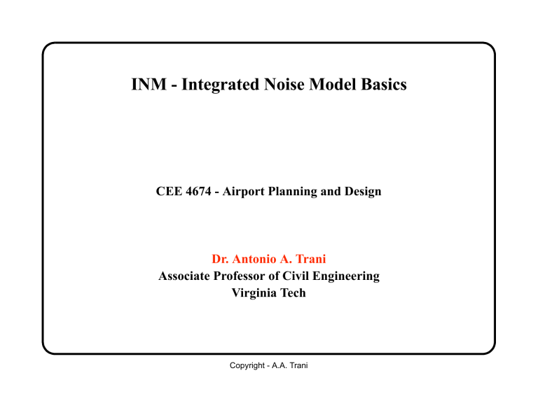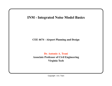 INM - Integrated Noise Model Basics CEE 4674 - Airport Planning and Design Dr. Antonio A. Trani Associate Professor of Civil Engineering Virginia Tech Copyright - A.A. Trani 1 of 44 Basics on INM • • • • • Developed by FAA Office of Energy and Environment and EPA The initial versions of INM was developed in FORTRAN and ported to the PC in 1982 Newest version is 7.0 (runs on Windows XP or Vista OS) The model includes a good database (101 aircraft currently) to analyze civilian airports A similar model has been developed by the human factors group at Wright Patterson AFB to predict noise contours around military bases (NOISEMAP 6.1) Copyright - A.A. Trani 2 of 44 Justification for INM • • • After 1969 every transportation project (including airport upgrades and plans) require a detailed environmental study The only way to convey information to communities around an airport is to compute potential noise levels before constructing a facility Noise prediction is a tedious process for real airports as there are too many aircraft and tracks that need to be analyzed in determining the noise at a point on the ground Copyright - A.A. Trani 3 of 44 Inputs to INM • Airport characteristics (runways, orientation, etc.) • Approach and departure profiles + Procedural (aerodynamic based profiles) + Fixed point profiles • Flight tracks + + + + + Approach Departure Touch-and-go Circling Overflights Copyright - A.A. Trani 4 of 44 Inputs to INM • Flight operations + Numbers of aircraft assigned to each track + Percent aircraft assigned to each track + Runup operations (engine test operations) • Noise Metric + Select among DNL, CNEL, NEF, TNEL, and 12 others. Copyright - A.A. Trani 5 of 44 INM Output • • • Noise contours (contours of equal values of a noise metric like DNL) Complex metric population point calculations (i.e. DNL level at a specific city block) Population living within a given complex noise metric (i.e., how many people live within DNL 55 contour) Copyright - A.A. Trani 6 of 44 Detailed Procedures for INM 1) Open a New Case Study from the File menu 2) Select the airport in question in the Setup Window 3) Verify all runway data (including altitudes and displaced thresholds) 4) Go to the Aircraft Window to select all the aircraft to be modeled in your case study 5) Apply aircraft substitutions as needed 6) Select the noise metric to be used in the computational procedure (from Setup - Metrics menu) Copyright - A.A. Trani 7 of 44 Procedures (II) 7) Add a Case from Setup-Cases menu 8) Define aircraft approach and departure tracks from the Tracks menu (select Input Graphics) 9) Define aircraft operations using the Acft menu (select Flight Ops...) 10) Run the case study using the Run menu • Define the Grid Setup and Grid parameters used 11) Under Run Options (Run menu) select the noise metric desired and commit record Copyright - A.A. Trani 8 of 44 Procedures (III) 12) To view the output create an output scenario from the Output menu (select Output Setup) • If your plot is incomplete increase the grid size and modify the grid coordinates appropriately to increase the siae of the grid NOTE: When entering data in INM always COMMIT records otherwise data is not saved Copyright - A.A. Trani 9 of 44 INM 7 Menus • • Like many Windows applications INM has many pulldown menus to execute tasks (shown below) Each menu will be explained in detail later Pull-down menus Copyright - A.A. Trani 10 of 44 INM 7.0 Menus • • • File and Edit pull-down menus Use File to create new studies, save them and import/ export operations Use Edit to add, commit, cut and paste records File Edit Copyright - A.A. Trani 11 of 44 INM 7.0 Menus • • Use View to calculate distances and compute thrust Use Setup to define aircraft, noise metrics,cases, etc. Setup View Tracks Copyright - A.A. Trani 12 of 44 INM 7.0 Menus (ACFT, OPS, RUN) Define all aircraft and Noise-Distance-Power curves in INM. Also define flight operations (Ops Menu) Acft Ops Copyright - A.A. Trani Run 13 of 44 INM 6.1 Menus • Output - use it to prepare output parameters including output setup, output graphics window options, contour points, and flight path reports Output Window Copyright - A.A. Trani Help 14 of 44 Study Screen The study screen allows you to find predefined airports Copyright - A.A. Trani 15 of 44 What if the Airport is not Contained in INM Database? • Define manually the runway end points • INM will do the rest • • Runway ends are defined as latitude and longitude points Always check the latitute and longitude points of the runway selected. INM could have errors and thus it is your responsibility to check the inputs. Copyright - A.A. Trani 16 of 44 Defining Tracks in INM Three ways to do it: • Interactive tracks (called P-tracks) • Vector tracks (V-tracks) • Tracks using radar data Interactive tracks are defined using the computer mouse and only represent straight line segments. Use vector tracks are defined by arcs and straight line segments Only interactive (p-tracks) can be dispersed to show more realistic flight path deviations. Copyright - A.A. Trani 17 of 44 Interactive Tracks (P-tracks) Tracks can be defined interactively using the mouse Track Controls Departure Track Dispersion Arrival Track Copyright - A.A. Trani 18 of 44 Vector Tracks (V-Tracks) Defined by a combination of straight line and arc segments To define a V-track select the ì Track Segmentsî from ì Tracksî pull-down menu Click the ì +î sign to add segments to the flight track Copyright - A.A. Trani 19 of 44 Sample V-Tracks for BCB Airport Copyright - A.A. Trani 20 of 44 Summary of Tracks in INM Both procedures are acceptable in practice Interactive tracks can be dispersed to show more realistic flight paths Interactive tracks require many straight segments to represent a realistic aircraft turn Vector tracks generally produce ì better lookingî contours (not necessarily more accurate) Copyright - A.A. Trani 21 o