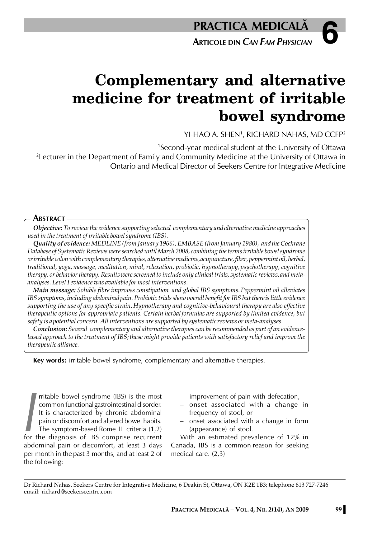 PRACTICA MEDICALÅ ARTICOLE DIN CAN FAM PHYSICIAN 6 Complementary and alternative medicine for treatment of irritable bowel syndrome YI-HAO A. SHEN1, RICHARD NAHAS, MD CCFP2 1 Second-year medical student at the University of Ottawa Lecturer in the Department of Family and Community Medicine at the University of Ottawa in Ontario and Medical Director of Seekers Centre for Integrative Medicine 2 ABSTRACT Objective: To review the evidence supporting selected complementary and alternative medicine approaches used in the treatment of irritable bowel syndrome (IBS). Quality of evidence: MEDLINE (from January 1966), EMBASE (from January 1980), and the Cochrane Database of Systematic Reviews were searched until March 2008, combining the terms irritable bowel syndrome or irritable colon with complementary therapies, alternative medicine, acupuncture, fiber, peppermint oil, herbal, traditional, yoga, massage, meditation, mind, relaxation, probiotic, hypnotherapy, psychotherapy, cognitive therapy, or behavior therapy. Results were screened to include only clinical trials, systematic reviews, and metaanalyses. Level I evidence was available for most interventions. Main message: Soluble fibre improves constipation and global IBS symptoms. Peppermint oil alleviates IBS symptoms, including abdominal pain. Probiotic trials show overall benefit for IBS but there is little evidence supporting the use of any specific strain. Hypnotherapy and cognitive-behavioural therapy are also effective therapeutic options for appropriate patients. Certain herbal formulas are supported by limited evidence, but safety is a potential concern. All interventions are supported by systematic reviews or meta-analyses. Conclusion: Several complementary and alternative therapies can be recommended as part of an evidencebased approach to the treatment of IBS; these might provide patients with satisfactory relief and improve the therapeutic alliance. Key words: irritable bowel syndrome, complementary and alternative therapies. I rritable bowel syndrome (IBS) is the most common functional gastrointestinal disorder. It is characterized by chronic abdominal pain or discomfort and altered bowel habits. The symptom-based Rome III criteria (1,2) for the diagnosis of IBS comprise recurrent abdominal pain or discomfort, at least 3 days per month in the past 3 months, and at least 2 of the following: – improvement of pain with defecation, – onset associated with a change in frequency of stool, or – onset associated with a change in form (appearance) of stool. With an estimated prevalence of 12% in Canada, IBS is a common reason for seeking medical care. (2,3) Dr Richard Nahas, Seekers Centre for Integrative Medicine, 6 Deakin St, Ottawa, ON K2E 1B3; telephone 613 727-7246 email: [email protected] PRACTICA MEDICALÅ – VOL. 4, NR. 2(14), AN 2009 99 COMPLEMENTARY AND ALTERNATIVE MEDICINE FOR TREATMENT OF IRRITABLE BOWEL SYNDROME Although current guidelines state that extensive diagnostic evaluation of suspected IBS is usually not routinely necessary, patients older than 50 with constipation should undergo screening colonoscopy, and parasitic infection, lactose intolerance, and celiac disease should be considered in all patients. (2) The approach to treatment emphasizes education, reassurance, dietary modification, and stress management. (4) Current drug therapy is of limited benefit. Tricyclic antidepressants are supported by solid clinical evidence, (5) but there is less robust evidence supporting the use of antispasmodics (6) or selective serotonin reuptake inhibitor antidepressants. (7) Agents targeting serotonin subtypes are not widely used owing to potential risks. Alosetron is associated with ischemic colitis and tegaserod with cardiovascular events; neither is licensed for use in Canada. (7) Based on low levels of satisfaction both with the treatment they receive (8,9) and their overall care, (10-12) it is not surprising that almost 50% of IBS patients turn to complementary and alternative medicine (CAM) therapies. (8) Here we present a review of CAM interventions for which safety and efficacy are supported by clinical evidence. QUALITY OF EVIDENCE MEDLINE (from January 1966), EMBASE (from January 1980), and the Cochrane Database of Systematic Reviews were searched until March 2008, combining the terms irritable bowel syndrome or irritable colon with complementary therapies, alternative medicine, acupuncture, fiber, peppermint oil, herbal, traditional, yoga, massage, meditation, mind, relaxation, probiotic, hypnotherapy, psychotherapy, cognitive therapy, or behavior therapy. The interventions included in this review were selected by the authors based on literature reviews and clinical experience. We included clinical trials, systematic reviews, and metaanalyses in the review. Level I evidence was available for most interventions (Table 1). (13-26) INTERVENTIONS Fibre Increasing fibre intake through diet or supplementation is often the first advice given to IBS patients. (27) This intervention was first proposed based on epidemiologic data and adopted based on a clinical trial that demonstrated benefits in 26 affected patients. (28) It seems that soluble but not insoluble fibre might be effective, but the evidence is problematic. Soluble fibre is usually administered as psyllium, the ground seed coat of members of the genus Plantago. It is also found in whole grains, fruits, and vegetables. It forms a gel in water and is fermented by colonic bacteria, yielding metabolites that might decrease gut transit time and intracolonic pressure. Insoluble fibre, found in wheat bran and corn bran, undergoes minimal change but it retains water to increase stool bulk and decrease transit time. We found 2 systematic reviews that examined the role of fibre in treating IBS. A Cochrane review of 11 randomized controlled trials (RCTs) limited to bulking agents (4 trials using wheat bran and 7 trials using soluble fibre) failed to demonstrate any e