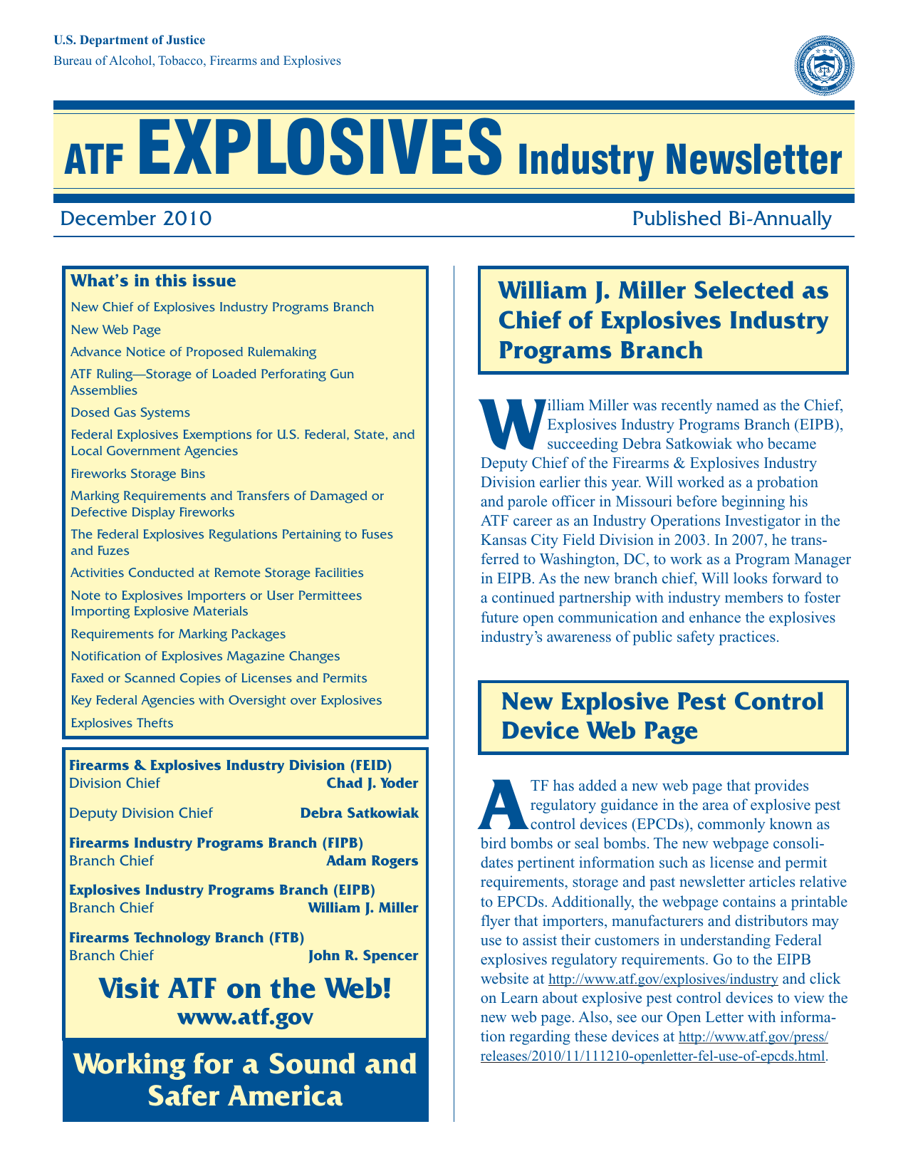 U.S. Department of Justice Bureau of Alcohol, Tobacco, Firearms and Explosives ATF EXPLOSIVES Industry Newsletter December 2010 Published Bi-Annually What’s in this issue New Chief of Explosives Industry Programs Branch New Web Page Advance Notice of Proposed Rulemaking ATF Ruling—Storage of Loaded Perforating Gun Assemblies Dosed Gas Systems Federal Explosives Exemptions for U.S. Federal, State, and Local Government Agencies Fireworks Storage Bins Marking Requirements and Transfers of Damaged or Defective Display Fireworks The Federal Explosives Regulations Pertaining to Fuses and Fuzes Activities Conducted at Remote Storage Facilities Note to Explosives Importers or User Permittees Importing Explosive Materials Requirements for Marking Packages William J. Miller Selected as Chief of Explosives Industry Programs Branch W illiam Miller was recently named as the Chief, Explosives Industry Programs Branch (EIPB), succeeding Debra Satkowiak who became Deputy Chief of the Firearms & Explosives Industry Division earlier this year. Will worked as a probation and parole officer in Missouri before beginning his ATF career as an Industry Operations Investigator in the Kansas City Field Division in 2003. In 2007, he transferred to Washington, DC, to work as a Program Manager in EIPB. As the new branch chief, Will looks forward to a continued partnership with industry members to foster future open communication and enhance the explosives industry’s awareness of public safety practices. Notification of Explosives Magazine Changes Faxed or Scanned Copies of Licenses and Permits Key Federal Agencies with Oversight over Explosives Explosives Thefts Firearms & Explosives Industry Division (FEID) Division Chief Chad J. Yoder Deputy Division Chief Debra Satkowiak Firearms Industry Programs Branch (FIPB) Branch Chief Adam Rogers Explosives Industry Programs Branch (EIPB) Branch Chief William J. Miller Firearms Technology Branch (FTB) Branch Chief John R. Spencer Visit ATF on the Web! www.atf.gov Working for a Sound and Safer America New Explosive Pest Control Device Web Page A TF has added a new web page that provides regulatory guidance in the area of explosive pest control devices (EPCDs), commonly known as bird bombs or seal bombs. The new webpage consolidates pertinent information such as license and permit requirements, storage and past newsletter articles relative to EPCDs. Additionally, the webpage contains a printable flyer that importers, manufacturers and distributors may use to assist their customers in understanding Federal explosives regulatory requirements. Go to the EIPB website at http://www.atf.gov/explosives/industry and click on Learn about explosive pest control devices to view the new web page. Also, see our Open Letter with information regarding these devices at http://www.atf.gov/press/ releases/2010/11/111210-openletter-fel-use-of-epcds.html. Advance Notice of Proposed Rulemaking: Separation Distances of Ammonium Nitrate and Blasting Agents O n September 16, 2010, ATF published an Advance Notice of Proposed Rulemaking (ANPRM) in the Federal Register (Notice No. ATF 26A) titled “Separation Distances of Ammonium Nitrate and Blasting Agents from Explosives or Blasting Agents.” The principal purpose of this ANPRM was to notify the public and the explosives industry of ATF’s intent to replace the regulations’ reference to The Fertilizer Institute’s outdated Definition and Test Procedures for Ammonium Nitrate Fertilizer guidance document; which was used to determine the insensitivity of ammonium nitrate fertilizer. This ANPRM was intended to gather information and comments from the public and explosives industry regarding possible replacements for this guidance document. The ANPRM can be viewed at www.regulations. gov, keywords “blasting agents.” ATF Ruling 2010-7 Storage of Loaded Perforating Gun Assemblies P erforating gun assemblies are primarily used to perforate oil and gas wells in preparation for production operations. Each perforating gun is assembled to meet a specific purpose and function under certain well conditions. These assemblies are commonly housed within hollow thick-walled steel tubes and contain shaped charge perforators, initiated by detonating cord. While regulations at 27 CFR 555.205 normally require loaded perforating gun assemblies to be stored in locked explosives storage magazines, ATF believes that allowing for storage in alternate secure areas greatly decreases the chance of accidents that may occur due to adverse conditions at the jobsite and repeated handling and movement between the assembly area or jobsite and the magazine. Explosives industry members have asked ATF to designate a uniform set of procedures that companies can follow when storing preloaded perforating gun assemblies. ATF has issued Ruling 2010-7 in response to this industry need. 2 Some of the factors ATF considered in developing this ruling were the practicality of storing assembled perforating guns in a traditional explosives magazine (assemblies can range up to 70 feet in length); sparking hazards to other explosives contained in a magazine with assemblies that are housed in metal tubes; and the risk to operators when they are forced to return unused assemblies to the business premises for disassembly and removal of the explosives to an approved magazine. The complete Ruling may be found at http://www.atf.gov/ regulations-rulings/rulings. Licensees or permittees who want to use the alternate method or procedure set forth in ruling 2010-7 are not required to obtain a separate variance approval. Any licensee or permittee having received previous variance approval for the storage of loaded perforating guns outside an approved magazine must immediately comply with all conditions within this ruling. Any other alternate methods or procedures not specified in this ruling may be proposed through a variance request addressed to the Explosives Industry Programs Branch. Dosed Gas