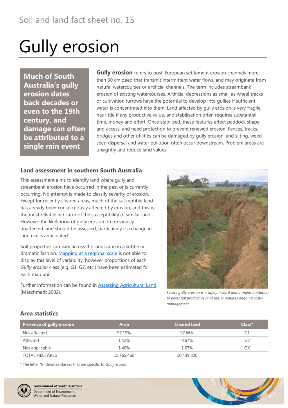 Soil and land fact sheet no. 15 Gully erosion Much of South Australia’s gully erosion dates back decades or even to the 19th century, and damage can often be attributed to a single rain event Gully erosion refers to post-European settlement erosion channels more than 30 cm deep that transmit intermittent water flows, and may originate from natural watercourses or artificial channels. The term includes streambank erosion of existing watercourses. Artificial depressions as small as wheel tracks or cultivation furrows have the potential to develop into gullies if sufficient water is concentrated into them. Land affected by gully erosion is very fragile, has little if any productive value, and stabilisation often requires substantial time, money and effort. Once stabilised, these features affect paddock shape and access, and need protection to prevent renewed erosion. Fences, tracks, bridges and other utilities can be damaged by gully erosion, and silting, weed seed dispersal and water pollution often occur downstream. Problem areas are unsightly and reduce land values. Land assessment in southern South Australia This assessment aims to identify land where gully and streambank erosion have occurred in the past or is currently occurring. No attempt is made to classify severity of erosion. Except for recently cleared areas, much of the susceptible land has already been conspicuously affected by erosion, and this is the most reliable indicator of the susceptibility of similar land. However the likelihood of gully erosion on previously unaffected land should be assessed, particularly if a change in land use is anticipated. Soil properties can vary across the landscape in a subtle or dramatic fashion. Mapping at a regional scale is not able to display this level of variability, however proportions of each Gully erosion class (e.g. G1, G2, etc.) have been estimated for each map unit. Further information can be found in Assessing Agricultural Land (Maschmedt 2002). Severe gully erosion is a safety hazard and a major limitation to potential productive land use. It requires ongoing costly management. Area statistics Presence of gully erosion Area Cleared land Class* Not affected 97.19% 97.66% G1 Affected 1.42% 0.67% G2 Not applicable 1.40% 1.67% GX 15,765,460 10,439,300 TOTAL HECTARES * The letter ‘G’ denotes classes that are specific to Gully erosion Gully erosion Fact sheet Displaying data in soil maps Land and soil attribute maps display a simplified version of the underlying data. At the scale of mapping, it is frequently not possible to map individual watercourses, or map out eroded sections from non-eroded sections of watercourses. Map units display an estimate of the proportion of land that is or has been affected by gully erosion. Gully erosion has severely degraded the value of this landscape Further information View data on NatureMaps ( Soils) Read the metadata for this layer Read more about soil attribute mapping Contact Mapland Download from Enviro Data SA: Statewide map and spatial dataset Assessing Agricultural Lands (Maschmedt 2002) Soils of Southern SA book Part 1 and Part 2 This work is licensed under the Creative Commons Attribution 4.0 International License. To view a copy of this license, visit http://creativecommons.org/licenses/by/4.0/ © Crown in right of the State of South Australia, through the Department of Environment, Water and Natural Resources 2016. Last updated June 2016.