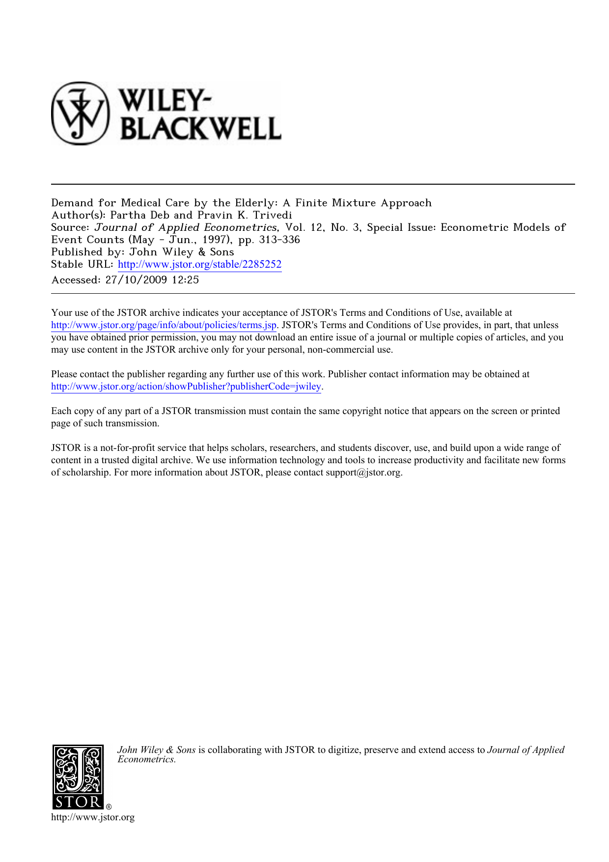 Demand for Medical Care by the Elderly: A Finite Mixture Approach Author(s): Partha Deb and Pravin K. Trivedi Source: Journal of Applied Econometrics, Vol. 12, No. 3, Special Issue: Econometric Models of Event Counts (May - Jun., 1997), pp. 313-336 Published by: John Wiley & Sons Stable URL: http://www.jstor.org/stable/2285252 Accessed: 27/10/2009 12:25 Your use of the JSTOR archive indicates your acceptance of JSTOR's Terms and Conditions of Use, available at http://www.jstor.org/page/info/about/policies/terms.jsp. JSTOR's Terms and Conditions of Use provides, in part, that unless you have obtained prior permission, you may not download an entire issue of a journal or multiple copies of articles, and you may use content in the JSTOR archive only for your personal, non-commercial use. Please contact the publisher regarding any further use of this work. Publisher contact information may be obtained at http://www.jstor.org/action/showPublisher?publisherCode=jwiley. Each copy of any part of a JSTOR transmission must contain the same copyright notice that appears on the screen or printed page of such transmission. JSTOR is a not-for-profit service that helps scholars, researchers, and students discover, use, and build upon a wide range of content in a trusted digital archive. We use information technology and tools to increase productivity and facilitate new forms of scholarship. For more information about JSTOR, please contact [email protected]. John Wiley & Sons is collaborating with JSTOR to digitize, preserve and extend access to Journal of Applied Econometrics. http://www.jstor.org JOURNALOF APPLIEDECONOMETRICS, VOL. 12, 313-336 (1997) DEMAND FOR MEDICAL CARE BY THE ELDERLY: A FINITE MIXTURE APPROACH PARTHA DEBa* AND PRAVIN K. TRIVEDIb aDepartmentof Economics, Indiana University-PurdueUniversity Indianapolis, CavanaughHall 516, Indianapolis, IN 46202, USA bDepartmentof Economics, Indiana University, Wylie Hall, Bloomington, IN 47405, USA SUMMARY In this article we develop a finite mixture negative binomial count model that accommodates unobserved heterogeneity in an intuitive and analytically tractable manner. This model, the standard negative binomial model, and its hurdle extension are estimated for six measures of medical care demand by the elderly using a sample from the 1987 National Medical Expenditure Survey. The finite mixture model is preferredoverall by statistical model selection criteria. Two points of support adequately describe the distribution of the unobserved heterogeneity, suggesting two latent populations, the 'healthy' and the 'ill' whose fitted distributions differ substantially from each other. © 1997 by John Wiley & Sons, Ltd. J. Appl.Econ.,12, 313-336 (1997) No. of Figures:2. No. of Tables:7. No. of References:30. 1. INTRODUCTION Cost and access continue to be the fundamental issues in the debate over the future of the American health-care system. An important element of this debate concerns the health-care needs of the elderly. During the past two decades, the population aged 65 and over has increased more than twice as fast as the younger population and they account for a disproportionate share of medical care expenditures.' This disproportionate share of expenditures can be attributed, in part, to the relatively greater need of the elderly for individualized care, and the increasing incidence of chronic diseases and impairment with age. Therefore, the increasing size and life expectancy of the elderly population have significant implications for health care: this motivates the present study. Theoretical analyses of medical care utilization suggest two approaches. The first takes the traditional consumer theory approach (Grossman, 1972; Muurinen, 1982) and views medical care demand as primarily patient determined, though conditioned by the health-care delivery system. One-step econometric models in this tradition are estimated by Duan et al. (1983) and Cameron et al. (1988), among others. The second approach uses a principal-agent set-up (Zweifel, 1981) in which the physician (agent) determines utilization on behalf of the patient (principal) once initial contact is made. Econometric models which have an interpretation in the principal-agent tradition are estimated by Manning et al. (1987), Pohlmeier and Ulrich (1995), and others. * Correspondenceto: Partha Deb, Departmentof Economics,Indiana University-Purdue UniversityIndianapolis (IUPUI), CavanaughHall 516, 425 UniversityBlvd,Indianapolis,IN 46205,USA. E-mail:[email protected] I In 1987, these elderlycomprised12% of the US populationand accountedfor 36% of health-careexpenditures (Waldoet al., 1989). CCC 0883-7252/97/030313-24$17.50 ( 1997 by John Wiley & Sons, Ltd. Received 4 May 1996 Revised 15 October 1996 314 P. DEB AND P. K. TRIVEDI Previous analyses of the elderly by Huang and Koropecky (1976), who estimate a one-step model of utilization, Rice (1984), Christensen, Long, and Rodgers (1987), and Cartwright, Hu, and Huang (1992), who use two-step models, find that individuals with greater healthcare insurance coverage tend to use more medical care than individuals with less generous coverage. Moreover, health status is often shown to be the most important determinant of utilization. This articlemodelscounts of medicalcareutilizationby the elderlyin the United Statesusing data from the National MedicalExpenditureSurvey,1987.A featureof these data is that they include a high proportion of zero counts, corresponding to zero recorded demand over the sampleinterval,and a highdegreeof unconditionaloverdispersion.Withthesefeaturesin mind, we considerthreeeconometricspecifications:(1) the standardnegativebinomialspecification, (2) a hurdlesvariantof the negativebinomial-a 'two-partmodel', and (3) a finitemixtureof negativebinomialswhichprovidesadditionalflexibilitycomparedwith the hurdlesmodel. The two-part hurdles model has performed satisfactorilyin several empirical studies (Pohlmeierand Ulrich, 1995; Gurmu,