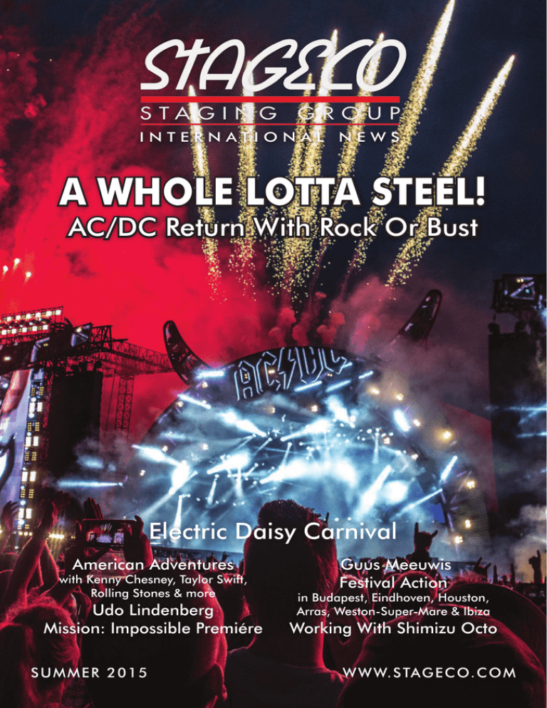 INTERNATIONAL NEWS A WHOLE LOTTA STEEL! AC/DC Return With Rock Or Bust Electric Daisy Carnival American Adventures with Kenny Chesney, Taylor Swift, Rolling Stones & more Udo Lindenberg Mission: Impossible Premiére SUMMER 2015 Guus Meeuwis Festival Action in Budapest, Eindhoven, Houston, Arras, Weston-Super-Mare & Ibiza Working With Shimizu Octo W W W. S TAG E C O. C O M 2 Home And Away INTERNATIONAL NEWS IN THIS ISSUE SUMMER 2015 3 • MISSION: ACCOMPLISHED 4 • ON THE ROAD, OPEN AIR A Dutch Triple 6 • AC/DC... WE SALUTE YOU! 9 • MAIN SQUARE FESTIVAL 10 • AMERICAN ADVENTURES with Tom Frederickx 14 • BUILDING THE FOUNDATION FOR EDC UK 17 • ON AN ISLAND: SZIGET 18 • FLASHBACK: GENESIS 2007 20 • UDO LINDENBERG 21 • BRUSSELS SUMMER FESTIVAL 22 • EASTERN PROMISE 24 • EVOLUTION IN 11 STAGES A lot of people in live production will agree that summer is absolutely the wrong time of the year to take a holiday. It is always the busiest period for Stageco and we particularly like the fact that traffic jams in Belgium become relatively scarce. I normally wait until the winter months to take a proper break, by which time I really need it! Summer may be coming to an end but if you saw our project diary, you might doubt it. Some of our major outdoor tours, like One Direction and AC/DC, are continuing in America way into September, with the latter going off to Australasia towards the end of the year, and the whole dance scene in the States carries on and keeps us very active. The fashion world is about to wake up again with shows in Paris that will involve our staging systems and crews. Elsewhere, it is business as usual. Our German office has enjoyed a lively season and they have a series of jobs coming up in the corporate world. Traditionally, the corporates slow down for the summer but pick up again from September onwards with a number of sophisticated events that we always look forward to servicing. September is usually a busy month for the local Belgian event market with small festivals in Brussels, while we are also getting ready to work on several indoor shows in Ghent and Antwerp at venues like the Sportpaleis. As autumn gets underway and the office starts to relax with some members of staff going away on leave, we take the opportunity to bring our admin up to date, and when the equipment returns home we will begin a maintenance program. There’s always something going on here. The exhibition season is also on the horizon and I hope to meet some of you at the PLASA Show, where I’m delighted to have been invited to deliver the keynote address at the Rigging Conference on October 5th. Tot binnenkort! Hedwig De Meyer, Stageco President SUMMER 2015 STAGECO INTERNATIONAL NEWS S TA G E C O Mission: Accomplished D E U TS C HL AND standard Stageco materials, this job also called for special components, mainly for handrails, columns and façade elements. This project posed a special challenge in that the lead time for planning was a very short three weeks, and space in front of the Opera was extremely tight – Vienna’s Ringstrasse had to be temporarily closed. Live Nation UK, the client, was reportedly delighted with the outcome of an event that proved to be a resounding success. STAGECO INTERNATIONAL NEWS Photography © Malcolm Birkett Written and directed by Christopher McQuarrie, Mission: Impossible – Rogue Nation is the fifth installment of the American spy movie series and so far it has grossed more than $2 billion at box offices worldwide. Principal filming began during August 2014 in Vienna where, Tom Cruise’s lead character Ethan Hunt was spotted in scenes on the roof of the city’s State Opera House. Adding context to the proceedings, it was Cruise’s wish for the world premiere of the film to be held in Vienna and the ‘red carpet date’ was set for July 23rd 2015, with Stageco’s German office hired as one of the key production contractors alongside Chromatic Productions, PRG, Faber Audiovisuals, AEP, AKB and Zeros. The ground-level red carpet in front of the Opera House ended in a circular interview platform, and the stars approached it via two staircases descending from a 60 metre long, six metre high platform that included a cantilever section measuring around 20 metres. Besides the 3 SUMMER 2015 AND SUMMER 2015 Photography courtesy of Stageco Nederland from the Netherlands. The biggest highlight of the year for Meeuwis, however, came at the Philips Stadion in Eindhoven when his ‘summer carnival’ show, Groots Met Een Zachte G (Groots With A Soft G), played its 10th consecutive season over five nights in June. Stageco Nederland has been involved in all of Meeuwis’ stadium shows since 2006 when the company supplied six trucks of equipment. The star’s production values have since grown to the extent where, in 2015, Stageco NL provided 16 trucks to fulfil the requirements of the set designer and technical producer. Arjan Bettink headed the Stageco crew in Eindhoven, where much of their work was focused on constructing the roof (‘recycled’ from previous Johnny Hallyday tours) and a centre structure based on Stageco’s 1036 Super Towers with 1800 trusses, as well as a large amount of Layher scaffolding for the stage wings. Out in the field, the crew also built a pair of black steel followspot/delay towers. On June 20th, the last night of Meeu- wis’ five-night run at the stadium, Dutch TV channel RTL4 broadcast the artist’s entire concert live to an estimated 1.2 million viewers. Meanwhile, tickets for Meeuwis’ return to the Philips Stadion in 2016 are being snapped up fast. Here’s to another successful 20 years! THE MUMFORDS RETURN Just eight days after performing underneath a Stageco roof this summer at Rock Werchter, English modern folk-rock giants Mumford & Sons played to an open-air audience of over 40,000 at Goffertpark in Nijmegen as part of the band’s latest Gentlemen Of The Road tour. The Mumfords’ current live activity follows