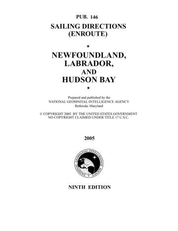 PUB. 146 SAILING DIRECTIONS (ENROUTE) ★ NEWFOUNDLAND, LABRADOR, AND HUDSON BAY ★ Prepared and published by the NATIONAL GEOSPATIAL-INTELLIGENCE AGENCY Bethesda, Maryland © COPYRIGHT 2005 BY THE UNITED STATES GOVERNMENT NO COPYRIGHT CLAIMED UNDER TITLE 17 U.S.C. 2005 NINTH EDITION For sale by the Superintendent of Documents, U.S. Government Printing Office Internet: http://bookstore.gpo.gov Phone: toll free (866) 512-1800; DC area (202) 512-1800 Fax: (202) 512-2250 Mail Stop: SSOP, Washington, DC 20402-0001 Preface Pub.146, Sailing Directions (Enroute) Newfoundland, Labrador, and Hudson Bay, Ninth Edition, 2005, is issued for use in conjunction with Pub. 140, Sailing Directions (Planning Guide) North Atlantic Ocean, Baltic Sea, North Sea, and the Mediterranean Sea. Companion volumes are Pubs. 141, 142, 143, 145, 147, and 148. This publication has been corrected to 22 October 2005, including Notice to Mariners No. 43 of 2005. 0.0 0.0 Explanatory Remarks Sailing Directions are published by the National GeospatialIntelligence Agency (NGA), under the authority of Department of Defense Directive 5105.40, dated 12 December 1988, and pursuant to the authority contained in U. S. Code Title 10, Sections 2791 and 2792 and Title 44, Section 1336. Sailing Directions, covering the harbors, coasts, and waters of the world, provide information that cannot be shown graphically on nautical charts and is not readily available elsewhere. Sailing Directions (Enroute) include detailed coastal and port approach information which supplements the largest scale chart produced by the National Geospatial-Intelligence Agency. This publication is divided into geographic areas called “Sectors.” Bearings.—Bearings are true, and are expressed in degrees from 000˚ (north) to 360˚, measured clockwise. General bearings are expressed by initial letters of points of the compass (e.g. N, NNE, NE, etc.). Adjective and adverb endings have been discarded. Wherever precise bearings are intended degrees are used. Coastal Features.—It is assumed that the majority of ships have radar. Available coastal descriptions and views, useful for radar and visual piloting are included in geographic sequence in each Sector. Corrective Information.—Corrective information and other comments about this publication can be forwarded to NGA, as follows: 1. Mailing address: Maritime Division National Geospatial-Intelligence Agency ST D 44 4600 Sangamore Road Bethesda MD 20816-5003 2. E-mail address: [email protected] New editions of Sailing Directions are corrected through the date of the publication shown above. Important information to amend material in the publication is available as a Publication Digital Update (PDU) from the NGA Maritime Division website. 0.0 0.0 0.0 0.0 0.0 0.0 0.0 0.0 0.0 0.0 0.0 0.0 0.0 0.0 NGA Maritime Division Website (PDUs) http://164.214.12.145/sdr 0.0 0.0 Courses.—Courses are true, and are expressed in the same manner as bearings. The directives “steer” and “make good” a course mean, without exception, to proceed from a point of origin along a track having the identical meridianal angle as the designated course. Vessels following the directives must allow for every influence tending to cause deviation from such track, 0.0 Pub. 146 and navigate so that the designated course is continuously being made good. Currents.—Current directions are the true directions toward which currents set. Dangers.—As a rule outer dangers are fully described, but inner dangers which are well-charted are, for the most part, omitted. Numerous offshore dangers, grouped together, are mentioned only in general terms. Dangers adjacent to a coastal passage or fairway are described. Distances.—Distances are expressed in nautical miles of 1 minute of latitude. Distances of less than 1 mile are expressed in meters, or tenths of miles. Geographic Names.—Geographic names are generally those used by the nation having sovereignty. Names in parentheses following another name are alternate names that may appear on some charts. In general, alternate names are quoted only in the principal description of the place. Diacritical marks, such as accents, cedillas, and circumflexes, which are related to specific letters in certain foreign languages, are not used in the interest of typographical simplicity. Geographic names or their spellings do not necessarily reflect recognition of the political status of an area by the United States Government. Heights.—Heights are referred to the plane of reference used for that purpose on the charts and are expressed in meters. Index-Gazetteer.—Navigational features and place-names are listed alphabetically in the back of the book. The approximate position, along with the Sector and paragraph numbers (e.g. 1.1), facilitate location in the text. Internet Links.—This publication provides internet links to web sites concerned with maritime navigational safety, including but not limited to, Federal government sites, foreign Hydrographic Offices, and foreign public/private port facilities. NGA makes no claims, promises, or guarantees concerning the accuracy, completeness, or adequacy of the contents of the web sites and expressly disclaims any liability for errors and omissions of these web sites. Light and Fog Signals.—Lights and fog signals are not described, and light sectors are not usually defined. The Light Lists should be consulted for complete information. Ports.—Directions for entering ports are depicted where appropriate by means of chartlets, sketches, and photos, which facilitate positive identification of landmarks and navigational aids. These chartlets and sketches are not always to scale, however, and should be used only as a general informational guide in conjunction with the best scale chart. Specific port facilities are omitted from the standard format. They are tabulated in Pub. 150, World Port Index. Radio Navigational Aids.—Radio navigational aids are not described in