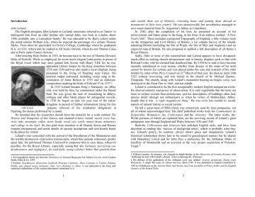 Introduction John Leland The English antiquary John Leland or Leyland, sometimes referred to as ‘Junior’ to distinguish him from an elder brother also named John, was born in London about 1506, probably into a Lancashire family.1 He was educated at St. Paul’s school under the noted scholar William Lily, where he enjoyed the patronage of a certain Thomas Myles. From there he proceeded to Christ’s College, Cambridge where he graduated B.A. in 1522. Afterwards he studied at All Souls, Oxford, where he met Thomas Caius, and at Paris under Francis Sylvius. After entering Holy Orders in 1525, he became tutor to the son of Thomas Howard, Duke of Norfolk. While so employed, he wrote much elegant Latin poetry in praise of the Royal Court which may have gained him favour with Henry VIII, for he was appointed Library keeper by the King sometime between 1528 and 1530 and was also made a royal chaplain, being presented to the living of Pepeling near Calais. His poetical output continued, including verses sung at the coronation of Anne Boleyn in 1533 and an elaborate composition marking the birth of Edward VI in 1537.2 In 1533 Leland became King’s Antiquary, an office only ever held by him, by commission under the Broad Seal. He was given the task of researching in abbeys, colleges and other likely places for antiquarian records. In 1536 he began an epic six year tour of the entire Kingdom in pursuit of further information, being for this John Leland purpose relieved of his residential obligations at Pepeling, his duties performed by a curate. He intended that his researches should form the material for a work entitled The History and Antiquities of this Nation, and claimed to have visited ‘nearly every bay, river, lake, mountain, valley, moor, heath, wood, city, castle, manor house, monastery and college in the land’. He also paid close attention to all Danish, Saxon and Roman remains encountered, and noted details of ancient inscriptions and coin hoards found in the places he visited. Leland’s tour coincided with the period of the Dissolution of the Monasteries and the terrible destruction of priceless manuscripts, which this episode witnessed, greatly upset him. He petitioned Thomas Cromwell to empower him to save these, wherever possible, for the Royal Library, especially seeing that >the Germans, perceiving our desidiousness and negligence, do send daily young scholars hither that spoileth them and cutteth them out of libraries, returning home and putting them abroad as monuments of their own country’. He was unsuccessful, but nevertheless managed to save much material from St. Augustine’s Abbey at Canterbury. In 1545, after the completion of his tour, he presented an account of his achievements and future plans to the King, in the form of an address entitled ‘A New Year’s Gift’. These included a projected Topography of England, a fifty volume work on the Antiquities and Civil History of Britain, a six volume Survey of the islands adjoining Britain (including the Isle of Wight, the Isle of Man and Anglesey) and an engraved map of Britain. He also proposed to publish a full description of all Henry’s Royal Palaces. Sadly, little or none of this materialised and Leland appears to have dissipated much effort in seeking church advancement and in literary disputes such as that with Richard Croke, who he claimed had slandered him. By 1550 he is said to have become mentally unbalanced or even insane, whether from disease or the strain of his work cannot be known for certain, and was placed under the care and restraint of his elder brother by order of the Privy Council on 21st March of that year. He died on April 18th 1552 without recovering, and was buried in the church of St. Michael Querne, Cheapside. The church, along with Leland’s monument bearing an elegaic verse, was destroyed in the Great Fire in 1666, and not rebuilt. Leland is considered to be the first recognisably modern English antiquarian writer. He showed industry and power of observation. It is only regrettable that his taste ran more to written records than architecture, and his descriptions of buildings often lack precise detail (though not enthusiasm) as when he writes of Malmesbury Abbey simply that it was ‘a right magnificent thing’. He was even less careful to record aspects of natural history or social custom. He left a great mass of MSS which was extensively used by later antiquaries, not all of whom acknowledged him.3 His chief published works were his Commentarii de Scriptoribus Britannicis , his Collectanea and the Itinerary. The latter works, the Welsh portions of which are reprinted here, are the surviving record of Leland’s great antiquarian tour through England and Wales between 1536 and 1542. Both the Collectanea and Itinerary lack polished English style, and have been described as reading like ‘masses of undigested notes’, which is probably what they are. Leland’s poetry, by contrast, always shows grace and imagination. Leland’s historical scholarship shows him to be sound in genealogical matters but he shared with Humphrey Llwyd and Sir John Prys a preference for the Arthurian fables of Geoffrey of Monmouth and an aversion to the very proper scepticism of Polydore Vergil. 4 1 All biographical details are from the Dictionary of National Biography Ed. Sidney Lee vol. xxxiii London Smith, Elder & Co. 1893 2 Entitled Genethliacon illustrissimi Eaduerdi Principis Cambriae, Ducis Coriniae et Comitis Palatini, libellus ante aliquot annos inchoatus. Nunc vero absolutus et editus, it was dedicated to the King and contained explanations of the ancient placenames mentioned in it. 3 William Camden, for instance, was charged by Ralph Brooke, in his Discoverie of Certaine Errours, with ‘feathering his nest with Leland’s plumes’ when composing the Britannia. 4 His defence of the authenticity of the Arthurian cycle was entitled Assertio inclytissimi Arturij, regis Britanniae. A single MS