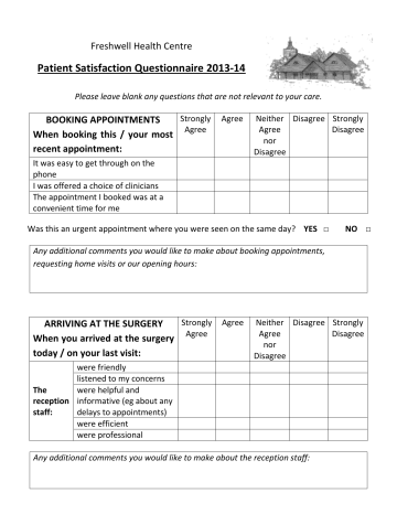 Freshwell Health Centre Patient Satisfaction Questionnaire 2013-14 Please leave blank any questions that are not relevant to your care. Strongly BOOKING APPOINTMENTS When booking this / your most Agree recent appointment: Agree Neither Disagree Strongly Agree Disagree nor Disagree It was easy to get through on the phone I was offered a choice of clinicians The appointment I booked was at a convenient time for me Was this an urgent appointment where you were seen on the same day? YES □ NO □ Any additional comments you would like to make about booking appointments, requesting home visits or our opening hours: Strongly Agree Neither Disagree Strongly ARRIVING AT THE SURGERY Agree Disagree When you arrived at the surgery Agree nor today / on your last visit: Disagree were friendly listened to my concerns The were helpful and reception informative (eg about any staff: delays to appointments) were efficient were professional Any additional comments you would like to make about the reception staff: Continued overleaf Strongly THE WAITING ROOM Whilst you were waiting today / Agree on your last visit: Agree Neither Disagree Strongly Agree Disagree nor Disagree A wide range of health promotion information was displayed Useful information about the surgery was provided (including updates about any delays to appointments) Any additional comments you would like to make about the waiting room facilities: CLINICAL CARE At this / your last appointment with the doctor or nurse: Strongly Agree Agree Neither Disagree Strongly Agree Disagree nor Disagree After arriving at the surgery, the wait to see the doctor or nurse was reasonable I was happy with the medical care I received The doctor or nurse listened to my concerns Adequate time was given to my problem I received clear explanations about my problem I would have liked to be given more lifestyle advice Which type of clinician did you see? DOCTOR □ NURSE □ Any additional comments you would like to make about the consultation or your clinical care: Continued overleaf Strongly Agree Neither Disagree Strongly COLLECTING MEDICATION Agree Agree Disagree Please complete this section if nor you collected medication TODAY Disagree were friendly listened to my concerns The were helpful and dispensary informative staff: were efficient were professional The wait to collect medication was acceptable Any additional comments you would like to make about the dispensary: OUT OF HOURS SERVICE Please complete this section if you have phoned NHS111 in the last 3 months The staff were friendly and helpful The call was answered efficiently I was happy with the clinical care I received Strongly Agree Agree Neither Disagree Strongly Agree Disagree nor Disagree Any additional comments you would like to make about the out of hours service: General Comments Any additional comments you would like to make about our service either at the surgery or within the local community: Continued overleaf About You: This section is optional. You do not have to give details if you do not wish to do so. Gender: MALE FEMALE Current Age: 16 OR UNDER 17-24 25-44 45-64 65-84 85 OR OVER Ethnic Background: White (British, Irish or Other) □ Mixed □ Asian or Asian British □ Black or Black British □ Chinese □ Other Ethnic Group □ Please state _________________ How often do you visit the practice: □ □ □ □ □ □ □ □ Rarely Occasionally Regularly Often □ □ □ □ Thank you for completing this questionnaire. To return completed questionnaires Place in the box in reception Email to [email protected] Fax to 01371 811282 Post to Freshwell Health Centre, Wethersfield Road, Finchingfield, Essex CM7 4BQ