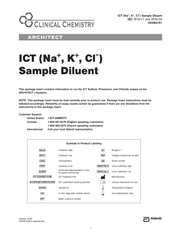 ICT (Na+, K+, Cl¯) Sample Diluent 2P32-11 and 2P32-50 304465/R1 ICT (Na+, K+, Cl¯) Sample Diluent This package insert contains information to run the ICT Sodium, Potassium, and Chloride assays on the ARCHITECT c Systems. NOTE: This package insert must be read carefully prior to product use. Package insert instructions must be followed accordingly. Reliability of assay results cannot be guaranteed if there are any deviations from the instructions in this package insert. Customer Support United States: Canada: International: 1-877-4ABBOTT 1-800-387-8378 (English speaking customers) 1-800-465-2675 (French speaking customers) Call your local Abbott representative Symbols in Product Labeling Calibrator High Reagent 1 Calibrator Low Catalog number/List number Concentration Serial number Contents of kit Urine Calibrator High Authorized Representative in the European Community Urine Calibrator Low ICT Cleaning Fluid Manufacturer ICT Lyophilized Cleaning Solution Consult instructions for use Ingredients Temperature limitation In vitro diagnostic medical device Use by/Expiration date Batch code/Lot number October 2009 ©2009 Abbott Laboratories 1 NAME REAGENT HANDLING AND STORAGE (Continued) ICT (Na+, K+, Cl¯) Sample Diluent Indications of Deterioration The ARCHITECT c Systems ICT (Integrated Chip Technology) is used for the quantitation of sodium, potassium, and chloride in human serum, plasma, or urine. Instability or deterioration should be suspected if there are visible signs of leakage, extreme turbidity, microbial growth, or if ICT Module calibration does not meet the appropriate package insert and/or ARCHITECT System Operations Manual criteria. Acetic acid odor from the diluent is normal. SUMMARY AND EXPLANATION OF TEST WARNINGS AND PRECAUTIONS Sodium is the major cation of extracellular fluid; it plays an essential role in the normal distribution of water and in the maintenance of osmotic pressure in extracellular fluid compartments. Decreased levels of sodium may be caused by an excessive use of diuretics, prolonged vomiting, a decrease in the intake of sodium in the diet, and metabolic acidosis. Increased levels of sodium may be found in Cushing’s syndrome, severe dehydration, or in high levels of salt intake without an adequate supply of water.1 Potassium is the major intracellular cation. The concentration of potassium in the erythrocytes is approximately 23 times the concentration in plasma. For this reason, only unhemolyzed samples must be used. Decreased levels of extracellular potassium are characterized by weakness in the muscles, irritability, paralysis, accelerated heartbeat, and eventually cardiac arrest, and may be caused by a poor intake of potassium in the diet, by a redistribution of extracellular potassium, and by an increased loss of body fluids rich in potassium.1 Abnormally elevated levels of extracellular potassium produce mental confusion, general weakness, numbness, flaccid paralysis in the extremities, a slowed heart rate, and eventually collapse of the peripheral vascular system and cardiac arrest. Causes of increased potassium levels may be linked to inappropriate intravenous therapy, dehydration, shock, diabetic ketoacidosis, and severe burns.1 Chloride is the major extracellular anion. The majority of ingested chloride is absorbed, and the excess is excreted along with other ions into the urine. Low levels of chloride are observed in the case of prolonged vomiting accompanied by the loss of hydrochloric acid (HCl), in some cases of metabolic acidosis in which there is an increased accumulation of organic anions, in critical cases of Addison’s disease, and in kidney disease resulting in loss of salt. Elevated levels of chloride are observed in metabolic acidosis associated with prolonged diarrhea and with loss of sodium bicarbonate (NaHCO3), and in the case of renal tubular diseases in which there is a decreased excretion of hydrogen ion (H+), which causes in turn a decrease in the reabsorption of bicarbonate ion (HCO3–). Elevated levels of serum chloride are also implicated in certain cases of hyperparathyroidism.1 Precautions for Users INTENDED USE 1. 2. 3. 4. SPECIMEN COLLECTION AND HANDLING Suitable Specimens Serum, plasma, and urine are acceptable specimens. • Serum: Use serum collected by standard venipuncture techniques into glass or plastic tubes with or without gel barriers. Ensure complete clot formation has taken place prior to centrifugation. When processing samples, separate serum from blood cells or gel according to the specimen collection tube manufacturer’s instructions. Some specimens, especially those from patients receiving anticoagulant or thrombolytic therapy, may take longer to complete their clotting processes. Fibrin clots may subsequently form in these sera and the clots could cause erroneous test results. For Potassium, hemolyzed specimens must not be used. • Plasma: Use plasma collected by standard venipuncture techniques into glass or plastic tubes. Acceptable anticoagulants are lithium heparin (with or without gel barrier) and sodium heparin (full draw). Ensure centrifugation is adequate to remove platelets. When processing samples, separate plasma from blood cells or gel according to the specimen collection tube manufacturer’s instructions. NOTE: Multiple myeloma and lipid samples are known to give low results on diluted ISE systems due to the high level of proteins/lipids present in the sample.6,7 • Urine: Collect random or 24 hour urine specimens without the addition of preservatives.1 The sample volume for the ICT assays is 15 μL. This volume is mixed with 69 μL of ICT Sample Diluent and 276 μL of system water. For total sample volume requirements, refer to Section 5 of the ARCHITECT System Operations Manual. PRINCIPLES OF PROCEDURE Ion-selective electrodes for sodium, potassium, and chloride utilize membranes selective to each of these ions. An electrical potential (voltage) is developed across the membranes