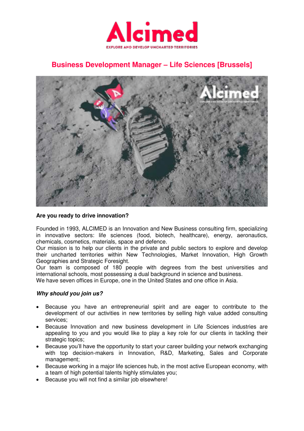 Business Development Manager – Life Sciences [Brussels] Are you ready to drive innovation? Founded in 1993, ALCIMED is an Innovation and New Business consulting firm, specializing in innovative sectors: life sciences (food, biotech, healthcare), energy, aeronautics, chemicals, cosmetics, materials, space and defence. Our mission is to help our clients in the private and public sectors to explore and develop their uncharted territories within New Technologies, Market Innovation, High Growth Geographies and Strategic Foresight. Our team is composed of 180 people with degrees from the best universities and international schools, most possessing a dual background in science and business. We have seven offices in Europe, one in the United States and one office in Asia. Why should you join us? Because you have an entrepreneurial spirit and are eager to contribute to the development of our activities in new territories by selling high value added consulting services; Because Innovation and new business development in Life Sciences industries are appealing to you and you would like to play a key role for our clients in tackling their strategic topics; Because you’ll have the opportunity to start your career building your network exchanging with top decision-makers in Innovation, R&D, Marketing, Sales and Corporate management; Because working in a major life sciences hub, in the most active European economy, with a team of high potential talents highly stimulates you; Because you will not find a similar job elsewhere! Job description Alcimed is looking for an ambitious Business Development Manager in order to develop our Life Sciences activities in the Benelux (Johnson & Johnson, GSK Vaccines, Philips Healthcare, Danone Nutricia,…). You will set up and execute a business & marketing plan to approach new prospects; You will meet and negotiate with top decision-makers and identify their issues and needs; You will establish long-term business relationships with them in order to develop your client portfolio; You will define, along with our Project Managers the appropriate methodologies and elaborate commercial proposals to best answer our client’s needs; You will be at the interface between your clients and ALCIMED’s team of consultants who will execute the projects; You are an entrepreneur eager to create your own Business Unit. Qualifications You hold a Master’s degree or PhD in Medical/ Biomedical Sciences, Engineering or Business You are passionate about Life Sciences, Sales and Innovation You are fluent in French & English or Dutch & English Requested qualities: great interpersonal skills – strong commercial awareness – results oriented – business mindset – taste for challenges – entrepreneurship – tenacity – ambition Join our Brussels team now! Position type: permanent, full time Starting date: ASAP Contact: Please send your CV and cover letter (Job reference: BDM-BE) to: [email protected] +32 2 533 03 48 Visit us at www.alcimed.com