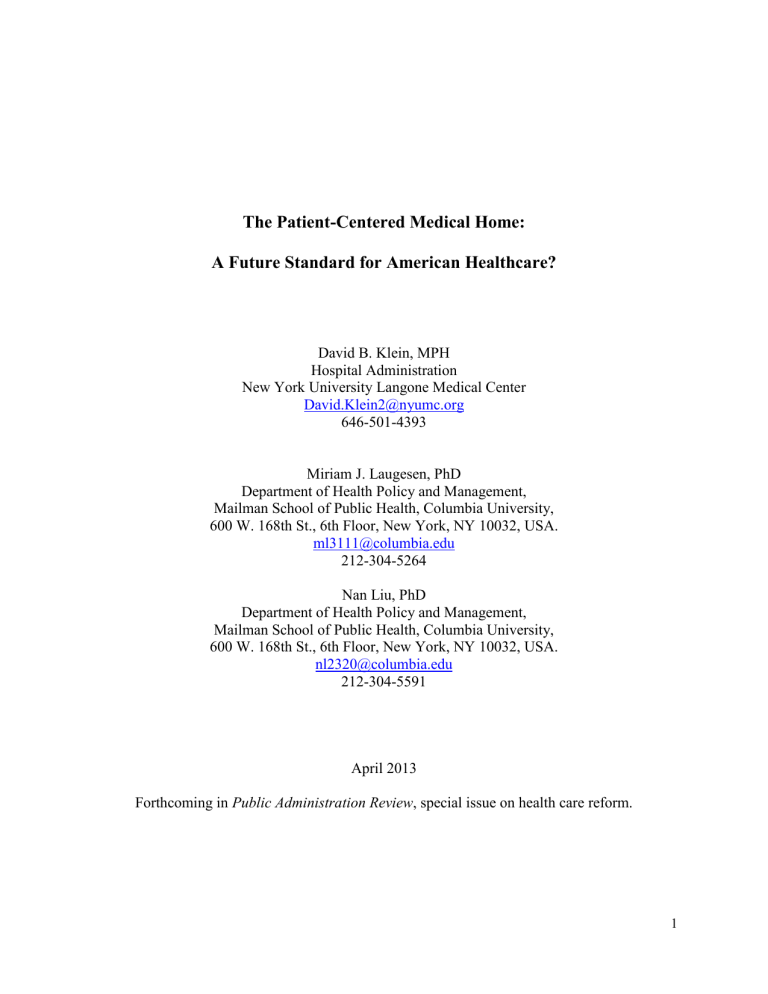 The Patient-Centered Medical Home: A Future Standard for American Healthcare? David B. Klein, MPH Hospital Administration New York University Langone Medical Center [email protected] 646-501-4393 Miriam J. Laugesen, PhD Department of Health Policy and Management, Mailman School of Public Health, Columbia University, 600 W. 168th St., 6th Floor, New York, NY 10032, USA. [email protected] 212-304-5264 Nan Liu, PhD Department of Health Policy and Management, Mailman School of Public Health, Columbia University, 600 W. 168th St., 6th Floor, New York, NY 10032, USA. [email protected] 212-304-5591 April 2013 Forthcoming in Public Administration Review, special issue on health care reform. 1 The Patient-Centered Medical Home: A Future Standard for American Healthcare? Abstract The patient-centered medical home has been promoted as a way of organizing health services delivery to reduce costs while offering superior health outcomes and coordination of care. The Affordable Care Act promotes the patient-centered medical home as a tool to reshape the delivery of health care in the U.S. Preliminary findings from demonstration projects indicate overall positive results in terms of access and quality of care as well as cost containment, and the model should continue to be reviewed for potential national adoption. However, there is significant variation in individual medical home setups, their reimbursement arrangements and evaluation methods, making it difficult to assess, compare and implement. When developing and evaluating this model, policymakers need to provide continuous support for practice transformation, adopt consistent outcome measures, and have realistic expectations about the timeline for such transformation. Key words: Patient-Centered Medical Home, Patient Protection and Affordable Care Act, Health Care Reform, Health Care Costs, United States. 2 Introduction Within the contentious landscape of United States’ health care reform, the patient-centered medical home (PCMH) has emerged as an alternative practice model aimed at reducing costs, coordinating care efforts, utilizing health information technology and, ultimately, obtaining higher quality and better health outcomes for patients. The concept of PCMHs is woven into the Patient Protection and Affordable Care Act (ACA) and broadly defined in Section 3502 to further population health initiatives for communities, as well as preventive health and ongoing care for chronic illnesses, among other care aspirations. As stated in Section 3502 of the ACA, healthcare providers involved in medical homes should “develop and implement interdisciplinary, interprofessional care plans that integrate clinical and community preventive and health promotion services for patients” (The Patient Protection and Affordable Care Act 2010). The purpose of this paper is to describe the concept of the PCMH and discuss its goals, potential benefits, and challenges. We also shed light on whether the PCMH model is a suitable healthcare delivery model for more widespread adoption. We based our discussion on an analysis of recent literature regarding this model, including materials from recent and ongoing national demonstration projects. In particular, we seek to answer the following three questions: (1) What is a patient-centered medical home? (2) Is the patient-centered medical home a valuable and effective model for U.S. healthcare? (3) Are Affordable Care Act demonstration projects and guidelines and current private recognition bodies’ standards sufficient and appropriate for encouraging the national adoption of patient-centered medical homes? 3 To organize our discussion, we start with describing the history of PCMH and its connection to governance and policy, which is followed by an introduction to the basic features of PCMHs. Then, we discuss the benefits and challenges presented by such a practice setup. We reflect on several recent PCMH demonstration projects, including the National Demonstration Project, which is the first national evaluation of the PCMHs, as well as three major ongoing federal PCMH initiatives run by the Centers for Medicare and Medicaid Services. Finally, we conclude the paper with policy implications and recommendations for research and practice. Background The patient-centered medical home aims to engage patients and their providers into a collaborative partnership that places the patient as its focal point. The American Academy of Pediatrics originally introduced the concept of a medical home in 1967 as a coordinated-care model for children (Patient-Centered Primary Care Collaborative 2007). The model was adopted by a number of specialty pediatric clinics to facilitate the management of patients with complex medical problems. Subsequently, the concept entered the American healthcare discussion in the early 2000s in response to some common problems with primary care: lack of care coordination and communication with or among providers, frustration reaching physicians for questions or obtaining follow-up appointments, and perverse incentives with fee-for-service payment schemes. With its more focused and cohesive provision of care, the PCMH model aims to offer higher quality care for patients, while achieving lower costs through timely, preventive services with providers and enhanced patient engagement throughout the continuum of care. Most recently, the ACA broadly defines patient-centered medical home in Section 3502 (discussed below). The legislation's broad definition of the PCMH provides the flexibility needed to meet the health care needs of diverse communities and encourages adoption. Federal 4 funding for demonstration projects is designed to encourage the diffusion of the model nationally and beyond pediatrics; such an expansion would be unlikely without such support. For instance, half of the states have been implementing PCMHs for their Medicaid populations (Nutting et al. 2010). Regarding the scale and scope of the curren
