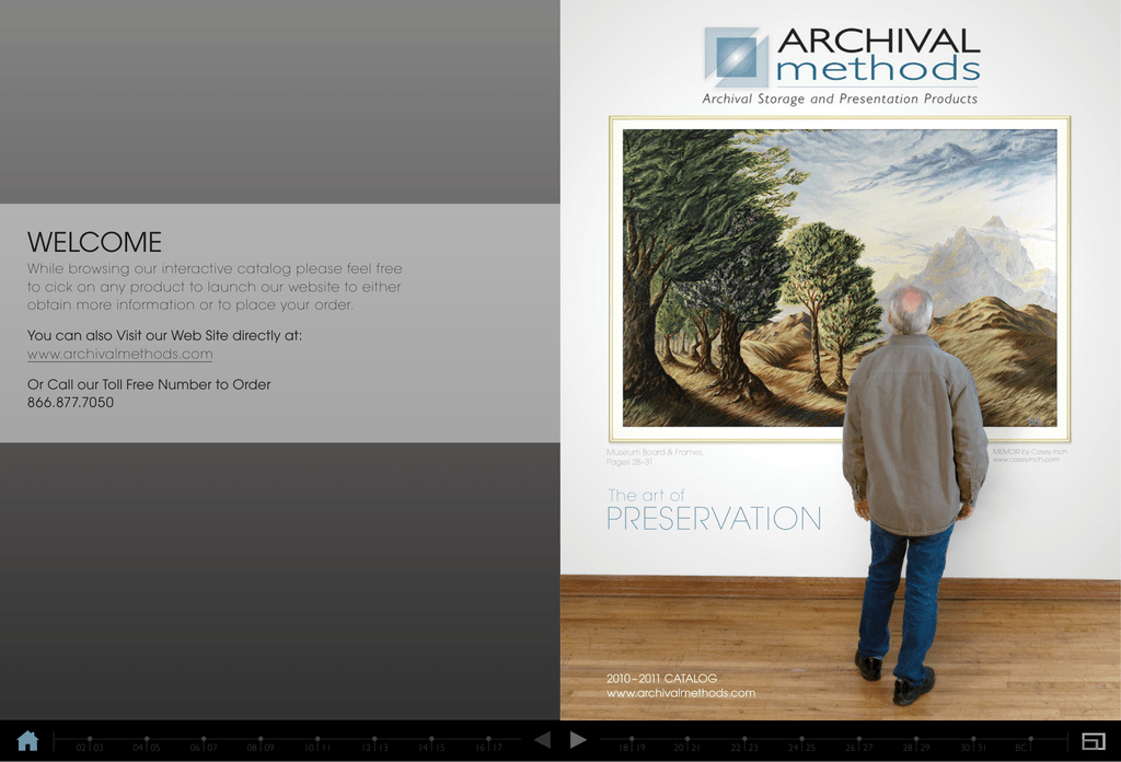 WELCOME While browsing our interactive catalog please feel free to cick on any product to launch our website to either obtain more information or to place your order. You can also Visit our Web Site directly at: www.archivalmethods.com Or Call our Toll Free Number to Order 866.877.7050 Museum Board & Frames, Pages 28–31 MEMOIR by Casey Inch www.caseyinch.com The art of PRESERVATION 2010 – 2011 CATALOG www.archivalmethods.com 02 | 03 04 | 05 06 | 07 08 | 09 10 | 11 12 | 13 14 | 15 16 | 17 18 | 19 20 | 21 22 | 23 24 | 25 26 | 27 28 | 29 30 | 31 BC | Index Digital Print & Leather Portfolios CUSTOM PRODUCTS Portfolios & Cases Accent Portfolios. . . . . . . . . . . . . . . . . . . 4 Carry Case. . . . . . . . . . . . . . . . . . . . . . . . . . . . . 7 Digital/Leather Print Folios.. . . . . . 3 DTC Carry Case.. . . . . . . . . . . . . . . . . . . . 7 Gallery Portfolio.. . . . . . . . . . . . . . . . . . . . . 3 Jewel Case. . . . . . . . . . . . . . . . . . . . . . . . . . . 13 Museum Case.. . . . . . . . . . . . . . . . . . . . . . . . 6 Onyx Portfolio.. . . . . . . . . . . . . . . . . . . . . . . 5 Tenba Cases.. . . . . . . . . . . . . . . . . . . . . . . . . . 6 Transport Shipping Case.. . . . . . . . . 7 Boxes 4x6" Print Boxes.. . . . . . . . . . . . . 16-17 CD Storage Box. . . . . . . . . . . . . . . . . . . 14 Collection Edition Boxes.. . . . . . . 23 Label Holders. . . . . . . . . . . . . . . . . . . . . . . 12 Metal Edge. . . . . . . . . . . . . . . . . . . . . . 19-22 Print Lux Boxes. . . . . . . . . . . . . . . . . . . . 22 Proof Boxes.. . . . . . . . . . . . . . . . . . . . . . . . . 23 Record Storage Boxes.. . . . . . . . . . 19 Safe Ship Boxes. . . . . . . . . . . . . . . . . . . . 23 Textile Storage Box.. . . . . . . . . . . . . . 18 Binders & Albums Accent Binder Box. . . . . . . . . . 12-13 Accent Album. . . . . . . . . . . . . . . . . . . . . . . . 8 Album Mount Hinge. . . . . . . . . . . . . . . 8 Binder / File Hangers.. . . . . . . . . . . . . . 9 Binder Box. . . . . . . . . . . . . . . . . . . . . . . . . . . . . 9 CD / DVD Pages.. . . . . . . . . . . . 12-13 Collector Grade Binders.. . 10-11 Page Protectors. . . . . . . . . . . . . . . . . . . . 10 Print and Slide Pages. . . . . . . . . . . . . 11 Ring Folio. . . . . . . . . . . . . . . . . . . . . . . . . . . . . . . 9 Enclosures Crystal Clear Bags.. . . . . . . . . . . . . . . 26 File Folders. . . . . . . . . . . . . . . . . . . . . . . . . . . 27 HD Poly Envelopes.. . . . . . . . . . . . . . 25 Paper Envelopes. . . . . . . . . . . . . . . . . . . 26 Polyethylene Bags.. . . . . . . . . . . . . . . . . 25 Kit & Accessories 35mm Slides Box Storage.. . . . 15 CD / DVD Storage. . . . . . . . . . 13-14 Desiccant Canisters.. . . . . . . . . . . . . . 18 Film Storage Kits. . . . . . . . . . . . . . . . . . . 15 Mounting Corners.. . . . . . . . . . . . . . . . 30 Newspaper Storage Kits. . . . . . . . 18 QPO 4x6" Print Storage. . 16-17 White Gloves. . . . . . . . . . . . . . . . . . . . . . . 16 Tapes.. . . . . . . . . . . . . . . . . . . . . . . . . . . . . . . . . . 29 Sleeves CD / DVD Sleeves.. . . . . . . . . . . . . . . 14 Clear Mount Sleeves. . . . . . . . . . . . . 10 Print and Film Sleeves.. . . . . . . . . . . 24 Side Loading.. . . . . . . . . . . . . . . . . . . . . . . . 24 Frames Custom Cut Frames.. . Web Site Complete Frame Kits. . . . . . . . . . . . 30 Pre-Cut Aluminum Frames. . . . 31 UV Filtering Acrylite. . . . . . . . . . . . . . 31 Board & Paper 100% Museum Board.. . . . . . . . . . 28 Archival Paper & Tissue.. . . . . . . . 27 Acid Free Foamboard.. . . . . . . . . . . 31 Conservation Board. . . . . . . . . . . . . . 29 Pre-Cut Mats.. . . . . . . . . . . . . . . . . . . . . . BC Custom Mat Cutting Window mats should enhance your print or artwork and sometimes Pre-Cut sizes just aren’t the right size. Our easy to follow custom mat cutting form on our website, makes placing your order quick and easy. There are five easy steps and the price calculates automatically with a diagram previewing the measurements. Find under Board & Paper, http://www.archivalmethods.com Each portfolio is available in the most popular digital sizes and will store up to six matted prints and between 36 and 48 un-mounted prints, depending on paper weight. Digital Print Folio *U nless otherwise noted, all specified dimensions are interior dimensions for our boxes, portfolios and cases. Custom Frames Aluminum section frames are sold in pairs and are available in lengths of 7” to 81”. Frames are cut to your specifications with a 1⁄8” allowance for fitting the artwork and the acrylite or glass. The form easily allows you to select the frame profile & color you choose then enter the width, height & quantity of frames. Find under Frames on website. Digital Print Folio 1⁄2" Depth Custom Museum Cases, Boxes & Portfolios We offer several sizes and styles of cases, boxes and portfolios, but understand that our stock items might not meet your needs or visions. Minimum quantities and additional information can be found under Imprints & Custom Products on website. 11 x 14" Packages of 5 70-014 111⁄4 x 141⁄4" 34.25 30.85 29.10 70-017 11 ⁄4 x 17 ⁄4" 35.25 31.75 29.95 70-019 13 ⁄4 x 19 ⁄4" 42.60 38.35 36.20 70-022 171⁄4 x 221⁄4" 51.00 45.90 43.35 3 1 1 1 241⁄4 x 321⁄4" 04 | 05 06 | 07 08 | 09 10 | 11 12 | 13 1–9 10-49 50+ $16.75 $15.10 $14.25 14 | 15 Leather Portfolio 124.95 112.45 106.20 Black Burgundy Navy Blue Size 73-5811 73-6811 73-7811 8 ⁄4 x 11 ⁄4" $40.75 $36.70 $34.65 73-51114 73-61114 73-71114 11 ⁄4 x 14 ⁄4" 46.95 42.25 39.90 73-51117 73-61117 73-71117 111⁄4 x 171⁄4" 54.70 49.25 46.50 73-51319 73-61319 73-71319 13 ⁄4 x 19 ⁄4" 59.40 53.45 50.50 73-51722 73-61722 73-71722 17 ⁄4 x 22 ⁄4" 71.85 64.65 61.05 3 1 1 1 1 1 1 1 1 2-9 10+ Gallery Portfolio Box When a special, valuable or unique collection demands the highest level of presentation, we recommend our Gallery Portfolio Box. These elegant