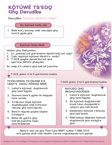 KÕTÚWÉ TS’EDÔ Ghô Daæudíkœ Daæudíkœ: Kõtúwé dáreht’e nedô? Du kõtúwé hedô yíle 1. 1. Bebí kut’î keniwê nídé æekudôle ghô kuts’é gôdœ gha Kõtúwé Hedô Nídé Hederi ghô Dahunihke: 1. Líi yedaidz’îné gok’énehta dáreht’edz’îné æîdô? 2. Æîdô æegúhy£ kõtúwé dáreht’e nedô? 3. T-ACE gogha denek’áts’œdi gha (got’ane déhtl’e gháyîda) Sú æedô k’é æahêt’e gha bek’ek’ñnanihta. T-ACE gháré: 0 hé 5 gok’énehta hudéta TS’ÉKUWEKE TS’ÕDANE K’É ÆAKÎT’E HAGÚ ÆEKEDÔ NÍDÉ: 1. Lahot’e kõtúwé dugháwodi ghô bets’égôdœ. 2. Gonezó bets’é gôdœ hé bégôdœ hîka æanídœ. 3. Ts’ékuwe dúyé kõtúwé dughákeyçdi nídé k’éts’ene æekudô ghô bets’égodœ. 4. Bets’é rágudœ gogha begha k’ñnagôæa. 5. Behé dá gôht’e ghô bek’ek’ñnanihta hagú bets’érádanidi T-ACE gháré: 2 hé 5 gok’énehta hudéta RAÆUDÔ GHÔ BEGHÔæAGODEDI: 1. Lahot’e kõtúwé dugháwodi ghô bets’égôdœ. 2. Sú kõtúwé dugháwodik’ éæadi hésú duyáyedik’é æahêt’e gha bek’ánœdi 3. Dádéhshó kõtúwé t’áæenitô gha bek’ánœdi 4. Ráík’ódeyô dágháré kõtúwé dugháwodi gha sórígõæa gha Nets’é ráts’udi gha Tele-Care NWT æudítai 1-888-1010 ts’é gahdœ dódí nídé Health Centre æeghálayeda ts’é gahdœ Adapted from: The College of Physicians and Surgeons of Manitoba (2000). Guidelines 647: Fetal Alcohol Syndrome T- AC ACE E DAÆUDÍKE Dádéhshó kõtúwé gha ráts’ese Kõtúwé dáreht’e nedô hagú negha gonezóæagot’î? Score 2 – kõtúwé rákœ ts’éhæõné Score 0 – kõtúwé rákœ k’éts’ene Dene hek’éch’a æagodi Æidô ghô nets’é gots’œdœ nídé sú nek’éch’a æadedi? Score 1 – hêæê ts’œdi nídé K ’éts’ene æets’údô Sú k’éts’ene æewodô ghô ráæediæîwê? Score 1 – hêæê ts’œdi nídé T s’ets’êwi hñt’ú æets’edô Sú ts’eniwi hñy’ú æîdô? Score 1 – hêæê ts’œdi nídé Ráæedô gha hudœdl’î - Rákœ dódí nídé gots’éæõné hudáta Lahot’e hudeta gha - Lak’e hudáta Adapted from: Sokol et al., 1989 KUÆUDÍTÁÍ