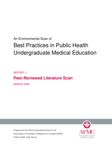 An Environmental Scan of Best Practices in Public Health Undergraduate Medical Education REPORT 1: Peer-Reviewed Literature Scan MARCH 2009 Prepared by the Nevis Consulting Group for the Association of Faculties of Medicine of Canada (AFMC) Public Health Task Group An Environmental Scan of Best Practices in Public Health Undergraduate Medical Education REPORT 1: PEER-REVIEWED LITERATURE SCAN - MARCH 2009 This Environmental Scan was conducted from February to May 2008 and produced by the Nevis Consulting Group: Michael Rowlands President, Nevis Consulting Group Inc. Robert Spasoff, MD, MSc Emeritus Professor of Epidemiology & Community Medicine University of Ottawa Report 5 (Teaching Methods) and additional material on education methods were contributed by: Ingrid Tyler MD, CCFP, MHSc, MEd Community Medicine Resident Dalla Lana School of Public Health University of Toronto Production of this report has been made possible through a financial contribution from the Public Health Agency of Canada. The opinions expressed in this publication are those of the authors/researchers and do not necessarily reflect the official views of the Public Health Agency of Canada or the Association of Faculties of Medicine of Canada. Copyright © 2009 by the Association of Faculties of Medicine of Canada. All rights reserved. This material may be downloaded and printed in full for educational, personal, or public non-commercial purposes only. For all other uses, written permission from the Association of Faculties of Medicine of Canada is required. For enquiries: [email protected] 2 An Environmental Scan of Best Practices in Public Health Undergraduate Medical Education REPORT 1: PEER-REVIEWED LITERATURE SCAN - MARCH 2009 TABLE OF CONTENTS 1. INTRODUCTION ......................................................................................................... 4 2. METHODS................................................................................................................... 5 3. RESULTS .................................................................................................................... 6 3.1 Educational Methods .............................................................................................. 6 Background.......................................................................................................... 6 Developments in the USA .................................................................................... 6 Developments in the UK ...................................................................................... 8 Learning Styles .................................................................................................... 9 Integration............................................................................................................ 10 Role of Family Medicine....................................................................................... 13 Contribution of Clinical Epidemiology ................................................................... 13 Need for Faculty Development............................................................................. 14 Community-Oriented Medical Education .............................................................. 15 Problem-based Learning (PBL)............................................................................ 20 Tutors for PBL...................................................................................................... 23 Case-based Learning........................................................................................... 24 Combined Medicine-Public Health Programs ....................................................... 27 Electives in Public Health..................................................................................... 28 Links with Public Health Agencies........................................................................ 31 International Electives .......................................................................................... 33 Student-Led Teaching.......................................................................................... 33 Distance Learning ................................................................................................ 36 Specific Topics..................................................................................................... 36 Epidemiology ............................................................................................... 36 Statistics ...................................................................................................... 38 Health Systems & Health Policy................................................................... 39 Controversial Topics .................................................................................... 40 Evaluation Methods.............................................................................................. 41 4. COMMENTS ................................................................................................................ 44 5. MAJOR FINDINGS ...................................................................................................... 45 6. SUMMARY TABLE ...................................................................................................... 48 7. REFERENCES ............................................................................................................ 58 3 An Environmental Scan of Best Practices in Public Health Undergraduate Medical Education REPORT 1: PEER-REVIEWED LITERATURE SCAN - MARCH 2009 1. INTRODUCTION This report covers the recent peer-reviewed literature relevant to best practices in undergraduate medical education. Any literature review is at risk of encountering publication bias: published articles do not necessarily represent the most successful educational approaches—they may simply reflect the cultures of the various medical schools, or the teaching loads of faculty