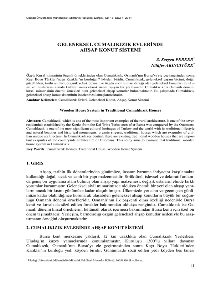 Uludağ Üniversitesi Mühendislik-Mimarlık Fakültesi Dergisi, Cilt 16, Sayı 1, 2011 GELENEKSEL CUMALIKIZIK EVLERİNDE AHŞAP KONUT SİSTEMİ Z. Sevgen PERKER* Nilüfer AKINCITÜRK* Özet: Kırsal mimarinin önemli örneklerinden olan Cumalıkızık, Osmanlı’nın Bursa’yı ele geçirmesinden sonra Kayı Boyu Türkleri’nden Kızıklar’ın kurduğu 7 köyden biridir. Cumalıkızık, geleneksel yaşam biçimi, doğal güzellikleri, tarihi anıtları, organik sokak dokusu ve özgün sivil mimari örneği olan geleneksel konutları ile ulusal ve uluslararası alanda kültürel miras olarak önem taşıyan bir yerleşimdir. Cumalıkızık’da Osmanlı dönemi kırsal mimarisinin önemli örnekleri olan geleneksel ahşap konutlar bulunmaktadır. Bu çalışmada Cumalıkızık geleneksel ahşap konut sisteminin incelenmesi amaçlanmaktadır. Anahtar Kelimeler: Cumalıkızık Evleri, Geleneksel Konut, Ahşap Konut Sistemi Wooden House System in Traditional Cumalıkızık Houses Abstract: Cumalıkızık, which is one of the most important examples of the rural architecture, is one of the seven residentials established by the Kızıks from the Kai Tribe Turks soon after Bursa was conquered by the Ottomans. Cumalıkızık is one of the most significant cultural heritages of Turkey and the world with its traditional lifestyle and natural beauties and historical monuments, organic streeets, traditional houses which are exapmles of civilian unique architecture. In Cumalıkızık residential, there are existing traditional wooden houses that are important exapmles of the countryside architecture of Ottomans. This study aims to examine that traditional wooden house system in Cumalıkızık. Key Words: Cumalıkızık Houses, Traditional House, Wooden House System 1. GİRİŞ Ahşap, tarihin ilk dönemlerinden günümüze, insanın barınma ihtiyacını karşılamakta kullandığı doğal, sıcak ve canlı bir yapı malzemesidir. Strüktürel, işlevsel ve dekoratif anlamda geniş bir uygulama alanı bulmuş olan ahşap yapı malzemesi, değişik ustaların elinde farklı yorumlar kazanmıştır. Geleneksel sivil mimarimizde oldukça önemli bir yeri olan ahşap yapıların ancak bir kısmı günümüze kadar ulaşabilmiştir. Ülkemizde yer alan ve geçmişten günümüze kadar olabildiğince korunarak ulaşabilen geleneksel ahşap konutların büyük bir çoğunluğu Osmanlı dönemi örnekleridir. Osmanlı’nın ilk başkenti olma özelliği nedeniyle Bursa kenti ve kırsalı da sözü edilen örnekler bakımından oldukça zengindir. Cumalıkızık ise Osmanlı dönemi kırsal örneklerini bütüncül olarak içermesi bakımından Bursa kenti için özel bir önem taşımaktadır. Yerleşim, barındırdığı özgün geleneksel ahşap konutlar nedeniyle bu araştırmanın örneğini oluşturmaktadır. 2. CUMALIKIZIK EVLERİNDE AHŞAP KONUT SİSTEMİ Bursa kent merkezine yaklaşık 12 km uzaklıkta olan Cumalıkızık Yerleşkesi, Uludağ’ın kuzey yamaçlarında konumlanmıştır. Kuruluşu 1300’lü yıllara dayanan Cumalıkızık, Osmanlı’nın Bursa’yı ele geçirmesinden sonra Kayı Boyu Türkleri’nden Kızıklar’ın kurduğu yedi köyden biridir. Günümüzde sözü edilen yedi köyden beş tanesi * Uludağ Üniversitesi, Mühendislik-Mimarlık Fakültesi Mimarlık Bölümü, 16059 Görükle, Bursa. 41 Perker, Z.S. ve Akıncıtürk, N.: Geleneksel Cumalıkızık Evlerinde Ahşap Konut Sistemi ayakta kalabilmiş (Cumalıkızık, Hamamlıkızık, Derekızık, Fidyekızık, Değirmenlikızık), ancak Cumalıkızık dışındakiler özgün mimari dokularını koruyamamıştır. Muhtarlıktaki 1685 tarihli vakfiye belgesine göre Orhangazi Vakfiyesi’ne bağlı bir vakıf köyü olarak kurulan Cumalıkızık, günümüzde merkez Yıldırım İlçesi’ne bağlı bir mahalle durumundadır (Anonim 1999). Cumalıkızık Yerleşkesi’nde bulunan geleneksel konutlar, Osmanlı sivil mimarisinin özelliklerini gösteren ve aynı zamanda halk kültürünün de yansıması niteliğini taşıyan yapılardır. Cumalıkızık yerleşimi makro ölçekten mikro ölçeğe kadar incelendiğinde bölgenin en önemli özelliğinin yöresel malzeme ile oluşturulmuş yaşam kültürü olduğu dikkati çekmektedir (Kaprol, 2002, Perker 2002). İki veya üç katlı olan bu konutların zemin katları ahşap hatıllı moloz taş duvar, üst katları ise kerpiç dolgulu ahşap iskelet sistem ile oluşturulmuştur. Beşik ve kırma çatı formuna sahip olan konutların çatı örtü malzemesi alaturka kiremittir. Cephelerde ise daha çok çivit mavi, yeşil, sarı, beyaz gibi renkler izlenmektedir. Şekil 1 ve Şekil 2’de Cumalıkızık evlerinden örnekler görülmektedir. Şekil 1: Cumalıkızık Evlerinden Örnekler Kaynak: Z.S. Perker Arşivi Şekil 2: Cumalıkızık Evlerinden Örnekler Kaynak: Z.S. Perker Arşivi Cumalıkızık geleneksel konutlarına çift kanatlı ahşap avlu kapılarından ulaşılmaktadır. Avluların etrafı ahşap hatıllı moloz taş duvar ile çevrili, döşemeleri ise toprak veya kayrak taşı kaplıdır. Geleneksel konutların zemin katlarında ahır, depo, samanlık, wc ve mutfak gibi mekânlar bulunmaktadır. Zemin katlarda yer alan avlularda üst katlara ulaşmayı sağlayan merdivenler bulunmaktadır. Cumalıkızık’daki üç katlı konutların alçak tavanlı ara katları “Kışlık”, yüksek tavanlı üst katları ise “Yazlık” olarak isimlendirilmektedir. Ara kat, bazen zemin kattaki ahşap hatıllı taş duvarın yükseltilmesi ile bazen de zemin kat duvarı üzerine kerpiç dolgulu ahşap iskelet duvar kurgulanması ile oluşturulmuştur. Ancak kat pencereleri sert kış koşullarına uygun biçimde, üst katlara oranla daha küçük düzenlenmiştir. Odaları genellikle sokağa cephe veren ara katlarda çıkma bulunmamaktadır. Geleneksel Cumalıkızık konutlarının üst katlarında ise yapının en nitelikli mekânları yer almaktadır. Oda ve