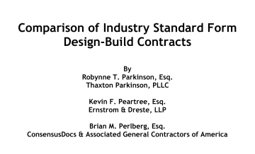 Comparison of Industry Standard Form Design-Build Contracts By Robynne T. Parkinson, Esq. Thaxton Parkinson, PLLC Kevin F. Peartree, Esq. Ernstrom & Dreste, LLP Brian M. Perlberg, Esq. ConsensusDocs & Associated General Contractors of America The Standard Forms Philosophy AIA ConsensusDocs AIA A141 – 2014, Agreement Between Owner and DesignBuilder Exhibit A: Design-Build Amendment Exhibit B: Insurance and Bonds Exhibit C: Sustainable Projects AIA A142 – 2014, Agreement Between Design-Builder and Contractor Exhibit A: Terms and Conditions Exhibit B: Insurance and Bonds Exhibit C: Preconstruction Services Exhibit D: Determination of the Cost of the Work AIA A441 – 2014, Agreement Between Contractor and Subcontractor for a Design-Build Project. AIA B143 – 2014, Agreement Between Design-Builder and Architect AIA C141 – 2014, Agreement Between Owner and Consultant for a Design-Build Project CD 400 Preliminary Design-Build Agreement Between Owner and Design-Builder CD 410 Design-Build Agreement and General Conditions Between Owner and Design-Builder (Cost of Work Plus Fee with GMP) DBIA 501 Contract for Design-Build Consultant DBIA 520 Preliminary Agreement Between Owner and Design-Builder DBIA 525 Owner/Design-Builder Agreement – Lump Sum CD 415 Design-Build Agreement and General Conditions Between Owner and Design-Builder (Lump Sum) DBIA 530 Agreement between Owner and Design-Builder – Cost Plus Fee With an Option for a GMP CD 420 Agreement Between Design-Builder and Design Professional DBIA 535 General Conditions of Contract Between Owner and Design-Builder CD 422 Agreement Between Design-Builder and Design Professional for Federal Projects DBIA 540 Agreement Between Design-Builder and Designer CD 450 Agreement Between Design-Builder and Subcontractor CD 460 Agreement Between Design-Builder and DesignBuild Subcontractor (Subcontractor Provides Design Elements and a GMP) CD 498 Teaming Agreement for a Design-Build Project AIA C441 – 2014, Agreement Between Architect and Consultant for a Design-Build Project. DBIA CD 499 Joint Venture Agreement for a Design-Build Project DBIA 550 Agreement Between Design-Builder and General Contractor – Cost Plus Fee With an Option for a GMP DBIA 555 Agreement Between Design-Builder and General Contractor – Lump Sum DBIA 560 Agreement Between Design-Builder and DesignBuild Subcontractor – Cost Plus Fee With GMP Option DBIA 565 Agreement Between Design-Builder and DesignBuild Subcontractor – Lump Sum DBIA 570 Agreement Between Design-Builder and Subcontractor (Subcontractor Does Not Provide Design Services DBIA 575 Agreement Between Design Consultant and Design-Build Sub-Consultant Comparison of Industry Standard Form Design-Build Contracts – 2016 1 AIA ConsensusDocs Architects should lead the design-build project. Bridging Written in plain English to advance best interests of the project. Coalition of Industry associations identify best practices with fair risk allocation. ConsensusDocs and DBIA possess commonalities. AIA’s answer to the “problem” of owners giving up some direct control over the design process in exchange for the collaborative nature of design-build Presumption but not requirement that Owner retain separate consultant for the development of the Owner’s Criteria DBIA It’s All About “Design-Build Done Right” Promote the value of design-build project delivery and teaches the effective integration of design and construction services Documents designed to incorporate DBIA’s Best Practices documents. Flexible documents usable for a variety of industries. Relationship of the Parties AIA AIA A141, Exhibit A § A.5.6 Relationship of the Parties The Design-Builder accepts the relationship of trust and confidence established by this Agreement and covenants with the Owner to exercise the Design-Builder’s skill and judgment in furthering the interests of the Owner; to furnish efficient construction administration, management services and supervision; to furnish at all times an adequate supply of workers and materials; and to perform the Work in an expeditious and economical manner consistent with the Owner’s interests. ConsensusDocs DBIA CD 410 2.1 TEAM RELATIONSHIP The Parties each agree to proceed with the Project on the basis of trust, good faith and fair dealing and shall take all actions reasonably necessary to perform this Agreement in an economical and timely manner, including consideration of design modifications and alternative materials or equipment that will permit the Work to be constructed within the Guaranteed Maximum Price (GMP) and by the Dates of Substantial Completion and Final Completion if they are established by Amendment 1. DBIA 535 1.1.1 Owner and Design-Builder commit at all times to cooperate fully with each other, and proceed on the basis of trust and good faith, to permit each party to realize the benefits afforded under the Contract Documents. Commentary: All documents mention cooperation among the Parties. The 2014 AIA documents language likely will be interpreted to create a fiduciary relationship between the Owner and Design-Builder. Comparison of Industry Standard Form Design-Build Contracts – 2016 2 When the Design-Builder First Enters the Picture AIA ConsensusDocs Bridging Concept – the design-build process begins with the development of the Owner’s Criteria, before the Design-Builder is retained (AIA C141; AIA A141, §1.1). The Design-Builder’s involvement with bridging under AIA A141 begins with: Changes to the Owner’s Criteria proposed by the Design-Builder Preliminary Evaluation (§4.2) Preliminary Design (§4.3) AIA does not have a preliminary design-build agreement as do DBIA and ConsensusDocs; however, the A141 has optional preliminary design services in §§4.2-4.4: DB evaluates the Owner’s Criteria (§4.2) DB provides preliminary design (§4.3) DB submits a proposal to Owner (§4.4) CD 400 Preliminary Design-Build Agreement Preliminary Design-Build Service