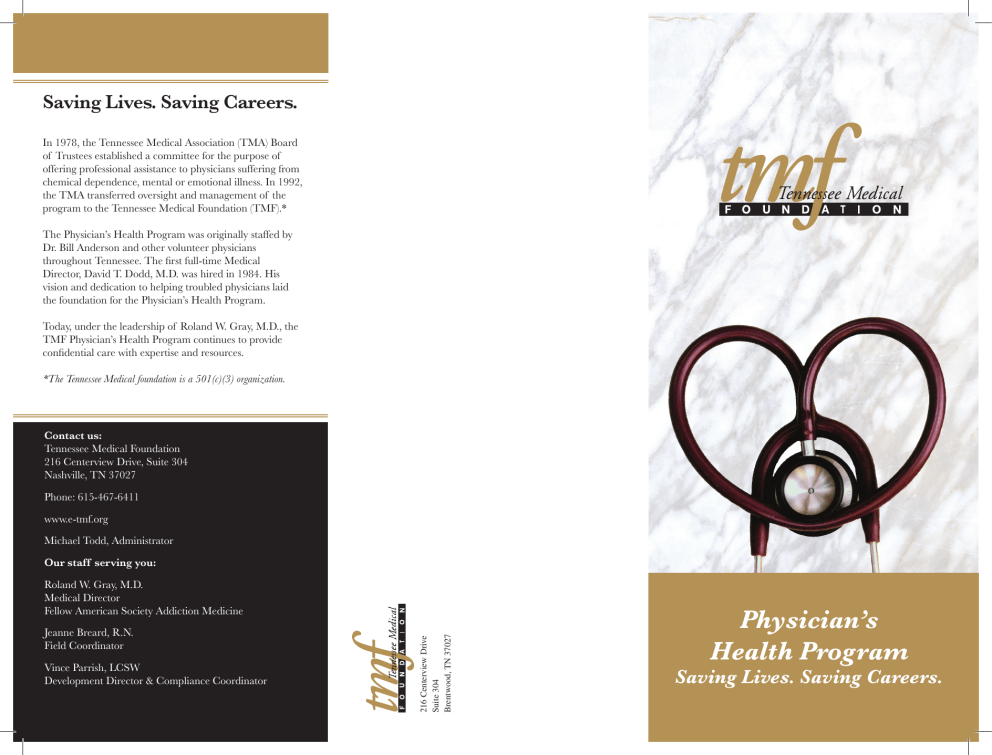 Saving Lives. Saving Careers. In 1978, the Tennessee Medical Association (TMA) Board of Trustees established a committee for the purpose of offering professional assistance to physicians suffering from chemical dependence, mental or emotional illness. In 1992, the TMA transferred oversight and management of the program to the Tennessee Medical Foundation (TMF).* The Physician’s Health Program was originally staffed by Dr. Bill Anderson and other volunteer physicians throughout Tennessee. The first full-time Medical Director, David T. Dodd, M.D. was hired in 1984. His vision and dedication to helping troubled physicians laid the foundation for the Physician’s Health Program. Today, under the leadership of Roland W. Gray, M.D., the TMF Physician’s Health Program continues to provide confidential care with expertise and resources. *The Tennessee Medical foundation is a 501(c)(3) organization. Contact us: Tennessee Medical Foundation 216 Centerview Drive, Suite 304 Nashville, TN 37027 Phone: 615-467-6411 www.e-tmf.org Michael Todd, Administrator Our staff serving you: Jeanne Breard, R.N. Field Coordinator Vince Parrish, LCSW Development Director & Compliance Coordinator 216 Centerview Drive Suite 304 Brentwood, TN 37027 Roland W. Gray, M.D. Medical Director Fellow American Society Addiction Medicine Physician’s Health Program Saving Lives. Saving Careers. Saving Lives. Saving Careers. We expect a lot from our physicians. They are constantly under pressure to perform and when making decisions that will affect the health and well-being of their patients, there is no room for error. However, physicians are human too. The difference is, when physicians suffer from mental, emotional or addictive challenges, it not only jeopardizes their careers and their personal lives - it also poses a serious threat to patient safety. The public has little understanding of troubled physicians and programs that help treat them. Fortunately our Physician’s Health Program addresses concerns that are specific to physicians; concerns only those within the medical profession can appreciate. What is the Tennessee Medical Foundation Physician’s Health Program? The mission of the Physician’s Health Program (PHP) is to protect patients through identification, intervention, rehabilitation, and the provision of advocacy for physicians impaired by addictive disease, mental or emotional illness. In response to requests from hospitals, physician groups and family members, the Tennessee Medical Foundation reshaped the program to assist physicians, their families, and hospitals in addressing a wider range of problems, such as behavioral issues. The PHP has been instrumental in assisting medical schools in Tennessee with programs targeted at medical students and residents. These programs are primarily educational but they also aid medical school faculty in identifying students and residents with the disease of chemical dependency. How Does the Physician’s Health Program Work? ♥ Identification Any family member, patient or colleague may confidentially and/or anonymously report concerns about a physician by phone at (615) 467-6411 or on the TMF website at www.e-tmf.org. ♥ Verification The TMF PHP Medical Director and/or case managers attempt to verify the reported behavior. If the behavior is not verified, the process is halted or the information is held for further inquiry. ♥ Interview If the need for help is substantiated, the physician is asked to make an appointment for an interview with TMF PHP personnel. In exchange for support, the physician is invited to follow the recommendations of the PHP in seeking specified treatment at his or her own expense. ♥ Treatment All treatment is carried out in approved hospitals and treatment facilities. The length of treatment is based upon the physician’s individual needs. Physicians are treated with an initial evaluation and subsequently prescribed inpatient and/or intensive outpatient therapy. ♥ Re-Entry Re-Entry into practice usually occurs within one or two weeks following treatment. During this period, the PHP is often the physician’s strongest - and sometimes only - ally. The PHP Medical Director and case managers work in concert with the treatment center’s recommendations to establish contractual ground rules for re-entry into practice. ♥ Aftercare Aftercare is a minimum five-year process of ongoing monitoring by the TMF. It is guided by an individualized contract comprised of recommendations of the PHP and the treatment facility. The mission of the Physician’s Health Program (PHP) is to protect patients through identification, intervention, rehabilitation, and the provision of advocacy for physicians impaired by addictive disease, mental or emotional illness. Family Involvement Chemical dependency and mental and emotional illnesses affect entire families, not just individual physicians. Families of newly identified physicians are provided opportunities to receive help through support groups, family workshops and professional therapists. The TMF Needs You! No physician is immune from the pressure of the profession. We should know. The TMF has been dedicated to helping Tennessee physicians for over three decades. In addition to operating the Physician’s Health Program, the TMF provides resources and educational materials that can help doctors maintain a healthy and balanced lifestyle. The TMF operates on contributions from individuals, hospitals and grants. You can help support the TMF through tax deductible donations, annual gifts and special events. To help your fellow physicians, donations may be made to the Tennessee Medical Foundation, 216 Centerview Drive, Suite 304, Brentwood, Tennessee 37027 or online at www.e-tmf.org.