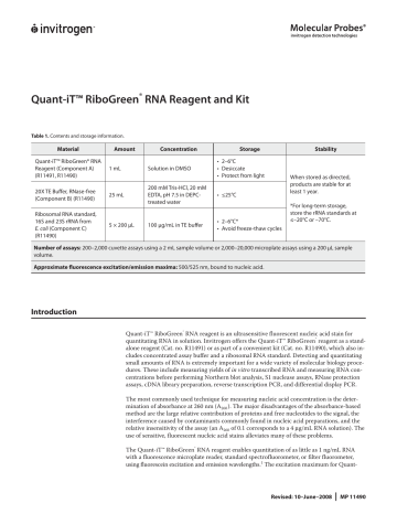 Quant-iT™ RiboGreen® RNA Reagent and Kit Table 1. Contents and storage information. Material Amount Quant-iT™ RiboGreen® RNA Reagent (Component A) (R11491, R11490) 1 mL 20X TE Buffer, RNase-free (Component B) (R11490) 25 mL Ribosomal RNA standard, 16S and 23S rRNA from E. coli (Component C) (R11490) Concentration Solution in DMSO 5 × 200 μL Storage Stability • 2–6°C • Desiccate • Protect from light When stored as directed, products are stable for at least 1 year. 200 mM Tris-HCl, 20 mM EDTA, pH 7.5 in DEPCtreated water • ≤25°C 100 μg/mL in TE buffer • 2–6°C* • Avoid freeze-thaw cycles *For long-term storage, store the rRNA standards at ≤–20°C or –70°C. Number of assays: 200–2,000 cuvette assays using a 2 mL sample volume or 2,000–20,000 microplate assays using a 200 μL sample volume. Approximate fluorescence excitation/emission maxima: 500/525 nm, bound to nucleic acid. Introduction Quant-iT™ RiboGreen® RNA reagent is an ultrasensitive fluorescent nucleic acid stain for quantitating RNA in solution. Invitrogen offers the Quant-iT™ RiboGreen® reagent as a standalone reagent (Cat. no. R11491) or as part of a convenient kit (Cat. no. R11490), which also includes concentrated assay buffer and a ribosomal RNA standard. Detecting and quantitating small amounts of RNA is extremely important for a wide variety of molecular biology procedures. These include measuring yields of in vitro transcribed RNA and measuring RNA concentrations before performing Northern blot analysis, S1 nuclease assays, RNase protection assays, cDNA library preparation, reverse transcription PCR, and differential display PCR. The most commonly used technique for measuring nucleic acid concentration is the determination of absorbance at 260 nm (A260 ). The major disadvantages of the absorbance-based method are the large relative contribution of proteins and free nucleotides to the signal, the interference caused by contaminants commonly found in nucleic acid preparations, and the relative insensitivity of the assay (an A260 of 0.1 corresponds to a 4 µg/mL RNA solution). The use of sensitive, fluorescent nucleic acid stains alleviates many of these problems. The Quant-iT™ RiboGreen® RNA reagent enables quantitation of as little as 1 ng/mL RNA with a fluorescence microplate reader, standard spectrofluorometer, or filter fluorometer, using fluorescein excitation and emission wavelengths.1 The excitation maximum for Quant- Revised: 10–June–2008 | MP 11490 iT™ RiboGreen® reagent bound to RNA is ~500 nm and the emission maximum is ~525 nm. Using a fluorescence microplate reader, as little as 200 pg RNA can be detected in a 200 µL assay volume.1 This sensitivity exceeds that achieved with ethidium bromide–based assays 2 by 200-fold and exceeds that achieved with ultraviolet absorbance determination by 1,000fold. The linear range for quantitation with Quant-iT™ RiboGreen® reagent extends over three orders of magnitude in RNA concentration—from 1 ng/mL to 1 µg/mL RNA—using two dye concentrations 1 (Figure 1). The high-range assay allows quantitation of 20 ng/mL to 1 µg/mL RNA, and the low-range assay allows quantitation of 1 ng/mL to 50 ng/mL RNA. This linearity is maintained in the presence of several compounds commonly found to contaminate nucleic acid preparations, including nucleotides, salts, urea, ethanol, chloroform, detergents, proteins, and agarose.1 In addition, although the Quant-iT™ RiboGreen® reagent also binds to DNA, pretreatment of mixed samples with DNase can be used to generate an RNA-selective assay1 (see Eliminating DNA from Samples at the end of this document). Figure 1. Dynamic range and sensitivity of the Quant-iT™ RiboGreen® RNA assay. For the high-range assay (top panel), Quant-iT™ RiboGreen® reagent was diluted 200-fold into 10 mM Tris-HCl, 1 mM EDTA, pH 7.5 (TE) and 100 μL of the reagent solution was added to microplate wells containing 100 μL ribosomal RNA in TE. For the low-range assay (bottom panel), Quant-iT™ RiboGreen® reagent was diluted 2,000-fold into TE, and 100 μL of the reagent solution was added to microplate wells containing 100 μL of ribosomal RNA in TE. Samples were excited at 485 ± 10 nm and the fluorescence emission intensity was measured at 530 ± 12.5 nm using a fluorescence microplate reader. Fluorescence emission intensity was then plotted versus RNA concentration. Quant-iT™ RiboGreen® Reagent and Kit | 2 Before You Begin Handling and Disposal Prevent RNase contamination of the Quant-iT™ RiboGreen® reagent and kit components. Always use clean disposable gloves while handling all materials. Caution: No data are available addressing the mutagenicity or toxicity of Quant-iT™ RiboGreen® RNA reagent. Because this reagent binds to nucleic acids, treat the reagent as a potential mutagen and handle with appropriate care. Handle the DMSO stock solution with particular caution as DMSO is known to facilitate the entry of organic molecules into tissues. We strongly recommend using double gloves when handling the DMSO stock solution. As with all nucleic acid reagents, pour solutions of Quant-iT™ RiboGreen® reagent through activated charcoal before disposal. The charcoal must then be incinerated to destroy the dye. Preparing Assay Buffer TE buffer (10 mM Tris-HCl, 1 mM EDTA, pH 7.5) is used for diluting the Quant-iT™ RiboGreen® reagent and for diluting RNA samples. Make sure the TE solution is free of contaminating nucleases and nucleic acids. Wear clean disposable gloves during handling and preparation of all materials and solutions. Prepare all solutions in sterile disposable plasticware or nuclease-free glassware, using nuclease-free pipettes. The 20X TE buffer included in the Quant-iT™ RiboGreen® RNA Assay Kit is nuclease-free and nucleic acid–free. Prepare the 1X TE working solution by diluting the concentrated buffer (Component B) 20-fold with nuclease-free water. Prepare nuclease-free