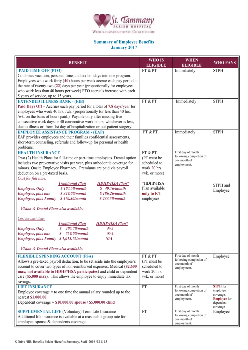 Summary of Employee Benefits January 2017 BENEFIT PAID TIME OFF (PTO) Combines vacation, personal time, and six holidays into one program. Employees who work forty (40) hours per week accrue each pay period at the rate of twenty-two (22) days per year (proportionally for employees who work less than 40 hours per week) PTO accruals increase with each 5 years of service, up to 15 years. EXTENDED ILLNESS BANK - (EIB) Paid Days Off – Accrues each pay period for a total of 7.8 days/year for employees who work 40 hrs. /wk. (proportionally for less than 40 hrs. /wk. on the basis of hours paid.) Payable only after missing five consecutive work days or 40 consecutive work hours, whichever is less, due to illness or, from 1st day of hospitalization or out-patient surgery. EMPLOYEE ASSISTANCE PROGRAM - (EAP) EAP provides employees and their families confidential assessments, short-term counseling, referrals and follow-up for personal or health problems. HEALTH INSURANCE Two (2) Health Plans for full-time or part-time employees. Dental option includes two preventative visits per year, plus orthodontic coverage for minors. Onsite Employee Pharmacy. Premiums are paid via payroll deduction on a pre-taxed basis. Cost for full time: Traditional Plan HDHP/HSA Plan* Employee, Only $ 107.50/month $ 49.76/month Employee, plus one $ 349.00/month $ 186.26/month Employee, plus Family $ 470.80/month $ 233.50/month WHO IS ELIGIBLE FT & PT WHEN ELIGIBLE Immediately STPH FT & PT Immediately STPH FT & PT Immediately STPH FT & PT (PT must be scheduled to work 20 hrs. /wk. or more) WHO PAYS First day of month following completion of one month of employment. *HDHP/HSA Plan available only to F/T employees STPH and Employee Vision & Dental Plans also available. Cost for part time: Traditional Plan Employee, Only $ 405.70/month Employee, plus one $ 769.00/month Employee, plus Family $ 1,015.76/month HDHP/HSA Plan* N/A N/A N/A Vision & Dental Plans also available. FLEXIBLE SPENDING ACCOUNT (FSA) Allows a pre-taxed payroll deduction, to be set aside into the employee’s account to cover two types of non-reimbursed expenses: Medical ($2,600 max; not available to HDHP/HSA participates) and child or dependent care ($5,000 max). This allows the employee to enjoy immediate tax savings. LIFE INSURANCE Employee coverage = to one time the annual salary rounded up to the nearest $1,000.00. Dependent coverage = $10,000.00 spouse / $5,000.00 child FT & PT (PT must be scheduled to work 20 hrs. /wk. or more) First day of month following completion of one month of employment. Employee FT First day of month following completion of one month of employment. STPH for employee coverage. Employee for dependent coverage SUPPLEMENTAL LIFE (Voluntary) Term Life Insurance Additional life insurance is available at a reasonable group rate for employee, spouse & dependents coverage. FT First day of month following completion of one month of employment. Employee K Drive /HR/ Benefits Folder /Benefits Summary, Staff 2016 /12-8-15 BENEFIT WHO IS ELIGIBLE WHEN ELIGIBLE WHO PAYS SHORT TERM DISABILITY Pays 60% of salary with $750/week maximum benefit (excluding workers compensation) for the 6-month waiting period until Long Term Disability goes into effect. Also pays for short-term illness or accident. (14 day waiting period) LONG TERM DISABILITY Salary continuation up to 60% of your base salary after 6 months. FT First day of month following completion of one month of employment. Employee FT STPH EMPLOYEE BENEVOLENT FUND A fund by and for the employees of STPH to assist those employees in financial crisis. Employee contributions may be donated through payroll deduction or cash. PENSION PLAN (Voya) Defined Contribution Pension Plan. Vested after 5 years of service of working 1000 hours each year. A graduated contribution scale: 1-4yrs 2%; 5-9yrs 3.5%; 10-14yrs 5%; 15+yrs 6%. VOLUNTARY RETIREMENT 457 Deferred Compensation Plan (Mass Mutual); and/or 403B Plan (Valic) Tax sheltered with accruing interest and retirement benefits. All Employees 1st day of month following completion of 1 month of employment. After one year of continuous employment FT & PT Participant: after 1 year of service and work 1000 hours annually. STPH All Employees Immediately Employee TUITION ASSISTANCE * Hospital will reimburse pre-approved tuition for up to $2,500.00/calendar year. Please refer to Tuition Assistance Policy for more details. FT & PT (must be STPH reimburses MEAL DISCOUNT 20% discount via payroll deduction or purchase of a cash Meal Card. LOUISIANA 529 PLAN A college savings program that offers federal and state tax incentives to assist in the financing of a college education for your child/children. BEREAVEMENT PAY For full-time employees, 3 days off with pay for immediate family; 1day for specified family. For part time employees, 1 day off with pay for immediate family only. JURY DUTY PAY Regular pay with time off for jury duty. Full time employees will receive pay for each day of jury duty and part time, per diem and temporary employees will receive pay for one day of jury duty. WORKER’S COMPENSATION Pays medical costs resulting from an on-duty injury or illness. Insurance carrier pays partial pay for workdays missed after a minimum of 7 calendar days according to State Law. PARKING Convenient free parking with shuttle services Monday-Friday. SERVICE AWARDS Special recognition for completion of set years and hours of service. All Employees Following completion of 1year in a benefit-eligible status and approval by Dept. Head and Sr. V.P. Immediately All Employees Immediately Employee FT & PT (PT Immediately STPH All Employees Immediately STPH All Employees Immediately STPH All Employees Immediately STPH FT & PT 5, 10, 15, 20, 25 etc. years of service STPH scheduled to work 20 hrs. /wk. or more) Employee Benevolent Fund STPH must be scheduled to work 20 hrs. /wk. or more) *Scholarships sponsored by STPH Volunteers and STPH Medical Staff are also available to Nurs