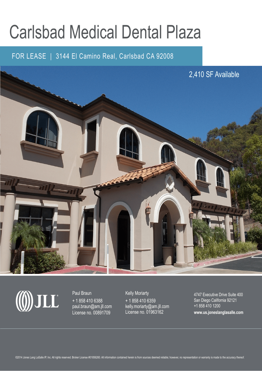 Carlsbad Medical Dental Plaza FOR LEASE | 3144 El Camino Real, Carlsbad CA 92008 2,410 SF Available 67 SANTEE 125 EL CAJON MEXICO Paul Braun + 1 858 410 6388 [email protected] License no. 00891709 Kelly Moriarty + 1 858 410 6359 [email protected] License no. 01963162 4747 Executive Drive Suite 400 San Diego California 92121 +1 858 410 1200 www.us.joneslanglasalle.com ©2014 Jones Lang LaSalle IP, Inc. All rights reserved. Broker License #01856260. All information contained herein is from sources deemed reliable; however, no representation or warranty is made to the accuracy thereof. Carlsbad Medical Dental Plaza FOR LEASE | 3144 El Camino Real, Carlsbad CA 92008 Recently remodeled class “A” medical office building 2-story; 27,894 SF Conveniently located within close proximity of downtown Carlsbad, Tri-City Hospital and Westfield Plaza Camino Real Easy access from Interstate 5 via Carlsbad Village Drive and from Highway 78 via El Camino Real Abundant parking (5.0/1,000) SECOND FLOOR SUITE 204 Paul Braun + 1 858 410 6388 [email protected] License no. 00891709 Kelly Moriarty + 1 858 410 6359 [email protected] License no. 01963162 4747 Executive Drive Suite 400 San Diego California 92121 +1 858 410 1200 www.us.joneslanglasalle.com ©2014 Jones Lang LaSalle IP, Inc. All rights reserved. Broker License #01856260. All information contained herein is from sources deemed reliable; however, no representation or warranty is made to the accuracy thereof. AVAILABILITY SUITE SIZE (rsf) STATUS DESCRIPTION 204 Available Built-out as dental office 2,410 SUITE 204 Paul Braun + 1 858 410 6388 [email protected] License no. 00891709 Kelly Moriarty + 1 858 410 6359 [email protected] License no. 01963162 4747 Executive Drive Suite 400 San Diego California 92121 +1 858 410 1200 www.us.joneslanglasalle.com ©2014 Jones Lang LaSalle IP, Inc. All rights reserved. Broker License #01856260. All information contained herein is from sources deemed reliable; however, no representation or warranty is made to the accuracy thereof. Carlsbad Medical Dental Plaza FOR LEASE | 3144 El Camino Real, Carlsbad SAN CA 92008 DIEGO COUNTY Carlsbad boasts extremely strong demographics 72% population growth since 1990 and 38% just since 2000 (vs. 12% SD County overall) 8 Median income approximately163 $91,000 (vs. approximately $68,000 SD15County overall) 52 58% population growth projected (2000-2030) 56 805 163 8 54 52 15 94 56 805 125 54 76 5 Westfield Plaza Camino Real 94 76 78 OCEANSIDE CARLSBAD ESCONDIDO 15 ENCINITAS 5 5 RANCHO BERNARDO DEL MAR 56 Tri-City Medical Center SCRIPPS RANCH H 78 UTC 67 125 67 Carlsbad Village ba 52 LAJOLLA KEARNY MESA 5 Real 78 rls Ca r. eD o amin El C 76 i l l ag dV 805 163 Co ast ay hw Hi g Carlsbad Medical Dental Plaza MISSION BEACH MISSION VALLEY 8 94 DOWNTOWN 54 CHULA VISTA Paul Braun + 1 858 410 6388 [email protected] License no. 00891709 Kelly Moriarty + 1 858 410 6359 [email protected] License no. 01963162 4747 Executive Drive Suite 400 San Diego California 92121 +1 858 410 1200 www.us.joneslanglasalle.com ©2014 Jones Lang LaSalle IP, Inc. All rights reserved. Broker License #01856260. All information contained herein is from sources deemed reliable; however, no representation or warranty is made to the accuracy thereof.