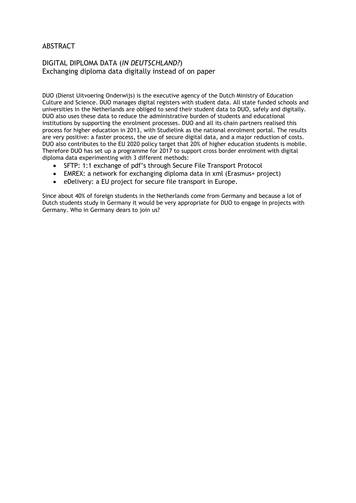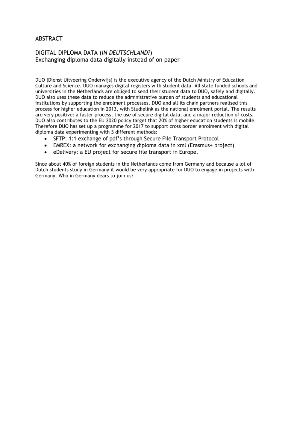 ABSTRACT DIGITAL DIPLOMA DATA (IN DEUTSCHLAND?) Exchanging diploma data digitally instead of on paper DUO (Dienst Uitvoering Onderwijs) is the executive agency of the Dutch Ministry of Education Culture and Science. DUO manages digital registers with student data. All state funded schools and universities in the Netherlands are obliged to send their student data to DUO, safely and digitally. DUO also uses these data to reduce the administrative burden of students and educational institutions by supporting the enrolment processes. DUO and all its chain partners realised this process for higher education in 2013, with Studielink as the national enrolment portal. The results are very positive: a faster process, the use of secure digital data, and a major reduction of costs. DUO also contributes to the EU 2020 policy target that 20% of higher education students is mobile. Therefore DUO has set up a programme for 2017 to support cross border enrolment with digital diploma data experimenting with 3 different methods: SFTP: 1:1 exchange of pdf’s through Secure File Transport Protocol EMREX: a network for exchanging diploma data in xml (Erasmus+ project) eDelivery: a EU project for secure file transport in Europe. Since about 40% of foreign students in the Netherlands come from Germany and because a lot of Dutch students study in Germany it would be very appropriate for DUO to engage in projects with Germany. Who in Germany dears to join us? DIGITAL DIPLOMA DATA (IN DEUTSCHLAND?) Exchanging diploma data digitally instead of on paper 1. INTRODUCTION The purpose of this document is to present information about projects which support the European aim of increasing international mobility of students. One of the main obstacles for this mobility is the administrative burden: when applying for an international study, students have to submit a significant amount of documents, both originals and copies. The key document is, of course, the diploma. The projects we present in this document deal with replacing paper documents with secure digital ones. In the Netherlands, incidentally, this has already been realised in 2013. Since then, no paper whatsoever is involved in the process of enrolment in higher education. The goals of the projects are: Contributing to the EU 2020 policy target that 20% of higher education students is mobile The prevention of fraud The reduction of the administrative burden of students and educational institutions A quicker administrative process Cost reduction. This document starts with an introduction of DUO. After that we will cover the Groningen Declaration and the projects that have emerged worldwide. 2. DUO DUO (Dienst Uitvoering Onderwijs) is the executive agency of the Dutch Ministry of Education Culture and Science. DUO executes laws and regulations for the Dutch education system. Its core business is providing student loans and financing educational institutions. To support this, DUO manages digital registers with student data. All state funded schools and universities in the Netherlands are obliged to send their student data to DUO, safely and digitally. DUO also uses these data to reduce the administrative burden of students and educational institutions by supporting the enrolment processes. DUO and all its chain partners realised this process for higher education in 2013 with Studielink as the national enrolment portal. The results are very positive: a faster process, the use of secure digital data, and a major reduction of costs. 3. DIPLOMA REGISTER AND GRONINGEN DECLARATION In 2012, DUO made the Diploma Register available online. This virtual register contains the diploma data of various digital registers DUO keeps, from secondary to higher education. Everybody who has graduated in the Netherlands can access the Diploma Register via the Dutch digital identification service DigiD. The alumnus can check his diploma data online and download a free extract of his diploma data in the form of a secure pdf (with a digital signature of DUO). The extract can be used when a certified copy of a diploma is required. This way DUO helps to prevent fraud and reduces both alumnis’ and employers’ administrative burden. When the Diploma Register was presented in April 2012, DUO organized an international conference which was attended by managing bodies of diploma registers from all over the world. At the conference, (almost) all parties present signed the Groningen Declaration (GD). The GD is a declaration of intent to support international mobility of students by using digital (national) data. DUO supported the GD by running its secretariat until 2016. Since 2012 an annual conference is organised (2013 Beijing, 2014 Washington, 2015 Malaga, 2016 Cape Town). This year the GDconference took place in Melbourne. Over the years, many more organizations have signed the GD. All around the world activities within the framework of the GD have been initiated, for example in Scandinavia, Italy, Poland, the US, China and Australia. 4. DUO PROJECTS In 2015, the Ministry of Education Culture and Science established a Steering Committee International which governs Dutch initiatives within the framework of the GD. All chain partners involved in the process of international enrolment participate in this committee. On behalf of the Netherlands, DUO has explored the possibilities for pilots that will facilitate the enrolment process of international students in Europe, but also in China. The Steering Committee International also requested DUO to explore various methods and ways of working. This resulted in the following programme for 2017: Sending PDFs through SFTP with partners in China, Flanders and Germany; Joining the EMREX network; Participation in an EC project for e-Delivery. The programme will be amplified in chapter 5. Both the SFTP-process and the EMREX-process aim to support the international mobility of students, to prevent fraud, and to make life easier for students and university st