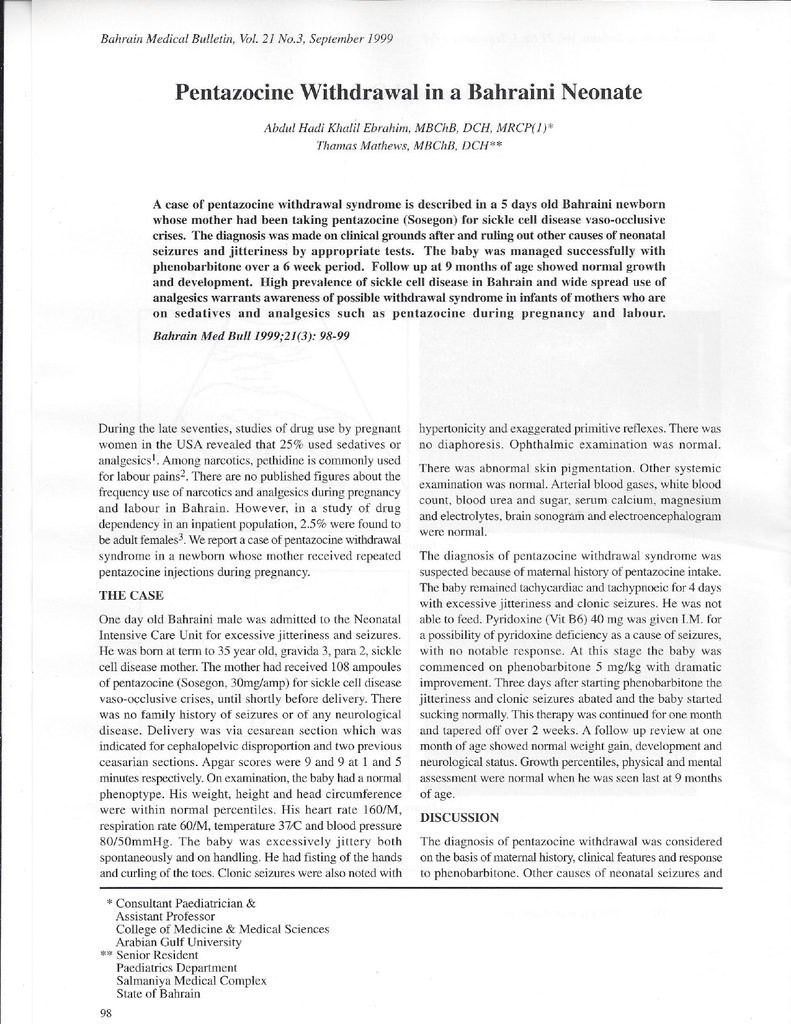 Pentazocine Withdrawal in a Bahraini Neonate