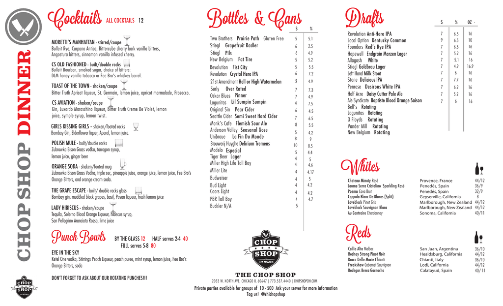 CHOP SHOP DINNER Cocktails ALL COCKTAILS 12 MORETTIʼS MANHATTAN - stirred/coupe Bulleit Rye, Carpano Antica, Bittercube cherry bark vanilla bitters, Angostura bitters, cinnamon vanilla infused cherry. CS OLD FASHIONED - built/double rocks Bulleit Bourbon, smoked sugar, choice of bitters: DLM honey vanilla tobacco or Fee Bro’s whiskey barrel. TOAST OF THE TOWN - shaken/coupe Bitter Truth Apricot liqueur, St. Germain, lemon juice, apricot marmalade, Prosecco. CS AVIATION - shaken/coupe Gin, Luxardo Maraschino liqueur, Bitter Truth Creme De Violet, lemon juice, symple syrup, lemon twist. GIRLS KISSING GIRLS - shaken/footed rocks Bombay Gin, Elderflower liquer, Aperol, lemon juice. POLISH MULE - built/double rocks Zubrowka Bison Grass vodka, tarragon syrup, lemon juice, ginger beer ORANGE SODA - shaken/footed mug Zubrowka Bison Grass Vodka, triple sec, pineapple juice, orange juice, lemon juice, Fee Bro’s Orange Bitters, and orange cream soda. THE GRAPE ESCAPE - built/ double rocks glass Bombay gin, muddled black grapes, basil, Pavan liqueur, fresh lemon juice LADY HIBISCUS - shaken/coupe Bottles & Cans Two Brothers Prairie Path Gluten Free Stiegl Grapefruit Radler Stiegl Pils New Belgium Fat Tire Revolution Fist City Revolution Crystal Hero IPA 21st Amendment Hell or High Watermelon Surly Over Rated Oskar Blues Pinner Lagunitas Lil Sumpin Sumpin Original Sin Pear Cider Seattle Cider Semi Sweet Hard Cider Monk’s Cafe Flemish Sour Ale Anderson Valley Seasonal Gose Unibroue La Fin Du Monde Brouwerij Huyghe Delirium Tremens Modelo Especial Tiger Beer Lager Miller High Life Tall Boy Miller Lite Budweiser Bud Light Coors Light PBR Tall Boy Buckler N/A $ % 5 5.1 6 6 2.5 5 4.9 5.2 5 6 5.5 7.2 5 4.9 7 7.3 4.9 7 6 7.5 6 4.5 7 8 6.5 5.5 5 8 4.2 9 10 8.5 4.4 5 4 4 4 4 4 4 4 5 5 4.6 4.17 5 4.2 4.2 4.7 Tequila, Solerno Blood Orange Liqueur, hibiscus syrup, San Pellegrino Aranciata Rossa, lime juice Punch Bowls EYE IN THE SKY Revolution Anti-Hero IPA Local Option Kentucky Common Founders Redʼs Rye IPA Hopewell Endgrain Marzen Lager Allagash White Stiegl Goldbrau Lager Left Hand Milk Stout Stone Delicious IPA Penrose Desirous White IPA Half Acre Daisy Cutter Pale Ale Ale Syndicate Baptiste Blood Orange Saison Bell’s Rotating Lagunitas Rotating 3 Floyds Rotating Vander Mill Rotating New Belgium Rotating Whites Chateau Minuty Rosé Jaume Serra Cristalino Sparkling Rosé Poema Cava Brut Coppola Blanc De Blancs (Split) Loveblock Pinot Gris Loveblock Sauvignon Blanc Au Contraire Chardonnay Reds BY THE GLASS 12 HALF serves 2-4 40 FULL serves 5-8 80 Ketel One vodka, Stirrings Peach Liqueur, peach puree, mint syrup, lemon juice, Fee Bro’s Orange Bitters, soda DONʼT FORGET TO ASK ABOUT OUR ROTATING PUNCHES!!! Drafts THE CHOP SHOP 2033 W. NORTH AVE, CHICAGO IL 60647 | 773.537.4440 | CHOPSHOPCHI.COM Private parties available for groups of 10 - 500 Ask your server for more information Tag us! @chichopshop Callia Alta Malbec Rodney Strong Pinot Noir Rocca Delle Macie Chianti Freakshow Cabernet Sauvignon Bodegas Breca Garnacha $ % OZ . 7 9 7 7 7 7 7 6.5 6.5 6.6 5.2 5.1 4.9 6 16 10 16 16 16 16.9 16 7 7.7 16 7 6.2 16 7 5.2 16 7 6 16 Provence, France Penedés, Spain Penedés, Spain Geyserville, California Marlborough, New Zealand Marlborough, New Zealand Sonoma, California 44/12 36/9 32/9 8 44/12 44/12 40/11 San Juan, Argentina Healdsburg, California Chianti, Italy Lodi, California Calatayud, Spain 36/10 44/12 36/10 44/12 40/ 11