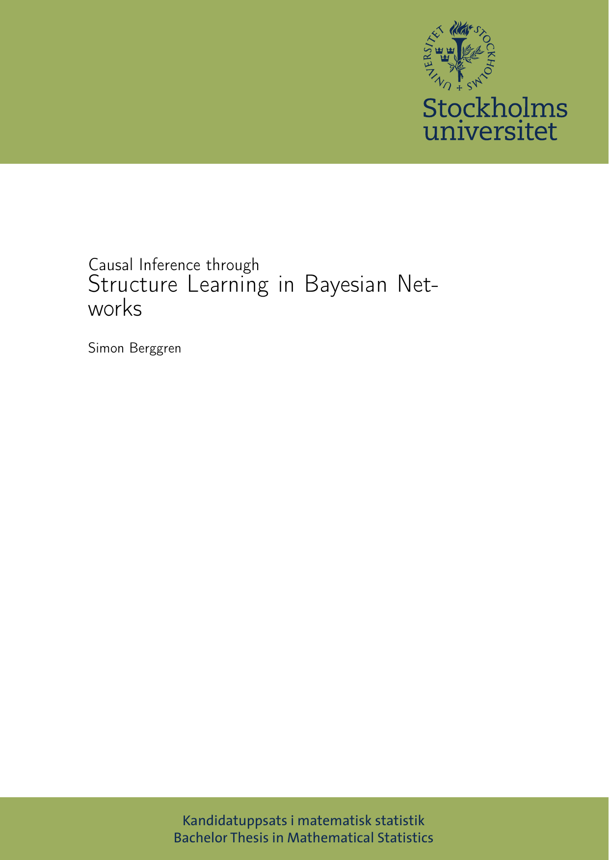 Causal Inference through Structure Learning in Bayesian Networks Simon Berggren Kandidatuppsats i matematisk statistik Bachelor Thesis in Mathematical Statistics Kandidatuppsats 2015:12 Matematisk statistik Juni 2015 www.math.su.se Matematisk statistik Matematiska institutionen Stockholms universitet 106 91 Stockholm Matematiska institutionen Mathematical Statistics Stockholm University Bachelor Thesis 2015:10 http://www.math.su.se Causal Inference through Structure Learning in Bayesian Networks Simon Berggren∗ June 2015 Abstract This thesis is about structure learning in Bayesian Networks, and how this may be used for causal inference. A Bayesian Network is a graphical representation of a probability distribution, that provides a clear representation of conditional independences among the random variables. It consists of a graph and a set of probability tables. In the graph, each node represent a random variable, while edges and their orientations represent association and its nature. Causal inference is an analysis concerned with queries about cause and effect relationships. Specifically, in the phenomenon we wish to analyze, we use random variables to model the factors that describe this phenomenon, and infer causal associations among those variables. Structure learning is a method for obtaining a Bayesian Network from data, i.e. given data consisting of a number of observations, where each observation consists of a realization of all the random variables in our model, the task is to infer a graph structure that represent the distribution of the variables. Hence, the main focus of this thesis will be to obtain a graph structure from data, such that the cause and effect relationships it exhibits, represents the corresponding causal associations in the underlying distribution. There are different approaches to structure learning in Bayesian Networks. In this thesis, focus is on the constraint-based approach, in which we use conditional independences, inferred from data, to build the graph structure. Since the number of required independence tests increases fast with the number of variables in our model, algorithms are necessary to handle the learning process. One part of this thesis consists of a theoretical treatment of structure learning in Bayesian Networks, and in another part, I have composed and implemented my own version of a structure learning algorithm, SLBN, which is available for download at https://github.com/SiboBerggren/SLBN. Furthermore, simulation studies were performed to test the capabilities of structure learning, and of the SLBN algorithm. Altogether, we will see that structure learning is a powerful tool that may be used for causal inference, and that the SLBN algorithm successfully handles the learning process. ∗ Postal address: Mathematical Statistics, Stockholm University, SE-106 91, Sweden. Email: [email protected]. Supervisor: Michael Höhle. Contents 1 Introduction 1.1 Drug test example . 1.2 Causal Inference . . . 1.3 Probability theory . 1.4 Data and Estimation . . . . . . . . . . . . . . . . . . . . . . . . . . . . . . . . 2 Bayesian Networks 2.1 Graphs . . . . . . . . . . . . . . . . 2.2 Bayesian Networks . . . . . . . . . 2.3 Markovian factorization . . . . . . 2.4 Propagation in Bayesian Networks . 2.5 Simulation . . . . . . . . . . . . . . . . . . . . . . . . . . . . . . . . . . . . . . . . . . . . . . . . . . . . . . . . . . . . . . . . . . . . . . . . . . . . . . . . . . . . . . 3 3 5 5 6 . . . . . . . . . . . . . . . . . . . . . . . . . . . . . . . . . . . . . . . . . . . . . . . . . . . . . . . . . . . . . . . . . . . . . . . . . . . . . . . . . . . . . 9 9 10 10 12 13 3 Constraint-based structure learning 3.1 Correspondence in Bayesian Networks . 3.2 Equivalent structures . . . . . . . . . . 3.3 D-separation . . . . . . . . . . . . . . . 3.4 Stability . . . . . . . . . . . . . . . . . 3.5 Markov blankets . . . . . . . . . . . . 3.6 Comparing structures . . . . . . . . . . . . . . . . . . . . . . . . . . . . . . . . . . . . . . . . . . . . . . . . . . . . . . . . . . . . . . . . . . . . . . . . . . . . . . . . . . . . . . . . . . . . . . . . . . . . . . . . . . 15 16 17 19 20 21 21 . . . . . . . . . 23 23 24 24 25 26 27 29 31 32 . . . . . 4 The SLBN Algorithm 4.1 Input and output . . . . . . . . . . . . . . . . 4.2 Step by step . . . . . . . . . . . . . . . . . . . 4.2.1 Step 1. Determine the Markov blankets 4.2.2 Step 2. Obtain the graph skeleton . . . 4.2.3 Step 3. Propagate V-structures . . . . 4.2.4 Step 4. Remove cycles . . . . . . . . . 4.2.5 Step 5. Add compelled edges . . . . . 4.3 Implementation of SLBN . . . . . . . . . . . . 4.3.1 Adjacency matrix . . . . . . . . . . . . 1 . . . . . . . . . . . . . . . . . . . . . . . . . . . . . . . . . . . . . . . . . . . . . . . . . . . . . . . . . . . . . . . . . . . . . . . . . . . . . . . . . . . . . . . . . . . . . . . . . . . 4.4 4.3.2 Symmetry . . . . . . . . . . . . . . . . . . . . . . . . . . . . 32 Discussion . . . . . . . . . . . . . . . . . . . . . . . . . . . . . . . . 33 5 Experimental results 5.1 Drug test example . . . . . . . . . . . 5.2 Testing SLBNs capabilities . . . . . . . 5.3 Simulation with latent variables . . . . 5.4 Simulation of an unstable distribution . 5.5 Coronary data-set . . . . . . . . . . . . 5.6 Extending structures . . . . . . . . . . . . . . . . . . . . . . . . . . . . . . . . . . . . . . . . . . . . . . . . . . . . . . . . . . . . . . . . . . . . . . . . . . . . . . . . . . . . . . . . . . . . . . . . . . . . . . . . . . 6 Discussion 35 35 37 40 42 43 46 47 7 Appendix 7.1 Independence test . . . . . . . . . . . . . 7.2 Proof of correctness of Step 4 in SLBN . 7.3 Walk through of Step 1 in SLBN . . . . 7.4 Walk through of Step 2 in SLBN . . . . 7.5 Drug test simulation, information output 2 . . . . . . . . . . . . . . . . . . . . . . . . . . . . . . . . . . . . . . . . . . . . . . . . . . . . . . . . . . . . . . . . . . . . . . . . . . . 50 50 51 52 53 54 Chapt