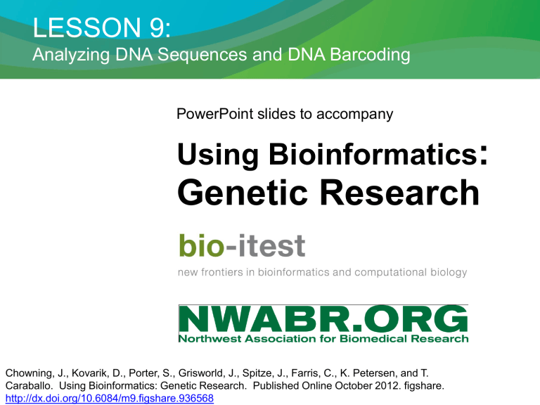 LESSON 9: Analyzing DNA Sequences and DNA Barcoding PowerPoint slides to accompany Using Bioinformatics: Genetic Research Chowning, J., Kovarik, D., Porter, S., Grisworld, J., Spitze, J., Farris, C., K. Petersen, and T. Caraballo. Using Bioinformatics: Genetic Research. Published Online October 2012. figshare. http://dx.doi.org/10.6084/m9.figshare.936568 How DNA Sequence Data is Obtained for Genetic Research Obtain Samples: Blood , Saliva, Hair Follicles, Feathers, Scales Genetic Data Compare DNA Sequences to One Another Extract DNA from Cells Sequence DNA …TTCACCAACAGGCCCACA… TTCAACAACAGGCCCAC TTCACCAACAGGCCCAC TTCATCAACAGGCCCAC GOALS: • Identify the organism from which the DNA was obtained. • Compare DNA sequences to each other. Image Source: Wikimedia Commons Overview of DNA Sequencing Mix with primers Perform sequencing reaction DNA Sample …T T C A C C A A C T G G C C C A C A… DNA Sequence Chromatogram Sequence Both Strands of DNA Sequence #1: Top Strand Sequence #2: Bottom Strand A T G A C G G A T C A G C Sequence #1: Top Strand T A C T G C C T A G T C G Sequence #2: Bottom Strand Image Source: Wikimedia Commons Compare the Two Sequences Sequence #1: Top Strand Sequence #2: Bottom Strand Sequence #1: Top (“F”) 5’- A T G A C G G A T C A G C – 3’ Sequence #2: Bottom (“R”) 3’- T A C T G C C T A G T C G – 5’ Bioinformatics tools like BLAST can be used to compare the sequences from the two strands. Image Source: Wikimedia Commons Analyzing DNA Sequences Sequence #1: A T G A C G G A T C A G C Top Strand T A C T G C C T A G T C G Sequence #2: Bottom Strand Day One: 1. Obtain two chromatograms for each sample. 2. Align the sequences with BLAST. Day Two: 3. Visualize the chromatograms using FinchTV. Compare BLAST alignments against base calls in chromatogram. Sequence #1 Sequence #2 4. Review any differences and determine which base is most likely correct. 5. Edit and trim the DNA sequence using quality data. ATGCCGTAA M P STOP Day Three: 6. Translate the sequence to check for stop codons. 7. Use BLAST to identify origin of sequence. 8. Use BOLD to confirm identity and make phylogenetic tree. Image Source: NCBI, FinchTV, BOLD. Viewing DNA Sequences with FinchTV Image Source: FinchTV DNA Peaks Can Vary in Height and Width Image Source: FinchTV Quality Values Represent the Accuracy of Each Base Call Quality values represent the ability of the DNA sequencing software to identify the base at a given position. Quality Value (Q) = log10 of the error probability * -10. Q10 means the base has a one in ten chance (probability) of being misidentified. Q20 = probability of 1 in 100 of being misidentified. Q30 = probability of 1 in 1,000 of being misidentified. Q40 = probability of 1 in 10,000 of being misidentified. Quality Values Are Used When Comparing Sequences Quality values represent the ability of the DNA sequencing software to identify the base at a given position. Image Source: FinchTV Background “Noise” May Be Present Image Source: FinchTV The Beginning and Ends of Sequences Are Likely To Be Poor Quality Image Source: FinchTV Examples of Chromatogram Data #1 #2 #3 Circle #1: Example of a series of the same nucleotide (many T’s in a row). Notice the highest peaks are visible at each position. Circle #2: Example of an ambiguous base call. Notice the T (Red) at position 57 (highlighted in blue) is just below a green peak (A) at the same position. Look at the poor quality score on bottom left of screen (Q12). An A may be the actual nucleotide at this position. Circle #3: Example of two A’s together. The peaks look different, but are the highest peaks at these positions. Image Source: FinchTV Analyzing DNA Sequences Sequence #1: A T G A C G G A T C A G C Top Strand T A C T G C C T A G T C G Sequence #2: Bottom Strand Day One: 1. Obtain two chromatograms for each sample. 2. Align the sequences with BLAST. Day Two: 3. Visualize the chromatograms using FinchTV. Compare BLAST alignments against base calls in chromatogram. Sequence #1 Sequence #2 4. Review any differences and determine which base is most likely correct. 5. Edit and trim the DNA sequence using quality data. ATGCCGTAA M P STOP Day Three: 6. Translate the sequence to check for stop codons. 7. Use BLAST to identify origin of sequence. 8. Use BOLD to confirm identity and make phylogenetic tree. Image Source: NCBI, FinchTV, BOLD. Transcription and Translation Begin at the Start Codon Reading Frame +1 Sequence #1: 5’- Sequence #2: 3’- M T D Q A T G A C G G A T G A G C T A C T G C C T A C T C G – 3’ – 5’ There Are Six Potential Reading Frames in DNA Reading Frame +3 Reading Frame +2 Reading Frame +1 Sequence #1: 5’- M T D Q A T G A C G G A T G A G C T A C T G C C T A C T C G Sequence #2: 3’Reading Frame -1 Reading Frame -2 Reading Frame -3 – 3’ – 5’ Frame-Shifts, Amino Acid Changes, and Stop Codons Reading Frame +2 5’- M D G STOP A T G G A C G G A T G A G – 3’ Accidental insertion of an extra “G” when editing Reading Frame +1 Sequence #1: 5’- Sequence #2: 3’- M T G E A T G A C G G A T G A G C T A C T G C C T A C T C G – 3’ – 5’