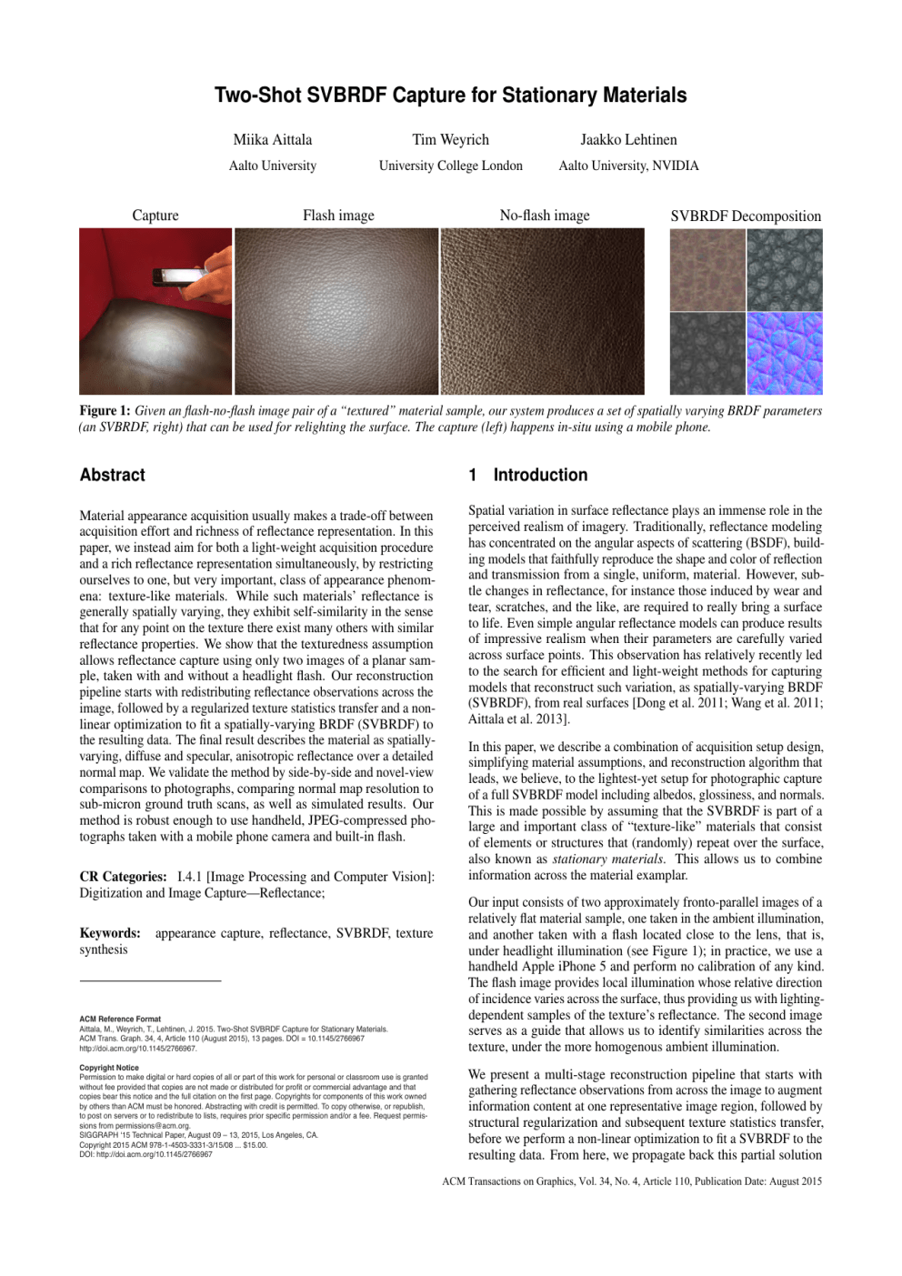 Two-Shot SVBRDF Capture for Stationary Materials Capture Miika Aittala Tim Weyrich Jaakko Lehtinen Aalto University University College London Aalto University, NVIDIA Flash image No-flash image SVBRDF Decomposition Figure 1: Given an flash-no-flash image pair of a “textured” material sample, our system produces a set of spatially varying BRDF parameters (an SVBRDF, right) that can be used for relighting the surface. The capture (left) happens in-situ using a mobile phone. Abstract 1 Material appearance acquisition usually makes a trade-off between acquisition effort and richness of reflectance representation. In this paper, we instead aim for both a light-weight acquisition procedure and a rich reflectance representation simultaneously, by restricting ourselves to one, but very important, class of appearance phenomena: texture-like materials. While such materials’ reflectance is generally spatially varying, they exhibit self-similarity in the sense that for any point on the texture there exist many others with similar reflectance properties. We show that the texturedness assumption allows reflectance capture using only two images of a planar sample, taken with and without a headlight flash. Our reconstruction pipeline starts with redistributing reflectance observations across the image, followed by a regularized texture statistics transfer and a nonlinear optimization to fit a spatially-varying BRDF (SVBRDF) to the resulting data. The final result describes the material as spatiallyvarying, diffuse and specular, anisotropic reflectance over a detailed normal map. We validate the method by side-by-side and novel-view comparisons to photographs, comparing normal map resolution to sub-micron ground truth scans, as well as simulated results. Our method is robust enough to use handheld, JPEG-compressed photographs taken with a mobile phone camera and built-in flash. Spatial variation in surface reflectance plays an immense role in the perceived realism of imagery. Traditionally, reflectance modeling has concentrated on the angular aspects of scattering (BSDF), building models that faithfully reproduce the shape and color of reflection and transmission from a single, uniform, material. However, subtle changes in reflectance, for instance those induced by wear and tear, scratches, and the like, are required to really bring a surface to life. Even simple angular reflectance models can produce results of impressive realism when their parameters are carefully varied across surface points. This observation has relatively recently led to the search for efficient and light-weight methods for capturing models that reconstruct such variation, as spatially-varying BRDF (SVBRDF), from real surfaces [Dong et al. 2011; Wang et al. 2011; Aittala et al. 2013]. CR Categories: I.4.1 [Image Processing and Computer Vision]: Digitization and Image Capture—Reflectance; Introduction In this paper, we describe a combination of acquisition setup design, simplifying material assumptions, and reconstruction algorithm that leads, we believe, to the lightest-yet setup for photographic capture of a full SVBRDF model including albedos, glossiness, and normals. This is made possible by assuming that the SVBRDF is part of a large and important class of “texture-like” materials that consist of elements or structures that (randomly) repeat over the surface, also known as stationary materials. This allows us to combine information across the material examplar. ACM Reference Format Aittala, M., Weyrich, T., Lehtinen, J. 2015. Two-Shot SVBRDF Capture for Stationary Materials. ACM Trans. Graph. 34, 4, Article 110 (August 2015), 13 pages. DOI = 10.1145/2766967 http://doi.acm.org/10.1145/2766967. Our input consists of two approximately fronto-parallel images of a relatively flat material sample, one taken in the ambient illumination, and another taken with a flash located close to the lens, that is, under headlight illumination (see Figure 1); in practice, we use a handheld Apple iPhone 5 and perform no calibration of any kind. The flash image provides local illumination whose relative direction of incidence varies across the surface, thus providing us with lightingdependent samples of the texture’s reflectance. The second image serves as a guide that allows us to identify similarities across the texture, under the more homogenous ambient illumination. Copyright Notice Permission to make digital or hard copies of all or part of this work for personal or classroom use is granted without fee provided that copies are not made or distributed for profit or commercial advantage and that copies bear this notice and the full citation on the first page. Copyrights for components of this work owned by others than ACM must be honored. Abstracting with credit is permitted. To copy otherwise, or republish, to post on servers or to redistribute to lists, requires prior specific permission and/or a fee. Request permissions from [email protected]. SIGGRAPH ‘15 Technical Paper, August 09 – 13, 2015, Los Angeles, CA. Copyright 2015 ACM 978-1-4503-3331-3/15/08 ... $15.00. DOI: http://doi.acm.org/10.1145/2766967 We present a multi-stage reconstruction pipeline that starts with gathering reflectance observations from across the image to augment information content at one representative image region, followed by structural regularization and subsequent texture statistics transfer, before we perform a non-linear optimization to fit a SVBRDF to the resulting data. From here, we propagate back this partial solution Keywords: synthesis appearance capture, reflectance, SVBRDF, texture ACM Transactions on Graphics, Vol. 34, No. 4, Article 110, Publication Date: August 2015 110:2 • M. Aittala et al. from the reference region to the remainder of the input image. The final result is a photo-realistic SVBRDF that describes spatiallyvarying, diffuse and specular, anisotropic reflectance over a detailed normal map across the entire input image. M