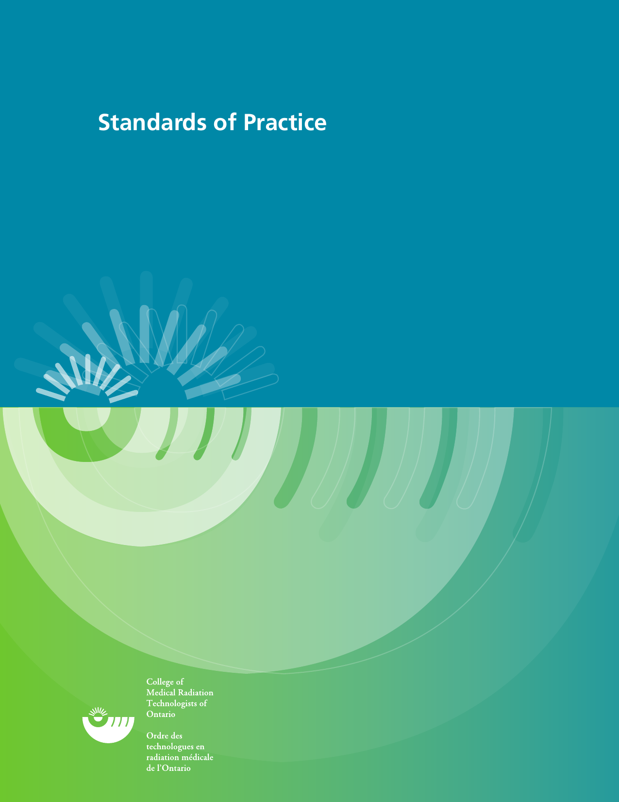 Standards of Practice Table of Contents Introduction 2 1. Legislation, Standards and Ethics 4 2. Equipment and Materials 4 3. Diagnostic and Therapeutic Procedures 6 4. Safe Practice 9 5. Relationship with Patients 12 6. Professional Relationships 13 7. Records and Reporting 15 8. Continuing Competence 16 C M R T O S ta n d a r d s o f P r a ct i c e 1 Introduction The Standards of Practice have been developed by the College of Medical Radiation Technologists of Ontario (CMRTO or the “College”) to describe the expectations for professional practice of medical radiation technologists (MRTs). The Standards of Practice describe what each MRT is accountable and responsible for in practice. They represent performance criteria for MRTs and can be used to interpret the scope of practice to the public and other health care professionals. The Standards of Practice reflect the knowledge, skills and judgement that MRTs need in order to perform the services and procedures that fall within the scope of practice of the profession. The Regulated Health Professions Act and the companion health profession Acts govern the practice of regulated health professions in Ontario. For medical radiation technology, the companion Act is the Medical Radiation Technology Act. The Medical Radiation Technology Act sets out the scope of practice statement for medical radiation technology, as follows: “The practice of medical radiation technology is the use of ionizing radiation, electromagnetism and other prescribed forms of energy for the purposes of diagnostic and therapeutic procedures, the evaluation of images and data relating to the procedures and the assessment of an individual before, during and after the procedures.” The Medical Radiation Technology Act also sets out which of the 13 controlled acts as set out in the Regulated Health Professions Act, MRTs are authorized to perform. These are known as authorized acts. The Medical Radiation Technology Act states: “In the course of engaging in the practice of medical radiation technology, a member is authorized, subject to the terms, conditions and limitations imposed on his or her certificate of registration, to perform the following: 1.Administering substances by injection or inhalation. 2. Tracheal suctioning of a tracheostomy. 3.Administering contrast media, or putting an instrument, hand or finger, • Beyond the opening of the urethra, • Beyond the labia majora, • Beyond the anal verge, or • Into an artificial opening of the body. 4. Performing a procedure on tissue below the dermis. 5.Applying a prescribed form of energy.” 2 C M R T O S ta n d a r d s o f P r a ct i c e The Standards of Practice are intended to be generic. The indicators that follow each Practice Standard indicate the application of the Practice Standard in a specific dimension of practice. Most indicators refer to tasks that are common to all MRTs. Indicators that refer to tasks generally performed only by MRTs in one of the specialties are listed under separate headings. The methods for implementing each task may be determined by departmental policies and procedures. In the event that the Standards of Practice set a standard that is higher than departmental policy or procedure, the MRT must comply with the standard set by the Standards of Practice. In the Standards of Practice, the term “legislation” refers to both statutes and regulations. Under the College’s Standards of Practice, medical radiation technologists are expected to be: Competent: meaning to have the necessary knowledge, skills and judgement to perform safely, effectively and ethically and to apply that knowledge, skill and judgement to ensure safe, effective and ethical outcomes for the patient. This means that MRTs must maintain competence in their current area of practice, must refrain from acting if not competent, and must take appropriate action to address the situation. Accountable: meaning to take responsibility for decisions and actions, including those undertaken independently and those undertaken as a member of a team. This means that MRTs must accept the consequences of their decisions and actions and act on the basis of what they, in their clinical judgement, believe is in the best interests of the patient. MRTs must take appropriate action if they feel these interests are being unnecessarily and unacceptably compromised. This includes not implementing ordered procedures or treatment plans that, from their perspective, appear to be contraindicated, and in this event, taking appropriate action to address the situation. Collaborative: meaning to work with other members of the health care team to achieve the best possible outcomes for the patient. This means MRTs are responsible for communicating and coordinating care provision with other members of the health care team, and taking appropriate action to address gaps and differences in judgement about care provision. C M R T O S ta n d a r d s o f P r a ct i c e 3 1. Legislation, Standards and Ethics MRTs are members of the College of Medical Radiation Technologists of Ontario. In order to be registered as a member, MRTs must meet the professional education and other registration requirements set by the College. They must continue to educate themselves about practical, legal, ethical and other matters pertaining to the profession. MRTs must be competent, accountable and collaborative in their practice. Practice Standard: MRTs must understand, and adhere to, the legislation governing the practice of the profession, the Standards of Practice set by the College, the Code of Ethics and the by-laws of the College. Indicators MRTs must: a.have the knowledge, skills and judgement to perform procedures undertaken in the course of their practice of the profession b.take responsibility for decisions and actions, including those undertaken independently and those undertaken as a member of the team c.work with other members of the health care team to achi