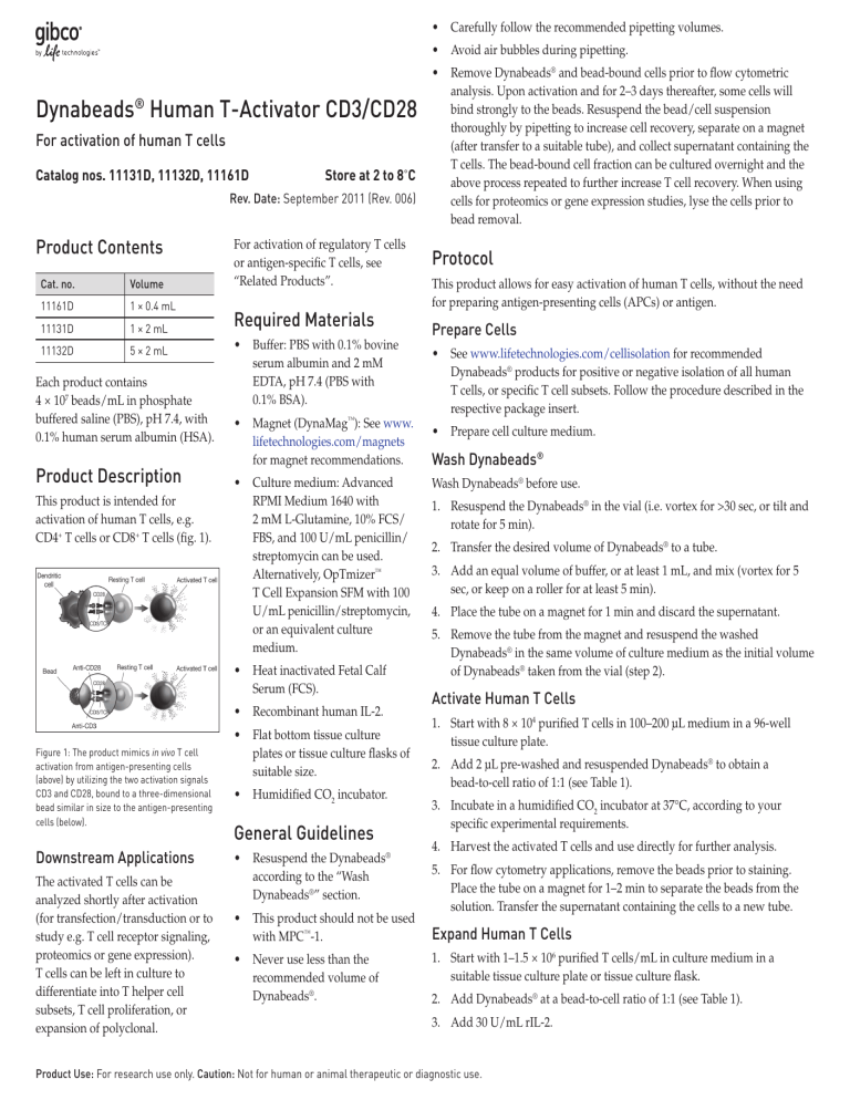 • Carefully follow the recommended pipetting volumes. • Avoid air bubbles during pipetting. Dynabeads® Human T-Activator CD3/CD28 For activation of human T cells Catalog nos. 11131D, 11132D, 11161D Store at 2 to 8˚C Rev. Date: September 2011 (Rev. 006) Product Contents Cat. no. Volume 11161D 1 × 0.4 mL 11131D 1 × 2 mL 11132D 5 × 2 mL Each product contains 4 × 107 beads/mL in phosphate buffered saline (PBS), pH 7.4, with 0.1% human serum albumin (HSA). Product Description This product is intended for activation of human T cells, e.g. CD4+ T cells or CD8+ T cells (fig. 1). For activation of regulatory T cells or antigen-specific T cells, see “Related Products”. Required Materials • Buffer: PBS with 0.1% bovine serum albumin and 2 mM EDTA, pH 7.4 (PBS with 0.1% BSA). • Magnet (DynaMag™): See www. lifetechnologies.com/magnets for magnet recommendations. • Culture medium: Advanced RPMI Medium 1640 with 2 mM L-Glutamine, 10% FCS/ FBS, and 100 U/mL penicillin/ streptomycin can be used. Alternatively, OpTmizer™ T Cell Expansion SFM with 100 U/mL penicillin/streptomycin, or an equivalent culture medium. • Heat inactivated Fetal Calf Serum (FCS). • Recombinant human IL-2. Figure 1: The product mimics in vivo T cell activation from antigen-presenting cells (above) by utilizing the two activation signals CD3 and CD28, bound to a three-dimensional bead similar in size to the antigen-presenting cells (below). Downstream Applications The activated T cells can be analyzed shortly after activation (for transfection/transduction or to study e.g. T cell receptor signaling, proteomics or gene expression). T cells can be left in culture to differentiate into T helper cell subsets, T cell proliferation, or expansion of polyclonal. • Flat bottom tissue culture plates or tissue culture flasks of suitable size. • Humidified CO2 incubator. General Guidelines • Resuspend the Dynabeads® according to the “Wash Dynabeads®” section. • This product should not be used with MPC™-1. • Never use less than the recommended volume of Dynabeads®. • Remove Dynabeads® and bead-bound cells prior to flow cytometric analysis. Upon activation and for 2–3 days thereafter, some cells will bind strongly to the beads. Resuspend the bead/cell suspension thoroughly by pipetting to increase cell recovery, separate on a magnet (after transfer to a suitable tube), and collect supernatant containing the T cells. The bead-bound cell fraction can be cultured overnight and the above process repeated to further increase T cell recovery. When using cells for proteomics or gene expression studies, lyse the cells prior to bead removal. Protocol This product allows for easy activation of human T cells, without the need for preparing antigen-presenting cells (APCs) or antigen. Prepare Cells • See www.lifetechnologies.com/cellisolation for recommended Dynabeads® products for positive or negative isolation of all human T cells, or specific T cell subsets. Follow the procedure described in the respective package insert. • Prepare cell culture medium. Wash Dynabeads® Wash Dynabeads® before use. 1. Resuspend the Dynabeads® in the vial (i.e. vortex for >30 sec, or tilt and rotate for 5 min). 2. Transfer the desired volume of Dynabeads® to a tube. 3. Add an equal volume of buffer, or at least 1 mL, and mix (vortex for 5 sec, or keep on a roller for at least 5 min). 4. Place the tube on a magnet for 1 min and discard the supernatant. 5. Remove the tube from the magnet and resuspend the washed Dynabeads® in the same volume of culture medium as the initial volume of Dynabeads® taken from the vial (step 2). Activate Human T Cells 1. Start with 8 × 104 purified T cells in 100–200 µL medium in a 96-well tissue culture plate. 2. Add 2 µL pre-washed and resuspended Dynabeads® to obtain a bead-to-cell ratio of 1:1 (see Table 1). 3. Incubate in a humidified CO2 incubator at 37°C, according to your specific experimental requirements. 4. Harvest the activated T cells and use directly for further analysis. 5. For flow cytometry applications, remove the beads prior to staining. Place the tube on a magnet for 1–2 min to separate the beads from the solution. Transfer the supernatant containing the cells to a new tube. Expand Human T Cells 1. Start with 1–1.5 × 106 purified T cells/mL in culture medium in a suitable tissue culture plate or tissue culture flask. 2. Add Dynabeads® at a bead-to-cell ratio of 1:1 (see Table 1). 3. Add 30 U/mL rIL-2. Product Use: For research use only. Caution: Not for human or animal therapeutic or diagnostic use. 4. Incubate in a humidified CO2 incubator at 37°C, according to your specific experimental requirements. 5. Examine cultures daily, noting cell size and shape. Cell shrinking and reduced proliferation rate is typically observed in exhausted cell cultures. 6. Count the cells at least twice weekly after thorough resuspension. 7. When the cell density exceeds 2.5 × 106 cells/mL or when the medium turns yellow, split cultures back to a density of 0.5–1 × 106 cells/mL in culture medium containing 30 U/mL rIL-2. Restimulation Cell cultures showing signs of exhaustion (typically at day 7–10 of expansion) can be restimulated several times by adding fresh Dynabeads® and rIL-2. The CD8+ T cells remain cytotoxic after repeated restimulations. Restimulation is typically necessary when cell shrinking and a reduced rate of proliferation is observed. Guidelines for restimulation are provided in Table 2. Optimize for your particular application. Do not use an excess volume of Dynabeads®, as excess Dynabeads® may inhibit expansion. 1. Prior to restimulation, remove the used Dynabeads® by transferring the cells to a suitable tube. Description of Materials Dynabeads® Human T-Activator CD3/CD28 are uniform 4.5 μm, superpara-magnetic polymer beads coated with an optimized mixture of monoclonal antibodies against the CD3 and CD28 cell surface molecules of human T cells.