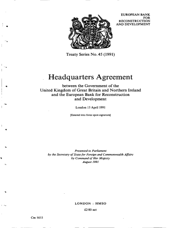 EUROPEAN BANK FOR RECONSTRUCTION AND DEVELOPMENT Treaty Series No.45 (1991) Headquarters Agreement between the Government of the United Kingdom of Great Britain and Northern Ireland and the European Bank for Reconstruction and Development London 15 April 1991 [Entered into force upon signature] Presented to Parliament by the Secretary of State for Foreign and Commonwealth Affairs by Command of Her Majesty August 1991 LONDON : HMSO £2.80 net Cm 1615 HEADQUARTERS AGREEMENT BETWEEN THE GOVERNMENT OF THE UNITED KINGDOM OF GREAT BRITAIN AND NORTHERN IRELAND AND THE EUROPEAN BANK FOR RECONSTRUCTION AND DEVELOPMENT The Government of the United Kingdom of Great Britain and Northern Ireland and the European Bank for Reconstruction and Development; Having regard to the Agreement Establishing the European Bank for Reconstruction and Development;) Noting that Article 33 of that Agreement provides that the Principal Office of the European Bank for Reconstruction and Development shall be located in London; Desiring to define the status, privileges and immunities in the United Kingdom of the Bank and persons connected therewith; Have agreed as follows: ARTICLE 1 Use of terms For the purpose of this Agreement: (a) "Agreement Establishing the Bank " means the Agreement Establishing the European Bank for Reconstruction and Development signed in Paris on 29th May 1990, and any amendments thereto; (b) "Bank " means the European Bank for Reconstruction and Development; (c) " Government " means the Government of the United Kingdom of Great Britain and Northern Ireland (the " United Kingdom "); (d) "the terms "Member" "President", "Vice-President" "Governor" "Alternate Governor ", "Temporary Alternate Governor" "Director" "Alternate Director" and "Temporary Alternate Director" have the same meaning as in the Agreement Establishing the Bank, its By-laws or Rules of Procedure; (e) "Premises of the Bank" means the land, buildings and parts of buildings, including access facilities, used for the Official Activities of the Bank; (1) " Representatives of Members" means heads of delegations of Members participating in meetings convened by the Bank other than meetings of the Governors or the Board of Directors; (g) "Members of Delegations" means alternates, advisers, technical experts and secretaries of delegations of Representatives of Members; (h) "Officers" means the President, the Vice-President and other persons appointed by the President to be Officers of the Bank; (i) "Employees of the Bank" means the staff of the Bank excluding those staff both recruited locally and assigned to hourly rates of pay; (j) "Archives of the Bank " includes all records, correspondence, documents, manuscripts, still and moving pictures and films, sound recordings, computer programmes and written materials, video tapes or discs, and discs or tapes containing data belonging to, or held by, the Bank; (k) "Official Activities of the Bank" includes all activities undertaken pursuant to the Agreement Establishing the Bank , and all activities appropriate to fulfil its purpose and functions under Articles I and 2 of that Agreement, or undertaken in exercise of its powers under Article 20 of that Agreement including its administrative activities; and 'Miscellaneous Series No . 14 (1990) Cm 1116. 3 210900 B• (1) "Persons Connected with the Bank" means Governors, Alternate Governors, Temporary Alternate Governors, Representatives of Members, Members of Delegations, Directors, Alternate Directors, Temporary Alternate Directors, the President, the Vice-Presidents, Officers and Employees of the Bank, and experts performing missions for the Bank. ARncLE 2 Interpretation (1) This Agreement shall be interpreted in the light of the primary objective of enabling the Bank fully and efficiently to discharge its responsibilities in the United Kingdom and to fulfil its purpose and functions. (2) This Agreement shall be regarded as implementing and supplementing certain of the provisions of the Agreement Establishing the Bank and shall not be regarded as modifying or derogating from the provisions of that Agreement, particularly Chapter VIII thereof. ARncLE 3 Judicial Personality The Bank shall possess full legal personality and, in particular, the full legal capacity: (a) to contract; (b) to acquire, and dispose of, immovable and movable property; and (c) to institute legal proceedings. ARncLE 4 Immunity from judicial proceedings (1) Within the scope of its official activities the Bank shall enjoy immunity from jurisdiction, except that the immunity of the Bank shall not apply: (a) to the extent that the Bank shall have expressly waived any such immunity in any particular case or in any written document; (b) in respect of civil action arising out of the exercise of its powers to borrow money, to guarantee obligations and to buy or sell or underwrite the sale of any securities; (c) in respect of a civil action by a third party for damage arising from a road traffic accident caused by an Officer or an Employee of the Bank acting on behalf of the Bank; (d) in respect of a civil action relating to death or personal injury caused by an act or omission in the United Kingdom; (e) in respect of the enforcement of an arbitration award made against the Bank as a result of an express submission to arbitration by or on behalf of the Bank; or (f) in respect of any counter-claim directly connected with court proceedings initiated by the Bank. (2) The property and assets of the Bank shall , wheresoever located and by whomsoever held, be immune from all forms of restraint , seizure, attachment or execution except upon the delivery of final judgment against the Bank. ARTICLE 5 The Premises of the Principal Office of the Bank (1) The Government shall do its utmost to meet the requirements of the Bank in the selection, negotiation and acquisition of the Premises of the Bank. In particular, but without limitation, the Government shall assist the Bank in the acquisition (b
