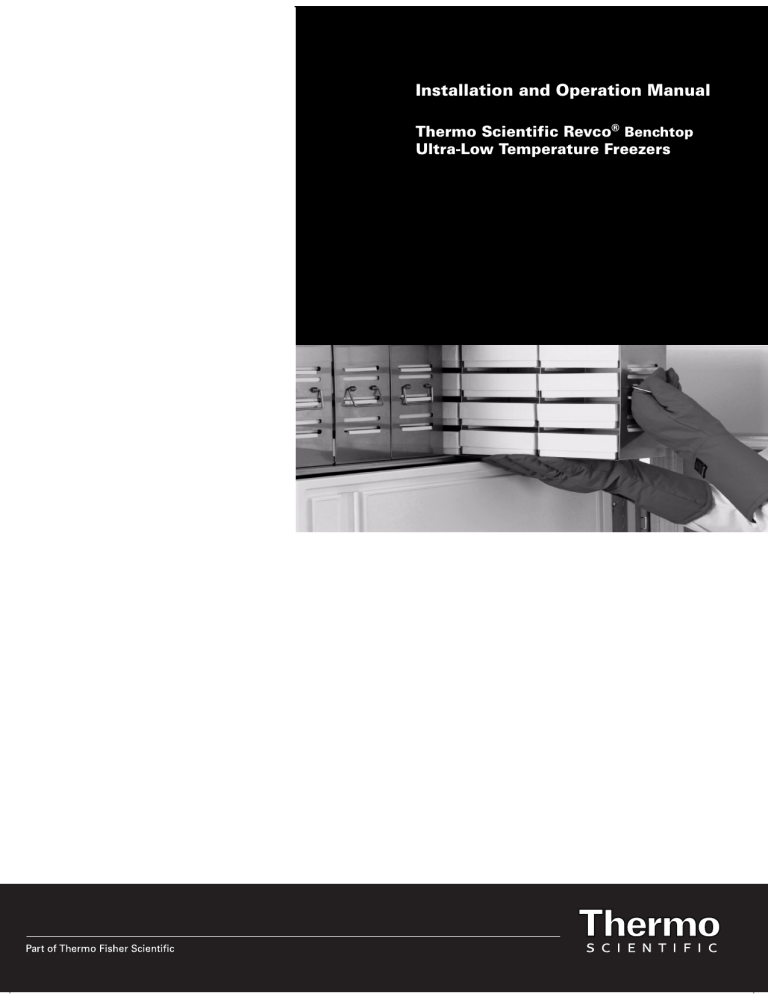 Installation and Operation Manual Thermo Scientific Revco® Benchtop Ultra-Low Temperature Freezers © 2007 Thermo Fisher Scientific. All rights reserved. “Suva®” is a registered trademark of DuPont. All other trademarks are the property of Thermo Fisher Scientific Inc. and its subsidiaries. 2007 Thermo Fisher Scientific. All rights reserved. “Suva®” is a registered trademark of DuPont. All other trademarks are the property of Thermo Fisher Scientific Inc. and its subsidiaries. Thermo Scientific Revco Benchtop Freezers Installation and Operation Table of Contents 1 Introduction ....................................................................... 1 2 Safety Precautions ................................................................. 1 3 General Recommendations 3.1 Initial Loading 4 Pre-Installation 4.1 Unpacking 5 Installation .......................................................... 1 . . . . . . . . . . . . . . . . . . . . . . . . . . . . . . . . . . . . . . . . . . . . . . . . . . . . . . . . . . . . . . . . . . . . . . . . . . . .1 .................................................................... 1 . . . . . . . . . . . . . . . . . . . . . . . . . . . . . . . . . . . . . . . . . . . . . . . . . . . . . . . . . . . . . . . . . . . . . . . . . . . . . . .1 ........................................................................ 2 5.1 Location 5.2 Wiring . . . . . . . . . . . . . . . . . . . . . . . . . . . . . . . . . . . . . . . . . . . . . . . . . . . . . . . . . . . . . . . . . . . . . . . . . . . . . . . .2 . . . . . . . . . . . . . . . . . . . . . . . . . . . . . . . . . . . . . . . . . . . . . . . . . . . . . . . . . . . . . . . . . . . . . . . . . . . . . . . . . .2 6 Operation (Benchtop Freezers) 6.1 Control Panel Features 6.2 Start Up ....................................................... 3 . . . . . . . . . . . . . . . . . . . . . . . . . . . . . . . . . . . . . . . . . . . . . . . . . . . . . . . . . . . . . . . . . . . . .3 . . . . . . . . . . . . . . . . . . . . . . . . . . . . . . . . . . . . . . . . . . . . . . . . . . . . . . . . . . . . . . . . . . . . . . . . . . . . . . . .3 6.2.1 Turning the Power On . . . . . . . . . . . . . . . . . . . . . . . . . . . . . . . . . . . . . . . . . . . . . . . . . . . . . . . . . . . . . . .3 6.2.2 Setting the Cabinet Temperature 6.2.3 Warm Alarm . . . . . . . . . . . . . . . . . . . . . . . . . . . . . . . . . . . . . . . . . . . . . . . . . . . . . . . . . . . . . . . . . . . . . .3 7 Maintenance and Troubleshooting 7.1 Condenser Maintenance 7.2 Gasket Maintenance 7.3 Defrost Procedures . . . . . . . . . . . . . . . . . . . . . . . . . . . . . . . . . . . . . . . . . . . . . . . . . . . . . . .3 .................................................... 4 . . . . . . . . . . . . . . . . . . . . . . . . . . . . . . . . . . . . . . . . . . . . . . . . . . . . . . . . . . . . . . . . . . . .4 . . . . . . . . . . . . . . . . . . . . . . . . . . . . . . . . . . . . . . . . . . . . . . . . . . . . . . . . . . . . . . . . . . . . . . .4 . . . . . . . . . . . . . . . . . . . . . . . . . . . . . . . . . . . . . . . . . . . . . . . . . . . . . . . . . . . . . . . . . . . . . . . .4 7.4 Alarm Battery Maintenance . . . . . . . . . . . . . . . . . . . . . . . . . . . . . . . . . . . . . . . . . . . . . . . . . . . . . . . . . . . . . . . . .4 8 Chart Recorders (Optional) .......................................................... 5 8.1 Set Up and Operation 8.2 Power Supply . . . . . . . . . . . . . . . . . . . . . . . . . . . . . . . . . . . . . . . . . . . . . . . . . . . . . . . . . . . . . . . . . . . . . .5 . . . . . . . . . . . . . . . . . . . . . . . . . . . . . . . . . . . . . . . . . . . . . . . . . . . . . . . . . . . . . . . . . . . . . . . . . . . .5 8.3 Changing Chart Paper . . . . . . . . . . . . . . . . . . . . . . . . . . . . . . . . . . . . . . . . . . . . . . . . . . . . . . . . . . . . . . . . . . . . .5 8.4 Calibration Adjustment . . . . . . . . . . . . . . . . . . . . . . . . . . . . . . . . . . . . . . . . . . . . . . . . . . . . . . . . . . . . . . . . . . . . .5 i Thermo Scientific Revco Benchtop Freezers 1 Introduction Ultra-low temperature Revco Benchtop freezers are designed for personal or clinical trial applications. They have a compact footprint (25.2 in.x 30.7 in.) with a 1 cu. ft. (28L) capacity. Standard features include: • • • • • • • • • Hermetically sealed industrial-grade compressors Foamed-in-place CFC-free urethane insulation All-steel cabinet with high-impact epoxy finish for easy cleaning Thermal interior sublid Heavy-duty counterbalanced lid with key lock Solid-state temperature control system with adjustable setpoints Integrated preset overtemperature safety alarm with battery backup Digital temperature display with 1ºC resolution Key-operated main power switch 6-inch temperature recorders are available as optional accessories. 2 Safety Precautions In this manual and on labels attached to this product, the words WARNING and CAUTION mean the following: • WARNING: a potentially hazardous situation which, if not avoided, could result in serious injury or death. • CAUTION: a potentially hazardous situation which, if not avoided, may result in minor or moderate injury or damage to the equipment. Before installing, using or maintaining this product, please be sure to read this manual and product warning labels carefully. Failure to follow these instructions may cause this product to malfunction, which could result in injury or damage. Below are important safety precautions that apply to this product: • Use this product only in the way described in the product literature and in this manual. Before using it, verify that this product is suitable for its intended use. • Do not modify system components, especially the controller. Use OEM exact replacement equipment or parts. Before use, confirm that the product has not been altered in any way. • Your unit must be properly gr