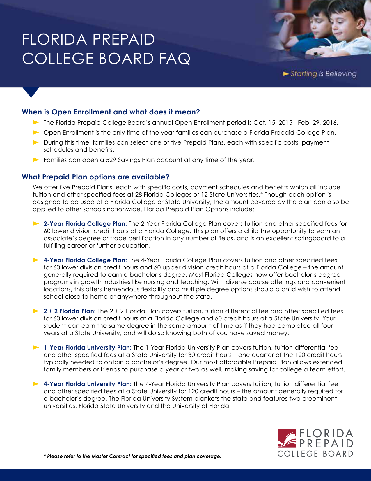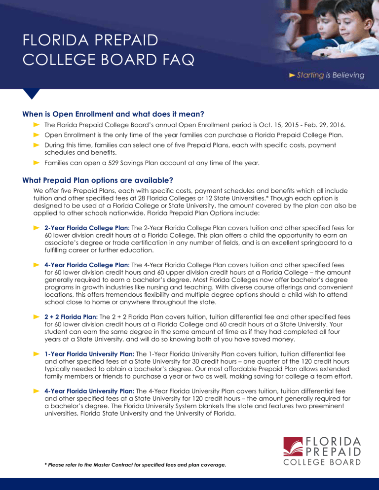 FLORIDA PREPAID COLLEGE BOARD FAQ When is Open Enrollment and what does it mean? The Florida Prepaid College Board’s annual Open Enrollment period is Oct. 15, 2015 - Feb. 29, 2016. Open Enrollment is the only time of the year families can purchase a Florida Prepaid College Plan. During this time, families can select one of five Prepaid Plans, each with specific costs, payment schedules and benefits. Families can open a 529 Savings Plan account at any time of the year. What Prepaid Plan options are available? We offer five Prepaid Plans, each with specific costs, payment schedules and benefits which all include tuition and other specified fees at 28 Florida Colleges or 12 State Universities.* Though each option is designed to be used at a Florida College or State University, the amount covered by the plan can also be applied to other schools nationwide. Florida Prepaid Plan Options include: 2-Year Florida College Plan: The 2-Year Florida College Plan covers tuition and other specified fees for 60 lower division credit hours at a Florida College. This plan offers a child the opportunity to earn an associate’s degree or trade certification in any number of fields, and is an excellent springboard to a fulfilling career or further education. 4-Year Florida College Plan: The 4-Year Florida College Plan covers tuition and other specified fees for 60 lower division credit hours and 60 upper division credit hours at a Florida College – the amount generally required to earn a bachelor’s degree. Most Florida Colleges now offer bachelor’s degree programs in growth industries like nursing and teaching. With diverse course offerings and convenient locations, this offers tremendous flexibility and multiple degree options should a child wish to attend school close to home or anywhere throughout the state. 2 + 2 Florida Plan: The 2 + 2 Florida Plan covers tuition, tuition differential fee and other specified fees for 60 lower division credit hours at a Florida College and 60 credit hours at a State University. Your student can earn the same degree in the same amount of time as if they had completed all four years at a State University, and will do so knowing both of you have saved money. 1-Year Florida University Plan: The 1-Year Florida University Plan covers tuition, tuition differential fee and other specified fees at a State University for 30 credit hours – one quarter of the 120 credit hours typically needed to obtain a bachelor’s degree. Our most affordable Prepaid Plan allows extended family members or friends to purchase a year or two as well, making saving for college a team effort. FLOR PF L R E PA OR IDA 4-Year Florida University Plan: The 4-Year Florida University Plan covers tuition, tuition differential fee and other specified fees at a State University for 120 credit hours – the amount generally required for a bachelor’s degree. The Florida University System blankets the state and features two preeminent universities, Florida State University and the University of Florida. PR E PA ID * Please refer to the Master Contract for specified fees and plan coverage. FLORIDA PREPAID COLLEGE BOARD FAQ Does a student lose their Prepaid Plan benefits if they receive a scholarship, move somewhere outside of Florida or decide to attend a private college, out-of-state college or technical school? No, they do not necessarily lose their plan benefits. If a child receives a scholarship (like Bright Futures), the amount covered by a plan – not just what was paid in – can be refunded and transferred to another family member or used to pay for qualified educational expenses not covered by the scholarship. If a parent or child moves out of Florida, the child remains eligible for in-state tuition and fees at a Florida College or State University when they use their plan. Finally, if your child enrolls at a school other than one of Florida’s 28 Public Colleges or 12 Public Universities, the defined benefits covered by a particular Prepaid Plan or plans can be transferred to a private or out-of-state eligible educational institution as defined by Section 529 of the Internal Revenue Code. What are the Prepaid Plan prices and payment options? A Prepaid Plan cost calculator is available at: http://www.myfloridaprepaid.com/what-we-offer/ Prices vary depending on plan type and the age of the beneficiary. For added flexibility, families can select from any of the three payment options; monthly, 5-year or lump sum. The most popular of the three options are the monthly payments, with approximatey 70 percent of families going with that option. 6) How are Prepaid Plan prices calculated? Prepaid Plan prices are carefully calculated taking into account three factors. - The current cost of tuition and fees. - What the cost is expected to be by the time the child is ready to attend college. - Projected investment yields. FLOR PF L R E PA OR IDA PR E PA ID FLORIDA PREPAID COLLEGE BOARD FAQ What is the Florida 529 Savings Plan? Unlike Prepaid Plans, our Florida 529 Savings Plan does not have a set payment amount or schedule. A family can contribute as much or as often as desired. Accounts can be opened at any time. There is no application fee, so an Account Owner can get started for as little as $ 25 / month. After the account balance reaches $250, there is no minimum monthly contribution. Unlike Prepaid Plans, however, the Florida 529 Savings Plan is not guaranteed by the State of Florida. What is the biggest difference between Florida 529 Savings Plans and Prepaid Plans? A Florida 529 Savings Plan is subject to fluctuations in the financial markets, while defined benefits covered by Prepaid Plans are guaranteed by the State of Florida. At what age is it recommended that families purchase a plan for their children? It’s never too early or too late to start saving for college. Still, we recommend families start saving as soon as their child is born, to allow the most time for them to meet their goals. Ne