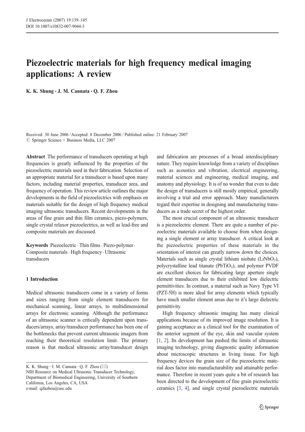 J Electroceram (2007) 19:139–145 DOI 10.1007/s10832-007-9044-3 Piezoelectric materials for high frequency medical imaging applications: A review K. K. Shung & J. M. Cannata & Q. F. Zhou Received: 30 June 2006 / Accepted: 8 December 2006 / Published online: 21 February 2007 # Springer Science + Business Media, LLC 2007 Abstract The performance of transducers operating at high frequencies is greatly influenced by the properties of the piezoelectric materials used in their fabrication. Selection of an appropriate material for a transducer is based upon many factors, including material properties, transducer area, and frequency of operation. This review article outlines the major developments in the field of piezoelectrics with emphasis on materials suitable for the design of high frequency medical imaging ultrasonic transducers. Recent developments in the areas of fine grain and thin film ceramics, piezo-polymers, single crystal relaxor piezoelectrics, as well as lead-free and composite materials are discussed. Keywords Piezoelectric . Thin films . Piezo-polymer . Composite materials . High frequency . Ultrasonic transducers 1 Introduction Medical ultrasonic transducers come in a variety of forms and sizes ranging from single element transducers for mechanical scanning, linear arrays, to multidimensional arrays for electronic scanning. Although the performance of an ultrasonic scanner is critically dependent upon transducers/arrays, array/transducer performance has been one of the bottlenecks that prevent current ultrasonic imagers from reaching their theoretical resolution limit. The primary reason is that medical ultrasonic array/transducer design K. K. Shung : J. M. Cannata : Q. F. Zhou (*) NIH Resource on Medical Ultrasonic Transducer Technology, Department of Biomedical Engineering, University of Southern California, Los Angeles, CA, USA e-mail: [email protected] and fabrication are processes of a broad interdisciplinary nature. They require knowledge from a variety of disciplines such as acoustics and vibration, electrical engineering, material sciences and engineering, medical imaging, and anatomy and physiology. It is of no wonder that even to date the design of transducers is still mostly empirical, generally involving a trial and error approach. Many manufacturers regard their expertise in designing and manufacturing transducers as a trade secret of the highest order. The most crucial component of an ultrasonic transducer is a piezoelectric element. There are quite a number of piezoelectric materials available to choose from when designing a single element or array transducer. A critical look at the piezoelectric properties of these materials in the orientation of interest can greatly narrow down the choices. Materials such as single crystal lithium niobate (LiNbO3), polycrystalline lead titanate (PbTiO3), and polymer PVDF are excellent choices for fabricating large aperture single element transducers due to their exhibited low dielectric permittivities. In contrast, a material such as Navy Type VI (PZT-5H) is more ideal for array elements which typically have much smaller element areas due to it’s large dielectric permittivity. High frequency ultrasonic imaging has many clinical applications because of its improved image resolution. It is gaining acceptance as a clinical tool for the examination of the anterior segment of the eye, skin and vascular system [1, 2]. Its development has pushed the limits of ultrasonic imaging technology, giving diagnostic quality information about microscopic structures in living tissue. For high frequency devices the grain size of the piezoelectric material does factor into manufacturability and attainable performance. Therefore in recent years quite a bit of research has been directed to the development of fine grain piezoelectric ceramics [3, 4], and single crystal piezoelectric materials 140 [5–7]. This review article outlines the major developments in the field of piezoelectrics with emphasis on materials suitable for the design of high frequency medical imaging ultrasonic transducers. 2 Basic principles Naturally occurring piezoelectric crystals are seldom used today as transducer materials in diagnostic ultrasonic imaging because of their weak piezoelectric properties. The most popular material is a polycrystalline ferroelectric ceramic material, lead zirconate titanate, Pb(Zr, Ti)O3 or PZT which possesses very strong piezoelectric properties following polarization. Polarization of a ferroelectric material is carried out by heating it to a temperature just above the Curie temperature of the material and then allowing it to cool slowly in the presence of a strong electric field, typically in the order of 20 kV/cm, applied in the direction in which the piezoelectric effect is required. The electrical field is usually applied to the material by means of two electrodes. This process aligns the dipoles along the direction of polarization. There are a great variety of ferroelectric materials. Barium titanate (BaTiO3) was among the first that were developed. Certain piezoelectric properties of PZT can be enhanced by doping. As a result, many types of PZT are commercially available. To completely describe the piezoelectric properties of a material, 18 piezoelectric stress constants and 18 receiving constants are required. Fortunately, since these materials usually are symmetric, a smaller number of constants are actually needed. For instance, in quartz there are only five constants. Unlike single crystals such as quartz and lithium niobate which have crystallographic axes, the principal axis of a ferroelectric ceramic like PZT is defined as the direction in which the material is polarized. A plate cut with its surface perpendicular to the x-axis of a crystal is called x-cut, and so forth. The x, y, z directions are indicated by numbers 1, 2, 3. For polarized ceramics, the 3 direction is usually used to denote the polarization direction. A piezoe