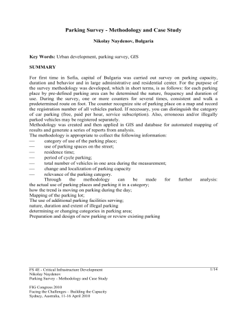 Parking Survey - Methodology and Case Study Nikolay Naydenov, Bulgaria Key Words: Urban development, parking survey, GIS SUMМARY For first time in Sofia, capital of Bulgaria was carried out survey on parking capacity, duration and behavior and in large administrative and residential center. For the purpose of the survey methodology was developed, which in short terms, is as follows: for each parking place by pre-defined parking area can be determined the nature, frequency and duration of use. During the survey, one or more counters for several times, consistent and walk a predetermined route on foot. The counter recognize site of parking place on a map and record the registration number of all vehicles parked. If necessary, you can distinguish the category of car parking (free, paid per hour, service subscription). Also, erroneous and/or illegally parked vehicles may be registered separately. Methodology was created and then applied in GIS and database for automated mapping of results and generate a series of reports from analysis. The methodology is appropriate to collect the following information: category of use of the parking place; use of parking spaces on the street; residence time; period of cycle parking; total number of vehicles in one area during the measurement; change and localization of parking capacity relevance of the parking category. Through the methodology can be made for further analysis: the actual use of parking places and parking it in a category; how the trend is moving on parking during the day; Mapping of the parking lot; The use of additional parking facilities serving; nature, duration and extent of illegal parking determining or changing categories in parking area; Preparation and design of new parking or review existing parking FS 4E - Critical Infrastructure Development Nikolay Naydenov Parking Survey - Methodology and Case Study FIG Congress 2010 Facing the Challenges – Building the Capacity Sydney, Australia, 11-16 April 2010 1/14 Parking Survey - Methodology and Case Study Nikolay Naydenov, Bulgaria 1. INTRODUCTION Socio-political changes in Bulgaria during the past 20 years were marked by economic and demographic crisis, but also of profound social and cultural transformations, changing values, lifestyles and ways of movement in Bulgarian cities. There are actually over the last 2 decades to run two parallel and deep systemic transformations: (a) from a centralized to a market-oriented economic system, (b) closed to open to globalization processes. [Dimitrova, 2009]. There are big changes in the urban area, one of the most significant change is the urban mobility. Extreme increase in the number of private cars is a lasting trend in the Bulgarian cities. The number of private cars owned and the pace of growth in the period 2006-2008 are naturally higher for large cities and reached impressive figures in the capital Sofia - from 400 thousand to 700 thousand cars. This reflects the increased standard of living and growing demands for free choice of lifestyle and movement. Increased mobility of people is important distinctions among the post-socialist Bulgarian cities, but it confronts governing bodies, residents and experts to a series of interrelated challenges of urban daily life. Urban mobility includes the movement of people, goods and services in the road infrastructure of the city, and placement processes, waiting and parking. Policies for parking vehicles will have deep significance, if it is supplemented by other transport initiatives to achieve goals, related to accessibility to the central urban areas and maintain cleanliness of the environment. Problems with travel and parking in Sofia are exacerbated to the extent, that sweeps behind public sentiment increasingly and inevitably intensify the actions of municipal administration Gradually, over the past 10 years necessitates the introduction of regulated parking rules restrictions. Another branch of the municipal administration - for the management of parking and mobility is established. Municipal regulation is prepared for the introduction of paid areas for short stay called "blue zone" parking spaces giving a subscription etc. Like each functioning company, the municipal company "Parking and Mobility" needs to develop its activity. A sustainable policy implementation through planning, analysis and evaluation, assisted by experts on mobility and new information technologies. In general, measures to tackle the problem of parking are two types: quotas and price mechanisms. For Sofia, Bulgaria's capital priorities are: extension of the "blue zone" outside the Center, the price differentiation between the parking areas, construction of parking lots and garages including based on public-private partnerships and new construction, system integration type "Park & ride". For implementing the measures and planning needs of specific actions, there must be made analysis and evaluation of existing parking capacity and parking behavior. The Goal was to develop a methodology and software for the Study of parking. FS 4E - Critical Infrastructure Development Nikolay Naydenov Parking Survey - Methodology and Case Study FIG Congress 2010 Facing the Challenges – Building the Capacity Sydney, Australia, 11-16 April 2010 2/14 2. DESCRIPTION OF METODOLOGY 2.1 Scope of the study For Sofia, the purpose of the study was to analyze the capacity of some parking areas with the recently introduced paid mode and momentary stay, primarily serving the administration, education and business, where during daytime a large number of incoming cars within the working day is gathered and where is the basic range of action of the municipal company “Parking and Mobility”. Also examine a large range covering several neighborhoods with mixed functions (residential and business) where an introduction of paid parking is planned. The definition and scope, shown on the following scheme: Zone "St. Alexander Nevski Square - a public car