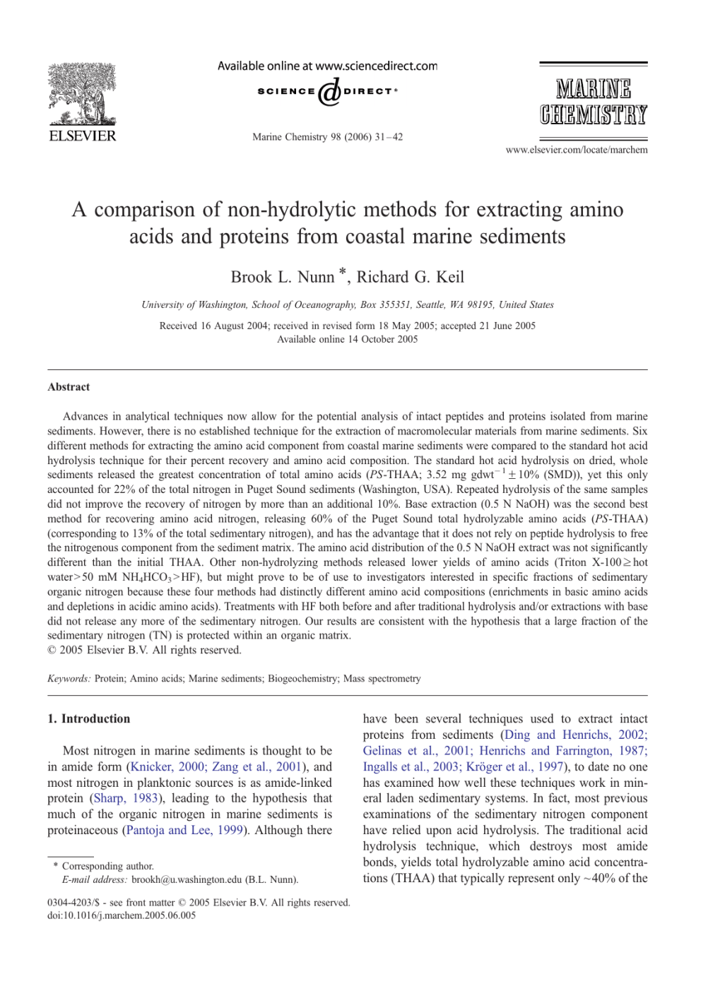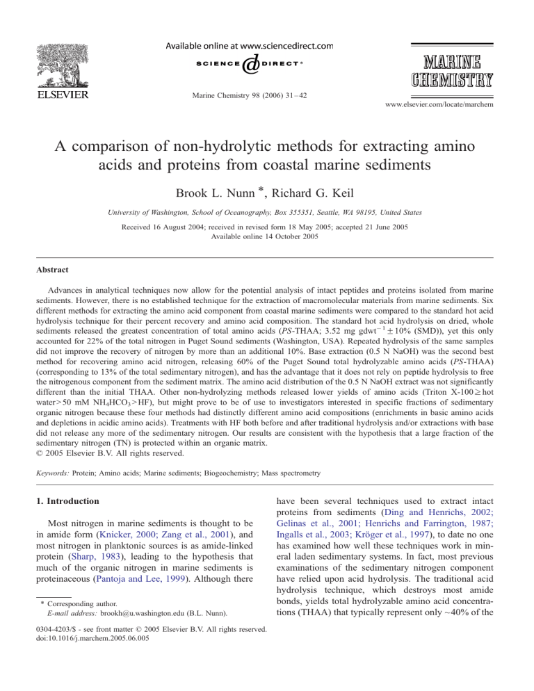 Marine Chemistry 98 (2006) 31 – 42 www.elsevier.com/locate/marchem A comparison of non-hydrolytic methods for extracting amino acids and proteins from coastal marine sediments Brook L. Nunn *, Richard G. Keil University of Washington, School of Oceanography, Box 355351, Seattle, WA 98195, United States Received 16 August 2004; received in revised form 18 May 2005; accepted 21 June 2005 Available online 14 October 2005 Abstract Advances in analytical techniques now allow for the potential analysis of intact peptides and proteins isolated from marine sediments. However, there is no established technique for the extraction of macromolecular materials from marine sediments. Six different methods for extracting the amino acid component from coastal marine sediments were compared to the standard hot acid hydrolysis technique for their percent recovery and amino acid composition. The standard hot acid hydrolysis on dried, whole sediments released the greatest concentration of total amino acids (PS-THAA; 3.52 mg gdwt 1 F10% (SMD)), yet this only accounted for 22% of the total nitrogen in Puget Sound sediments (Washington, USA). Repeated hydrolysis of the same samples did not improve the recovery of nitrogen by more than an additional 10%. Base extraction (0.5 N NaOH) was the second best method for recovering amino acid nitrogen, releasing 60% of the Puget Sound total hydrolyzable amino acids (PS-THAA) (corresponding to 13% of the total sedimentary nitrogen), and has the advantage that it does not rely on peptide hydrolysis to free the nitrogenous component from the sediment matrix. The amino acid distribution of the 0.5 N NaOH extract was not significantly different than the initial THAA. Other non-hydrolyzing methods released lower yields of amino acids (Triton X-100 z hot water N 50 mM NH4HCO3 N HF), but might prove to be of use to investigators interested in specific fractions of sedimentary organic nitrogen because these four methods had distinctly different amino acid compositions (enrichments in basic amino acids and depletions in acidic amino acids). Treatments with HF both before and after traditional hydrolysis and/or extractions with base did not release any more of the sedimentary nitrogen. Our results are consistent with the hypothesis that a large fraction of the sedimentary nitrogen (TN) is protected within an organic matrix. D 2005 Elsevier B.V. All rights reserved. Keywords: Protein; Amino acids; Marine sediments; Biogeochemistry; Mass spectrometry 1. Introduction Most nitrogen in marine sediments is thought to be in amide form (Knicker, 2000; Zang et al., 2001), and most nitrogen in planktonic sources is as amide-linked protein (Sharp, 1983), leading to the hypothesis that much of the organic nitrogen in marine sediments is proteinaceous (Pantoja and Lee, 1999). Although there * Corresponding author. E-mail address: [email protected] (B.L. Nunn). 0304-4203/$ - see front matter D 2005 Elsevier B.V. All rights reserved. doi:10.1016/j.marchem.2005.06.005 have been several techniques used to extract intact proteins from sediments (Ding and Henrichs, 2002; Gelinas et al., 2001; Henrichs and Farrington, 1987; Ingalls et al., 2003; Kröger et al., 1997), to date no one has examined how well these techniques work in mineral laden sedimentary systems. In fact, most previous examinations of the sedimentary nitrogen component have relied upon acid hydrolysis. The traditional acid hydrolysis technique, which destroys most amide bonds, yields total hydrolyzable amino acid concentrations (THAA) that typically represent only ~ 40% of the 32 B.L. Nunn, R.G. Keil / Marine Chemistry 98 (2006) 31–42 sedimentary nitrogen (Keil et al., 2000). Thus, the most efficient approach for extracting organic nitrogen from sediments yields less than half the parent material and destroys information about source. This renders acid hydrolysis unacceptable as an isolation tool prior to evaluation of sedimentary organic nitrogen using advanced macromolecular analytical techniques such as gel electrophoresis or mass spectroscopy (Nunn et al., 2003; Ostrom et al., 2000). Alkali extractions are the most commonly employed methods for solubilizing organic matter by sediment geochemists (Henrichs and Sugai, 1993; Mayer et al., 1986; Pantoja and Lee, 1999), however several other methods have also been explored. Nguyen and Harvey (1998) modified a one-step alkali extraction by first precipitating the proteins and rinsing away smaller, soluble organic matter. Heating sediments in distilled water and dilute detergents can also be used to solubilize particulate proteins (Ding and Henrichs, 2002; Henrichs and Farrington, 1987; Keil and Fogel, 2001) and prevent them from aggregation or adsorption to tubes, membranes, or other surfaces (Gharahdaghi et al., 1994; Rosinke et al., 1995). A distinctly different approach is to use hydrofluoric acid (HF) to isolate organic matter by dissolving the mineral matrix (Bremner and Harada, 1959; Gelinas et al., 2001). This method also has the potential to release specific proteins bound within or trapped in silica or opaline cell walls (e.g., Ingalls et al., 2003; King, 1974; Kroger et al., 1997). Of the methods examined, 0.5 N NaOH was the most efficient method for releasing amino acids, and it released a THAA with an amino acid signature very similar to whole sediment acid hydrolysis. In this manuscript we evaluate six extraction techniques designed to remove nitrogen based organic matter from sediments, and we compared resultant nitrogen and amino acid yields to the standard acid hydrolysis method. Because we are interested in the eventual analysis of unhydrolyzed sedimentary proteins, we only examine dsoftT extraction methods that maintain the integrity of the macromolecules. The methods we test include procedures frequently used for determining surfactant-soluble proteins (Cumming and Iceton, 2001), base-soluble proteins (Henrichs and Sugai, 1993), proteins N 2 kDa (Nguyen and Harv