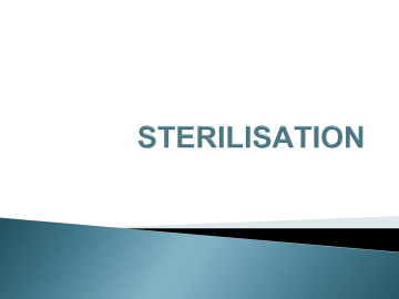 Early civilizations practiced salting, smoking, pickling, drying, and exposure of food and clothing to sunlight to control microbial growth. Use of spices in cooking was to mask taste of spoiled food. Some spices prevented spoilage. Low water content or low pH prevents microorganisms multiplying In mid 1800s Semmelweiss and Lister developed aseptic techniques to prevent contamination of surgical wounds. • Nosocomial infections caused death in 10% of surgeries. • Up to 25% mothers delivering in hospitals died due to infection Practices, emphasizes the importance of washing hands with chlorinated water in Obstetrics to reduce maternal mortality 1867 –Dr.Joseph Lister first identifies airborne bacteria and used Carbolic acid spray in surgical areas 1880 – Johnson and Johnson introduce antiseptic surgical dressings. Lister era 1868 changed the concept of safe surgical procedures. Carbolic Acid in decontamination caused Reduction of Hospital associated infections Mortality reduced Morbidity reduced. Laboratory work with pure cultures requires the use of apparatus and culture media that is sterile Prevention of infection in patients requires the use of equipment, instruments, dressings and parenteral drugs that are free from living micro-organisms Sterilization is the process of killing all the microorganisms in all its forms inclusive of bacterial endospores in a preparation/article such as lab media, surgical instruments and equipment. A sterile environment is free of life of every kind. Disinfection: Reducing the number of pathogenic microorganisms to the point where they no longer cause diseases. Usually involves the removal of vegetative or nonendospore forming pathogens. May use physical or chemical methods. Fumigation: Process of disinfection by fumes of vaporized germicide Sepsis: Comes from Greek for decay or putrid. Indicates bacterial contamination. Asepsis: Absence of significant contamination. Aseptic techniques are used to prevent contamination during surgery. prevent bacterial contamination in food industry ANTISEPSIS: Is the prevention of infection by inhibiting the growth of bacteria. ANTISEPTICS: Chemical disinfectants which can safely be applied to skin or mucus membranes to prevent infection. CONTAMINATION: Soiling of an article, food or water with microbes by contact is known as soiling. DECONTAMINATION: Soil-removing process which removes many of microbes Disinfectant: Applied to inanimate objects. Antiseptic: Applied to living tissue (antisepsis). Degerming: Mechanical removal of most microbes in a limited area. Sanitization: Use of chemical agent to reduce the microbes to minimize chances of disease transmission. Eg: Hot water & soap Bacteriostatic Agent: An agent that inhibits the growth of bacteria, but does not necessarily kill them Germicide: An agent that kills certain microorganisms. Bactericide: An agent that kills bacteria. Most do not kill endospores. Viricide: An agent that inactivates viruses. Fungicide: An agent that kills fungi. Sporicide: An agent that kills bacterial endospores & fungal spores. CLASSIFICATION: A. PHYSICAL AGENTS: 1. SUNLIGHT 2. DRYING 3. HEAT A. Dry Heat (a) Red heat. (b) Flaming. (c) Incineration. (d) Hot Air Oven. B. Moist Heat (a) (b) (c) (d) : Temperature below 1000C. Pasteurization. Inspissation. Temperature at 1000 C: Ex: Boiling Steam under normal pressure. Ex: Tyndallization Steam under pressure. Ex: Autoclave 2. FILTRATION. (A) Candle filters. (B) Asbestos pads (Seitz filter) (C) Sintered glass filter. (D) Collodion or membrane filters. (E) HEPA filters. 3. RADIATION. 4. ULTRASONIC AND SONIC VIBRATIONS. B)CHEMICAL AGENTS: 1) Alcohols 2) Aldehydes 3) Gases 4) Halogens. 5) Phenols 6) Dyes 7) Surface active agents. 8) Metallic salts. D.value (Decimal reduction value): Dose required to inactivate 90 % of the initial microbial population. This varies with different species. Escherichia coli : Few minutes. Salmonella spp :One hour. At 700 C Staphylococcus aureus : One minute. S. epidermidis : Three minute. Damage of DNA Protein denaturation Disruption of cell membrane or cell wall Chemical antagonism Removal of free sulfa hydryl group Factors influencing the death of microbes. 1. Number of Microbes: The more microbes present, the more time it takes to eliminate population. 2. Type of Microbes: Endospores are very difficult to destroy. Vegetative pathogens vary widely in susceptibility to different methods of microbial control. 3. Environmental influences: Presence of organic material (blood, feces, saliva) tends to inhibit antimicrobials, pH etc. 4. Time of Exposure: Chemical antimicrobials and radiation treatments are more effective at longer times. In heat treatments, longer exposure compensates for lower temperatures. Heat: Kills microorganisms by denaturing their enzymes and other proteins. Heat resistance varies widely among microbes. Thermal Death Point (TDP): Lowest temperature at which all of the microbes in a liquid suspension will be killed in ten minutes. Thermal Death Time (TDT): Minimal length of time in which all bacteria will be killed at a given temperature. Decimal Reduction Time (DRT): Time in minutes at which 90% of bacteria at a given temperature will be killed. Spontaneous sterilisation in natural environment Due to UV rays and heat rays Moisture is essential for growth of bacteria Deleterious effect on many bacteria Unreliable method No effect on spores Flaming Red heat Incineration Hot air oven Dry Heat: Kills by protein and enzyme denaturation, oxidation & toxic effect of elevated levels of electrolytes. Flaming glass slides, mouth of the culture bottles Red heat inoculating loops and needles. Heat metal until it has a red glow Incineration: Effective way to sterilize disposable items and biological waste. Red Heat: 1. • Instant method of sterilization. • The articles to be sterilized are held in Bunsen flame till they become red hot. • Ex : Inoculating wires, Tips of forceps, Scalpels, Searing spa