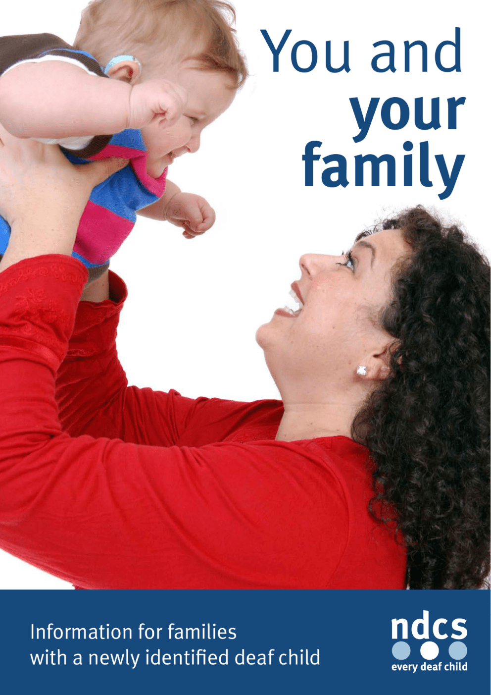 You and your family Information for families with a newly identified deaf child Our vision is of a world without barriers for every deaf child. Contents Who is this booklet for? 4 Early days – The first steps 5 Telling others 12 Understanding childhood deafness 14 Hearing technology 16 Communication 17 Play 18 Education 19 Useful equipment 20 Financial support 21 Other people you may meet 22 Questions you may have 28 How can NDCS help you? 29 Useful publications and contacts 30 NDCS uses the word ‘deaf’ to refer to all levels of hearing loss. The information in this publication is also suitable for families whose child has glue ear. 3 r? fo t e l k o o b s i Who is th This booklet can be used by parents and the wider family who have just been given the diagnosis that their child is deaf. It is designed to offer support, information and guidance on what to expect and be aware of in the early stages of diagnosis. It can also be used by professionals who work with families with a deaf child, who will find it useful to refer to during appointments and in a range of different settings. In creating this booklet we worked with families who have shared similar experiences to ensure that the content is accurate and relevant to your needs. Some children who have been diagnosed with a hearing loss may also have additional needs. NDCS works hand in hand with other organisations who can offer support for additional needs to provide similar guidance and support for any concerns or questions around deafness. We understand that this may not be the route you expected. We want you to know that you are not alone and that we will support you on your journey so that you can celebrate and enjoy your child as they grow up. How to use this resource When you’ve been told that your child is deaf you may have lots of questions. This booklet gives you basic information you may want to know when your child is identified as deaf. It also tells you which other organisations you can go to for more information. If you don’t want to think about your child’s deafness right now, put this booklet aside until the time is right for you. This booklet is intended to be used for reference. Some of the information in it will be useful to you now and some when your child is older. So use it as and when you need to and refer also to the NDCS website (www.ndcs.org.uk) and request information through our Freephone Helpline (0808 800 8880) as your child grows and develops. In all sections we’ve referred to other NDCS publications for further information which you may find useful. Some information referred to is available on the internet. If you don’t have access to the internet at home or at work, you should be able to get access to it through a local library or at an internet cafe. You could also ask family, friends or your child’s Teacher of the Deaf to print out the information. 4 ps t ste s r fi e h T – s rly day Ea For some families when they are told their child is deaf, the news can come as a great shock. Some parents will be upset by the news, others will be relieved that their suspicions have finally been confirmed. Some deaf parents may feel confident in the knowledge that they can share their culture and experience with their child. You will have your own reactions. There is no right or wrong way to feel. Parents may spend time in the initial period identifying what steps they will need to make to support themselves and their deaf child. It can be difficult to remember all the information. Don’t be afraid to go back and ask questions when you have had time to think. “I needed to understand what this hearing loss was and how his ears were damaged. I needed to know that it wasn’t my fault and what my options were. When I got the information I started to focus on the important things like communication and not on who to blame.” It is important to know that you are not alone. A wide range of support is available, whether this comes from family and friends, your local community, services for deaf children, voluntary organisations or other parents of deaf children. If your child has other disabilities or illnesses, you may already be in touch with other professionals and organisations. 5 Your feelings It is important that you take time to look after yourself and, more importantly, acknowledge how you are feeling. Your own health is vitally important. The birth of a new baby brings with it a combination of emotions. This can be equally true for parents when they discover that their child is deaf. For instance, grief is a healthy reaction to loss and the strength of your reaction depends on how big the loss seems to you. Parents have also talked about having the following reactions: > > > > > > > > > > > 6 Surprise Anger Confusion Fear Grief Sadness Comfort Relief Denial Shock Disbelief. You may feel one or many of these reactions or emotions strongly. Sometimes you may jump from one to another through the course of a day. “I never thought for a minute that she might be deaf. I felt so guilty that I might have caused it.” “At the initial diagnosis I had a terrible fear of feeling powerless. Sadness lingers, yet since the diagnosis as a family we’ve grown stronger and are committed to ensuring only the best for our child.” Having a deaf child may mean that you have some extra things to learn about, but don’t worry if you have no experience of deafness. There will be plenty of opportunities for you to find out what you need to know. “The audiologist talked to us for a while. I have to admit that I didn’t hear a single thing after the word ‘deaf’. They were really good though and I went back to see them the next day and they explained everything again.” Learning to accept your child’s deafness is a process that you will go through at your own pace. For some people this process is quick, for others it takes longer. Whatever you are feeling is normal – there is no right or wrong way 