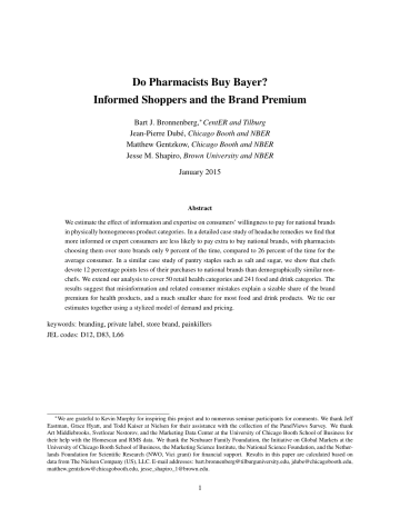 Do Pharmacists Buy Bayer? Informed Shoppers and the Brand Premium Bart J. Bronnenberg,∗ CentER and Tilburg Jean-Pierre Dubé, Chicago Booth and NBER Matthew Gentzkow, Chicago Booth and NBER Jesse M. Shapiro, Brown University and NBER January 2015 Abstract We estimate the effect of information and expertise on consumers’ willingness to pay for national brands in physically homogeneous product categories. In a detailed case study of headache remedies we find that more informed or expert consumers are less likely to pay extra to buy national brands, with pharmacists choosing them over store brands only 9 percent of the time, compared to 26 percent of the time for the average consumer. In a similar case study of pantry staples such as salt and sugar, we show that chefs devote 12 percentage points less of their purchases to national brands than demographically similar nonchefs. We extend our analysis to cover 50 retail health categories and 241 food and drink categories. The results suggest that misinformation and related consumer mistakes explain a sizable share of the brand premium for health products, and a much smaller share for most food and drink products. We tie our estimates together using a stylized model of demand and pricing. keywords: branding, private label, store brand, painkillers JEL codes: D12, D83, L66 ∗ We are grateful to Kevin Murphy for inspiring this project and to numerous seminar participants for comments. We thank Jeff Eastman, Grace Hyatt, and Todd Kaiser at Nielsen for their assistance with the collection of the PanelViews Survey. We thank Art Middlebrooks, Svetlozar Nestorov, and the Marketing Data Center at the University of Chicago Booth School of Business for their help with the Homescan and RMS data. We thank the Neubauer Family Foundation, the Initiative on Global Markets at the University of Chicago Booth School of Business, the Marketing Science Institute, the National Science Foundation, and the Netherlands Foundation for Scientific Research (NWO, Vici grant) for financial support. Results in this paper are calculated based on data from The Nielsen Company (US), LLC. E-mail addresses: [email protected], [email protected], [email protected], [email protected]. 1 1 Introduction A 100-tablet package of 325mg Bayer Aspirin costs $6.29 at cvs.com. A 100-tablet package of 325mg CVS store-brand aspirin costs $1.99 (CVS 2013). The two brands share the same dosage, directions, and active ingredient. Aspirin has been sold in the United States for more than 100 years, CVS explicitly directs consumers to compare Bayer to the CVS alternative, and CVS is one of the the largest pharmacy chains in the country, with presumably little incentive to sell a faulty product. Yet the prevailing prices are evidence that some consumers are willing to pay a three-fold premium to buy Bayer.1 This is not an isolated case. In our data (described in more detail below), we find that consumers would spend $44 billion less per year on consumer packaged goods (CPG) if they switched from a national brand to a store-brand alternative whenever possible. Prior work documents substantial brand price premia in a wide range of non-CPG categories, such as automobiles (Sullivan 1998), index funds (Hortaçsu and Syverson 2004), and online books (Smith and Brynjolfsson 2001). Economists have long debated the origins of brand premia. On the one hand, national brands may offer superior quality or reliability,2 or may deliver direct utility benefits (Becker and Murphy 1993). On the other hand, consumers may be willing to pay a premium for brands because they overestimate the benefits of the brand, or are otherwise confused or misled.3 Determining which story holds is important for evaluating the efficiency of consumer goods markets and the welfare effects of advertising, and may be relevant to policy decisions in consumer protection and regulation. In this paper, we seek to separate these stories by asking how the propensity to buy CPG brands varies with consumer information and expertise. We introduce a novel database that matches household purchase data from the 2004-2011 Nielsen Homescan panel to a new survey containing direct measures of consumer product knowledge, as well as three broader proxies: completed schooling, college major, and occupation. 1 Indeed, in our data (described in more detail below), 25 percent of aspirin sales by volume (and 60 percent by expenditure) are to national-brand products. 2 In one instance, the FDA determined that a generic antidepressant performed less well than its branded counterpart, likely due to differences in their “extended release” coatings (Thomas 2012). A widely publicized recall of store-brand acetaminophen in 2006 resulted from the discovery that some pills could contain metal fragments (Associated Press 2006); such risks could conceivably be lower for national brands. Hortaçsu and Syverson (2004) conclude that purchases of high-cost “brand name” index funds partly reflect willingness to pay for non-financial objective attributes such as tax exposure and the number of other funds in the same family. 3 Braithwaite (1928) writes that advertisements “exaggerate the uses and merits” of national brands, citing aspirin and soap flakes as examples. Simons (1948) advocates government regulation of advertising to help mitigate “the uninformed consumer’s rational disposition to ‘play safe’ by buying recognized, national brands” (p. 247). Scherer (1970) discusses premium prices for national-brand drugs and bleach, and writes that “it is hard to avoid concluding that if the housewife-consumer were informed about the merits of alternative products by some medium more objective than advertising and other image-enhancing devices, her readiness to pay price premiums as large as those observed here would be attenuated” (pp. 329-332). More recently, a growing body of theoretical work considers markets with uninformed or manipulable consumers