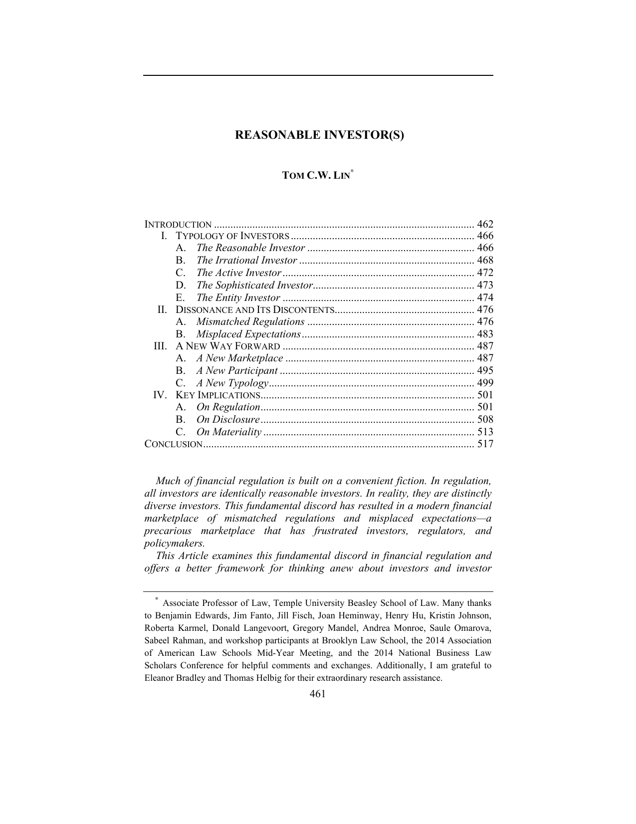 REASONABLE INVESTOR(S) TOM C.W. LIN∗ INTRODUCTION ............................................................................................... 462 I. TYPOLOGY OF INVESTORS ................................................................... 466 A. The Reasonable Investor ............................................................. 466 B. The Irrational Investor ................................................................ 468 C. The Active Investor ...................................................................... 472 D. The Sophisticated Investor........................................................... 473 E. The Entity Investor ...................................................................... 474 II. DISSONANCE AND ITS DISCONTENTS................................................... 476 A. Mismatched Regulations ............................................................. 476 B. Misplaced Expectations ............................................................... 483 III. A NEW WAY FORWARD ...................................................................... 487 A. A New Marketplace ..................................................................... 487 B. A New Participant ....................................................................... 495 C. A New Typology........................................................................... 499 IV. KEY IMPLICATIONS.............................................................................. 501 A. On Regulation.............................................................................. 501 B. On Disclosure .............................................................................. 508 C. On Materiality ............................................................................. 513 CONCLUSION................................................................................................... 517 Much of financial regulation is built on a convenient fiction. In regulation, all investors are identically reasonable investors. In reality, they are distinctly diverse investors. This fundamental discord has resulted in a modern financial marketplace of mismatched regulations and misplaced expectations—a precarious marketplace that has frustrated investors, regulators, and policymakers. This Article examines this fundamental discord in financial regulation and offers a better framework for thinking anew about investors and investor ∗ Associate Professor of Law, Temple University Beasley School of Law. Many thanks to Benjamin Edwards, Jim Fanto, Jill Fisch, Joan Heminway, Henry Hu, Kristin Johnson, Roberta Karmel, Donald Langevoort, Gregory Mandel, Andrea Monroe, Saule Omarova, Sabeel Rahman, and workshop participants at Brooklyn Law School, the 2014 Association of American Law Schools Mid-Year Meeting, and the 2014 National Business Law Scholars Conference for helpful comments and exchanges. Additionally, I am grateful to Eleanor Bradley and Thomas Helbig for their extraordinary research assistance. 461 462 BOSTON UNIVERSITY LAW REVIEW [Vol. 95:461 protection. This Article presents an original typology of heterogeneous investors that exposes the common regulatory fallacy of homogeneous investors. It explains that the simple paradigm of perfectly reasonable investors, while profoundly seductive, is an inadequate foundation for designing investor protection policies in a complex, contemporary marketplace. It demonstrates how this critical divergence has harmed investors and regulators in the modern, high-tech marketplace. To begin addressing such harms, this Article advocates for a novel algorithmic investor typology as an important step towards better reconciling financial regulation with financial reality. Specifically, it illustrates how core concepts of financial regulation like regulatory design, disclosure, and materiality can pragmatically improve as a result of the new typology. This Article ultimately argues that in order to better protect all investors, financial regulation must shift from an elegantly false, singular view of reasonable investors towards a more honest, pluralistic view of diverse investors—from protecting one type of reasonable investors to protecting all types of reasonable investors. INTRODUCTION Investors exist everywhere, in every form.1 They reside in big cities and small towns, in magnificent mansions and modest apartments. They are famous as well as anonymous. They are financiers and farmers, old retirees and new workers, homemakers and fund managers, public employees and private entrepreneurs, sole proprietorships and partnerships, people and corporations. Yet for all their diversity, financial regulation frequently treats them monolithically as “the reasonable investor.”2 1 See U.S. CENSUS BUREAU, THE 2012 STATISTICAL ABSTRACT 746 tbl.1201 (2013), available at http://www.census.gov/compendia/statab/2012/tables/12s1201.pdf, archived at http://perma.cc/J3XA-TC8V (charting the heterogeneity of investors); Stephen M. Bainbridge, Mandatory Disclosure: A Behavioral Analysis, 68 U. CIN. L. REV. 1023, 105152 (2000) (stating that the U.S. capital markets consist of investors that are ethnically diverse, geographically dispersed, and of varying wealth); William W. Bratton, Shareholder Value and Auditor Independence, 53 DUKE L.J. 439, 445 (2003) (finding that equity investors are diverse and fragmented into multiple classifications such as “speculators, investors, short-term holders, long-term holders, noise traders, fundamental value investors, dumb money, and smart money”); Usha Rodrigues, Corporate Governance in an Age of Separation of Ownership from Ownership, 95 MINN. L. REV. 1822, 1828 (2011) (“[I]nvestors come in different shapes and sizes.”). 2 See, e.g., In re Merck & Co. Sec. Litig., 432 F.3d 261, 274 (3d Cir. 2005) (“‘[R]easonable investors’ are the market.”); Sec. & Exch. Comm’n v. Tex. Gulf Sulphur Co., 401 F.2d 833, 849 (2d Cir. 1968) (“The speculator
