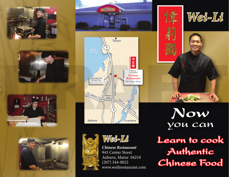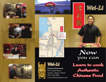 Wei-Li Turner DRAFT 4 Ave Auburn Mall iver in R ogg urn Ve te rosc Aub 945 Center Street t er S Tur n Mt Chinese Restaurant Center Street 990 Center Street • tree EMERSON TOYOTA ra 4 Auburn ns M And Lake Auburn em or ial Br g Lewiston Wei-Li Chinese Restaurant 945 Center Street Auburn, Maine 04210 (207) 344-0022 www.weilirestaurant.com Now you can Learn to cook Authentic Chinese Food Wei Li invites you to deepen your appreciation and knowledge of Chinese cuisine through our new series of on-site cooking classes: Basic Intermediate Advanced This three-hour session provides an introduction to the philosophies and techniques which define a true Chinese kitchen. Discussed will be: Note: Completion of the Basic class is required in order to participate in the Intermediate level Prerequisite: the Basic class and at least one of the Intermediate sessions Designed for either working professionals who would like to broaden their credentials or home-cooking enthusiasts eager to learn new skills, this three month course will cover everything from managing the kitchen effectively to presenting dishes with eye-appeal. The instructor will have you whipping up batters, filling egg rolls, stuffing dumplings and even rolling sushi by the end of the course. Lots of one-onone attention; class limited to 5 students. DRAFT • Rice: the 4 different types, and traditional cooking method vs. rice-cooker • The whys-and-wherefores of cooking sauces vs. MSG • How to handle a chopping knife safely and effectively • How to stir fry using a wok • The difference between authentic traditional Chinese and “Chinese-American” cooking End of Class Bonus Optional: Learn to speak Cantonese through an informal half-hour lesson with a native speaker. Pick-and-choose from a series of monthly classes where you will learn to prepare a variety of basic dishes such as lo mien, fried rice, hot & sour soup, and chicken & broccoli. These sessions are 10% lecture, 90% hands-on – with the instructor guiding you through each step. Topics to be covered: • • • • Where to buy ingredients Vegetables: best practices in slicing & dicing How to mix sauces, from mild to spicy Szechuan The assembling and cooking of dishes For more information on any of these cooking class offerings, please go to www.weilirestaurant.com and click on the Cooking Classes icon.